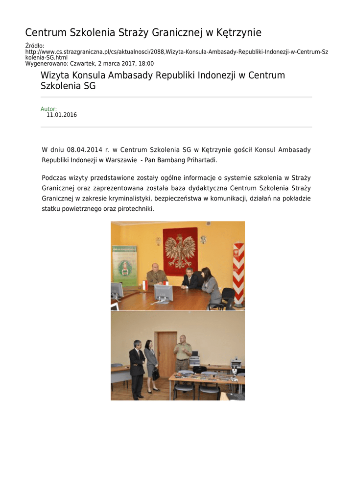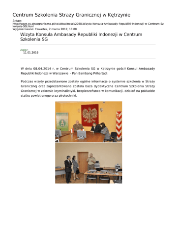 Centrum Szkolenia Straży Granicznej w Kętrzynie Źródło: http://www.cs.strazgraniczna.pl/cs/aktualnosci/2088,Wizyta-Konsula-Ambasady-Republiki-Indonezji-w-Centrum-Sz kolenia-SG.html Wygenerowano: Czwartek, 2 marca 2017, 18:00 Wizyta Konsula Ambasady Republiki Indonezji w Centrum Szkolenia SG Autor: 11.01.2016 W dniu 08.04.2014 r. w Centrum Szkolenia SG w Kętrzynie gościł Konsul Ambasady Republiki Indonezji w Warszawie - Pan Bambang Prihartadi. Podczas wizyty przedstawione zostały ogólne informacje o systemie szkolenia w Straży Granicznej oraz zaprezentowana została baza dydaktyczna Centrum Szkolenia Straży Granicznej w zakresie kryminalistyki, bezpieczeństwa w komunikacji, działań na pokładzie statku powietrznego oraz pirotechniki.