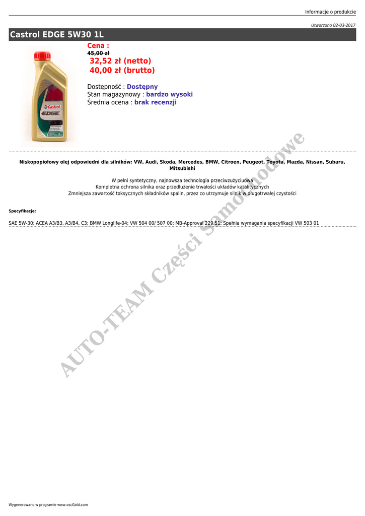 Informacje o produkcie Utworzono 02-03-2017 Castrol EDGE 5W30 1L Cena : 45,00 zł 32,52 zł (netto) 40,00 zł (brutto) do w e Dostępność : Dostępny Stan magazynowy : bardzo wysoki Średnia ocena : brak recenzji ho Niskopopiołowy olej odpowiedni dla silników: VW, Audi, Skoda, Mercedes, BMW, Citroen, Peugeot, Toyota, Mazda, Nissan, Subaru, Mitsubishi m oc W pełni syntetyczny, najnowsza technologia przeciwzużyciuowa Kompletna ochrona silnika oraz przedłużenie trwałości układów katalitycznych Zmniejsza zawartość toksycznych składników spalin, przez co utrzymuje silnik w długotrwałej czystości Specyfikacje: AU TO -T E AM C zę ś ci Sa SAE 5W-30; ACEA A3/B3, A3/B4, C3; BMW Longlife-04; VW 504 00/ 507 00; MB-Approval 229.51; Spełnia wymagania specyfikacji VW 503 01 Wygenerowano w programie www.oscGold.com