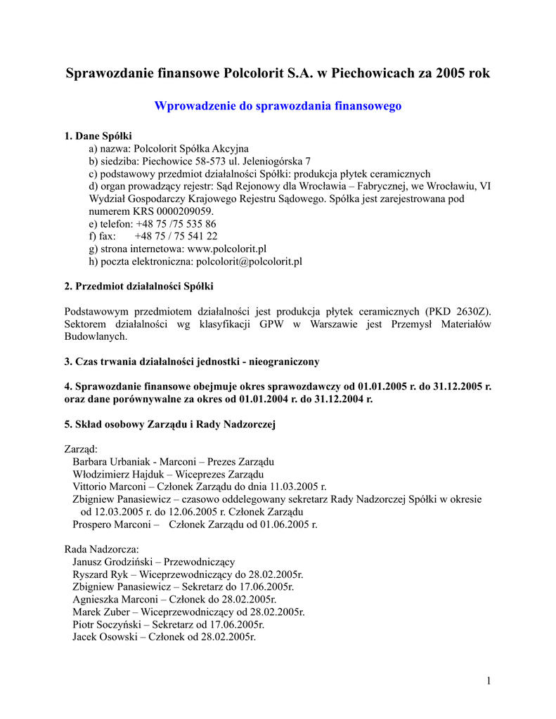 Sprawozdanie finansowe Polcolorit S.A. w Piechowicach za 2005 rok Wprowadzenie do sprawozdania finansowego 1. Dane Spółki a) nazwa: Polcolorit Spółka Akcyjna b) siedziba: Piechowice 58-573 ul. Jeleniogórska 7 c) podstawowy przedmiot działalności Spółki: produkcja płytek ceramicznych d) organ prowadzący rejestr: Sąd Rejonowy dla Wrocławia – Fabrycznej, we Wrocławiu, VI Wydział Gospodarczy Krajowego Rejestru Sądowego. Spółka jest zarejestrowana pod numerem KRS 0000209059. e) telefon: +48 75 /75 535 86 f) fax: +48 75 / 75 541 22 g) strona internetowa: www.polcolorit.pl h) poczta elektroniczna: [email protected] 2. Przedmiot działalności Spółki Podstawowym przedmiotem działalności jest produkcja płytek ceramicznych (PKD 2630Z). Sektorem działalności wg klasyfikacji GPW w Warszawie jest Przemysł Materiałów Budowlanych. 3. Czas trwania działalności jednostki - nieograniczony 4. Sprawozdanie finansowe obejmuje okres sprawozdawczy od 01.01.2005 r. do 31.12.2005 r. oraz dane porównywalne za okres od 01.01.2004 r. do 31.12.2004 r. 5. Skład osobowy Zarządu i Rady Nadzorczej Zarząd: Barbara Urbaniak - Marconi – Prezes Zarządu Włodzimierz Hajduk – Wiceprezes Zarządu Vittorio Marconi – Członek Zarządu do dnia 11.03.2005 r. Zbigniew Panasiewicz – czasowo oddelegowany sekretarz Rady Nadzorczej Spółki w okresie od 12.03.2005 r. do 12.06.2005 r. Członek Zarządu Prospero Marconi – Członek Zarządu od 01.06.2005 r. Rada Nadzorcza: Janusz Grodziński – Przewodniczący Ryszard Ryk – Wiceprzewodniczący do 28.02.2005r. Zbigniew Panasiewicz – Sekretarz do 17.06.2005r. Agnieszka Marconi – Członek do 28.02.2005r. Marek Zuber – Wiceprzewodniczący od 28.02.2005r. Piotr Soczyński – Sekretarz od 17.06.2005r. Jacek Osowski – Członek od 28.02.2005r. 1 Wprowadzenie do sprawozdania finansowego Torquato Bonilauri – Członek do 30.12.2005r. Jacek Welc – Członek od 30.12.2005r. 6. W skład Polcolorit S.A. nie wchodzą wewnętrzne jednostki organizacyjne sporządzające samodzielne sprawozdania finansowe 7. Spółka jest jednostką dominującą i sporządza skonsolidowane sprawozdanie finansowe. W skład grupy kapitałowej Polcolorit S.A. wchodzą: • Polcolorit S.A. – jednostka dominująca, • Ceramika Marconi Spółka z o.o. z siedzibą w Piechowicach, ul. Jeleniogórska 7 – jednostka zależna. Spółka posiada 100% udziałów w spółce zależnej Ceramika Marconi Spółka z o.o. 8. Założenie kontynuacji działalności gospodarczej. Sprawozdanie finansowe zostało sporządzone przy założeniu kontynuowania działalności gospodarczej przez Spółkę w okresie 12 miesięcy po dniu bilansowym, czyli po 31 grudnia 2005 roku. Zarząd Spółki nie stwierdza na dzień podpisania sprawozdania finansowego istnienia faktów i okoliczności, które wskazywałyby na zagrożenie dla możliwości kontynuacji działania przez Spółkę w okresie 12 miesięcy po dniu bilansowym na skutek zamierzonego lub przymusowego zaniechania bądź istotnego ograniczenia przez nią dotychczasowej działalności. 9. Sprawozdanie finansowe nie podlegało przekształceniu w celu zapewnienia porównywalności danych. W roku 2005 spółka dokonała zmian zasad rachunkowości, polegających na zmianie sposobu ewidencji rozchodu zapasów materiałów i surowców ze stosowanej dotychczas metody FIFO (pierwsze przyszło – pierwsze wyszło) na metodę stałych cen ewidencyjnych, opartych na standardowym rachunku kosztów. Wpływ tych zmian na sytuację majątkową i finansową, płynność oraz wynik finansowy i rentowność spółki jest nieistotny, ze względu na fakt wysokiej zmienności kosztów produkcyjnych spółki, co powoduje, iż powstające odchylenia kosztów rzeczywistych od kosztów ewidencyjnych, znajdują się na nieznacznym poziomie. Mimo dołożenia należytej staranności nie jest możliwe wskazanie wiarygodnych różnic w wartości ujawnionych danych. 10. W niniejszym sprawozdaniu finansowym, jak również w porównywalnych danych finansowych nie dokonywano korekt wynikających z zastrzeżeń w opiniach podmiotów uprawnionych do badania sprawozdań finansowych. 11. Sprawozdanie finansowe sporządzone zostało na podstawie ksiąg rachunkowych prowadzonych zgodnie z dokumentacją przyjętych zasad rachunkowości : a) rok obrotowy = 2005 okres sprawozdawczy = 01.01.- 31.12.2005 roku. b) zakładowe zasady wyceny aktywów i pasywów oraz ustalania wyniku finansowego, 2 Wprowadzenie do sprawozdania finansowego c) zasady prowadzenia ksiąg rachunkowych w tym zakładowy plan kont , d) wykaz ksiąg rachunkowych, e) dokumentacja systemu przetwarzania danych, f) system ochrony danych i ich zbiorów. g) wzór sprawozdania finansowego zawierający: bilans, rachunek zysków i strat w wersji porównawczej ,rachunek przepływów pieniężnych w wersji pośredniej w sposób zgodny w szczególności z postanowieniami ustawy o rachunkowości. 12. Wykazane w bilansie na dzień bilansowy aktywa i pasywa wyceniono następującymi metodami wyceny wynikającymi z przyjętych zasad rachunkowości: Wartości niematerialne i prawne wyceniane są według cen nabycia pomniejszonych o dotychczasowe umorzenie. Odpisy amortyzacyjne wartości niematerialnych i prawnych dokonywane są liniowo przez przewidywany okres uzyskiwania z nich korzyści, przy zastosowaniu następujących stawek amortyzacyjnych: Oprogramowanie komputerowe – 50% Środki trwałe są wyceniane według cen nabycia, kosztu wytworzenia, pomniejszonej o dotychczasowe umorzenie. Środki trwałe o wartości początkowej przekraczającej 3.500 złotych są amortyzowane przez okres ich przewidywanego użytkowania przy zastosowaniu metody liniowej, z wyłączeniem środków trwałych zaliczonych do grupy 3-8, które są amortyzowane metoda degresywną przy zastosowaniu współczynnika 2,0. Spółka stosuje następujące stawki podatkowe dla poszczególnych grup: Budynki i budowle (2,5; 3; 4; 4,5; 4,8; 8) Urządzenia t