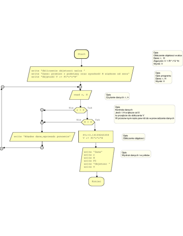 Opis Obliczenie objetosci w alca Dane: r, H Algorytm: V = PI * r^2 *H Wynik: V Start write 'Obliczenie objetosci walca ' write 'Dane: promien r podstawy oraz wysokość H większe od zera' write 'Objętość V := PI*r*r*H' Opis Czytanie danych: r, H read r, H Nie Tak r > 0 Nie Tak Opis Kontrola danych Jesli r i H w iększe od 0 to przejście do obliczenia V W przeciw nym razie pow rót do w prow adzania danych H > 0 write 'Błędne dane,wprowadz ponownie' PI:=3.14159265359 V := PI*r*r*H write write write write write write Opis Opis programu Dane: r, H Wynik: V 'Dane' r H PI 'Objetosc ' V Koniec Opis Obliczenie objętosci Opis Wydruk danych i w yników
