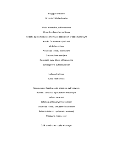 Przyjęcie weselne W cenie 190 zł od osoby Woda mineralna, soki owocowe Aksamitny krem borowikowy Roladka z polędwicy wieprzowej ze szpinakiem w sosie kurkowym Kaczka faszerowana jabłkami Medalion cielęcy Pieczeń ze schabu ze śliwkami Zrazy wołowe zawijane Ziemniaki, pyzy, kluski półfrancuskie Bukiet jarzyn, bukiet surówek Lody cocktailowe Kawa lub herbata Marynowany łosoś w sosie miodowo‐cytrynowym Rolada z sandacza z paluszkami krabowymi Indyk z owocami Sałatka z grillowanym kurczakiem Kieszeń ze schabu z musem chrzanowym Befsztyk tatarski z polędwicy wołowej Pieczywo, masło, sosy Dzik z rożna w sosie własnym Tort ( smak, dekoracja do uzgodnienia ) Wybór ciast Kompozycja świeżych owoców Barszcz z pasztecikiem lub żurek z jajkiem i kiełbasą Szaszłyk z indyka Golonka peklowana Golonka po bawarsku Pieczywo, musztarda, ketchup