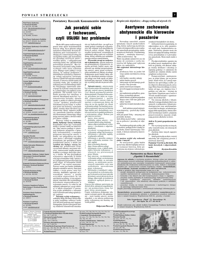 P O W I A T 7 S T R Z E L E C K I Powiatowy Rzecznik Konsumentów informuje Dom Pomocy Spo³ecznej w Strzelcach Opolskie z fili¹ w Szymiszowie tel. 4623845 z fili¹ w Lenicy tel. 4639840, 4639830 Dom Pomocy Spo³ecznej w Kad³ubie tel. 4636337, 4636422, fax 4636744 e-mail: [email protected] Dom Pomocy Spo³ecznej w Zawadzkiem e-mail: [email protected] Zespó³ Szkó³ Ogólnokszta³c¹cych w Strzelcach Opolskich tel. 4612225 nie czy budowali dom - na ogó³ s¹ w dotyczy us³ug. S¹ to g³ównie us³ugi ców lub wskazaæ tych niesolidnych, Czêsto ich nieprawid³owe prowadze- chodzenia praw konsumentów wy- uwadze koniecznoæ ewentualnych uczeniu czy brawurze. Uruchamiamy szczególnie trudna, gdy konsumenci firmê, której siedziba jest niedaleko wszelkie sprawy * przeze mnie spraw konsumenckich remontowo-budowlane. Kwestia do- nikaj¹cych z zamawianych us³ug jest z us³ugodawcami omawiaj¹ ustnie, bez jakichkolwiek Zespó³ Szkó³ Zawodowych nr 1 potwierdzeñ pisemnych . Bez ko- w Strzelcach Op. tel. 4612701 e-mail: [email protected] niecznoci korzystania us³ug trudno wyobraziæ sobie nasze codzienne ¿ycie. Dlatego warto zadbaæ o swoje Zespó³ Szkó³ Zawodowych w Zawadzkiem tel. 4616288, 4616541 e-mail: [email protected] Liceum Ogólnokszta³c¹ce stanie poleciæ rzetelnych wykonaw- których nale¿y omijaæ. Maj¹c na nie samochodu przypisujemy niedomylenie: niedzielny kierowca, naszego miejsca zamieszkania. Zwracanie uwagi na zachowa- nie wykonawców - pewne zachowa- nia potencjalnych wykonawców remontu powinny budziæ nasze w¹t- pliwoci. np. niechêæ zawarcia pisem- nej umowy, opory przed wystawie- interesy, by unikn¹æ problemów z niem rachunku czy faktury za us³ugi. j¹c us³ugê najczêciej zawieramy chêæ do okrelenia terminu wykona- zlecenie. Z umow¹ o dzie³o mamy do kolwiek kary umowne. A tak¿e ¿¹da- realizacji jest co materialnego (dzie- gi. byæ zawarta ustnie lub na pimie, jed- grodzenie. Ten rezultat czyli owo 2 tys. z³otych, powinna byæ potwier- umowie. Rezultatem mo¿e byæ: wy- remontowana ³azienka, upranie spodni w pralni (w efekcie powstaj¹ czyste spodnie), pomalowanie e-mail: [email protected] mieszkania (czyste ciany w wybra- Zespó³ Szkó³ Specjalnych przy DPS zêbów, monta¿ okien lub drzwi (za- tel. 4620046, 4616049, 4620049 e-mail: [email protected] Zespó³ Szkó³ Specjalnych w Strzelcach Opolskich tel. 4612882 Zespó³ Szkó³ Specjalnych przy DPS w Kad³ubie tel. 4636422, 463637 Specjalny Orodek Szkolno-Wycho-wawczy w Lenicy tel. 4615261 e-mail: [email protected] e-mail: [email protected] Samodzielny Publiczny Zak³ad Opieki Zdrowotnej w Strzelcach Opolskich tel. 4613291-95 e-mail: [email protected] Komenda Powiatowa Pañstwowej Stra¿y Po¿arnej w Strzelcach Opolskich gdy umowa zawiera: z wykonaniem us³ugi. Dobrze jest jów umów o dzie³o. * Pierwszy rodzaj to zamawianie * nazwy stron umowy Przyk³adem mo¿e byæ wykonanie * zakres odpowiedzialnoci wyko- dzie³a w postaci mebli na zamówienie. Taka umowa podlega w pierwszej kolejnoci przepisom o sprze- * przepisom dotycz¹cym umowy o * same prawa i obowi¹zki wzglêdem * dzie³o, za us³ugodawca ma takie konsumenta, jak sprzedawca. Je¿eli przedmiotem umowy o dzie³o jest Powiatowa Stacja Sanitarno Epidemiologiczna w Strzelcach Opolskich tel. 4400313 Powiatowy Urz¹d Pracy w Strzelcach Opolskich tel. 4621800 e-mail: [email protected] Wydawca: Starostwo Strzeleckie Redaktor Naczelny: Marta Górka Redaguje Zespó³. Druk: Drukarnia PRO MEDIA 45-125 Opole, ul. Sk³adowa 4, tel. 077/4428008, fax 077/4428009 Redakcja zastrzega sobie prawo do skracania tekstów i adiustacji. Materia³ów nie zamówionych nie zwraca. Nie odpowiada za treæ zamieszczonych reklam i og³oszeñ. nawcy i zwolnienia z odpowiedzialnoci wysokoæ wynagrodzenia za wykonanie us³ugi lub kosztorys informacja o sposobie zap³aty, wyp³acania zaliczek informacja o sposobie ostatecznego rozliczenia, terminie i formie zap³aty data wykonania zlecenia data i forma odbioru us³ugi informacje o tym, z jakich mate- wy o dzie³o. W obu przypadkach przez klienta * wykonawca odpowiada za dzie³o * * * wykonanie us³ugi, za niestaranne wykonanie us³ugi, za zerwanie odebra³ i nie wniós³ zastrze¿eñ. rzonych materia³ów oraz inne umowy, za zniszczenie powie- przez niego, ¿e konsument dzie³o uszkodzenia * spowodowane przez wykonawcê informacja o warunkach i zakre- * Pij odpowiedzialnie- ogranicz siê do jednej porcji standardowej alko- holu na godzinê, rób d³u¿sze odstê- py miedzy drinkami i odczekaj co najmniej godzinê ( w zale¿noci ile wypi³e) po ostatnim drinku zanim usi¹dziesz za kierownic. * robi bardzo szerokie zakrêty Poznaj swój limit zanim poczu- jesz, ¿e jeste pijany, ju¿ na pewno jedzie bardzo powoli jeste. Je¿eli wiesz, ¿e 3 porcje stan- zatrzymuje siê lub hamuje gwa³- dardowe nie spowoduj¹ u ciebie jedzie nierównym tempem nego filmu i kaca moralnego, to nieza- townie i bez powodu ju- tro objawów abstynencyjnych, urwa- dze klina, wymachuje rêkoma jedzie biernie za jakim pojazdem * skrêca ostro i/lub tam gdzie jest * jedzie bez wiate³, kierunkowska- zakaz wjazdu zów Jeli jedziesz przed nietrze- wym kierowc¹ pozwól aby Ciebie godziny czy ca³¹ noc trzymaj siê Twoich mo¿liwociach i ograniczeniach. S£UCHAJ GO. * Nie mieszaj alkoholu z lekami. Alkohol wzmaga dzia³anie leków na- sennych; w po³¹czeniu z lekami psy- chotropowymi oraz antyhistaminowymi (leki na alergie, uczulenia) po- têguje efekt uspokojenia, obni¿a zdol- wymin¹³. noæ koordynacji ruchów; preparaty powiedni dystans. szaj¹ poziom alkoholu we krwi. Jeli jest przed Tob¹ utrzymuj odJeli zbli¿a siê do Ciebie zatrzymaj siê na poboczu i poczekaj a¿ odje- dzie. Powiadom policjê tak szybko, jak to mo¿liwe, podaj¹c kolor i markê sa- mochodu, numer rejestracyjny i kierunek, w którym nietrzewy kierowca zmierza. Co mo¿esz zrobiæ aby uchroniæ * przeciwwrzodowe znacznie zwiêk- Jeli to Ty jeste gospodarzem im- pre