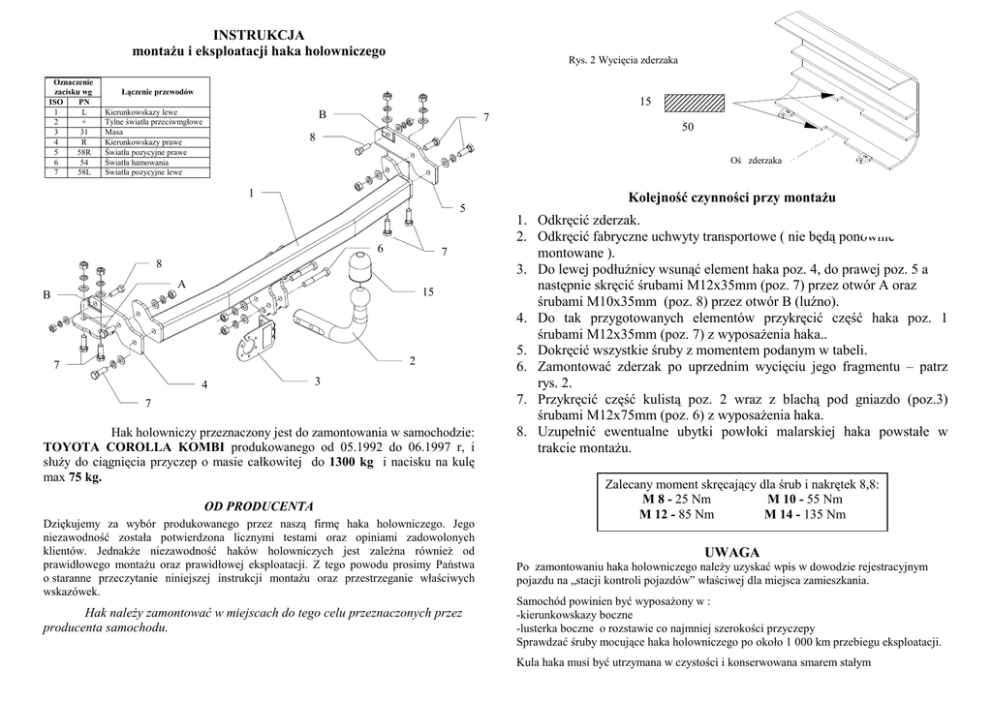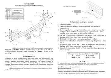 INSTRUKCJA montaŜu i eksploatacji haka holowniczego Oznaczenie zacisku wg ISO PN 1 L 2 + 3 31 4 R 5 58R 6 54 7 58L Rys. 2 Wycięcia zderzaka Łączenie przewodów 15 Kierunkowskazy lewe Tylne światła przeciwmgłowe Masa Kierunkowskazy prawe Światła pozycyjne prawe Światła hamowania Światła pozycyjne lewe B 7 8 50 Oś zderzaka 1 5 6 7 8 A 15 B 2 7 4 3 7 Hak holowniczy przeznaczony jest do zamontowania w samochodzie: TOYOTA COROLLA KOMBI produkowanego od 05.1992 do 06.1997 r, i słuŜy do ciągnięcia przyczep o masie całkowitej do 1300 kg i nacisku na kulę max 75 kg. OD PRODUCENTA Dziękujemy za wybór produkowanego przez naszą firmę haka holowniczego. Jego niezawodność została potwierdzona licznymi testami oraz opiniami zadowolonych klientów. JednakŜe niezawodność haków holowniczych jest zaleŜna równieŜ od prawidłowego montaŜu oraz prawidłowej eksploatacji. Z tego powodu prosimy Państwa o staranne przeczytanie niniejszej instrukcji montaŜu oraz przestrzeganie właściwych wskazówek. Hak naleŜy zamontować w miejscach do tego celu przeznaczonych przez producenta samochodu. Kolejność czynności przy montaŜu 1. Odkręcić zderzak. 2. Odkręcić fabryczne uchwyty transportowe ( nie będą ponownie montowane ). 3. Do lewej podłuŜnicy wsunąć element haka poz. 4, do prawej poz. 5 a następnie skręcić śrubami M12x35mm (poz. 7) przez otwór A oraz śrubami M10x35mm (poz. 8) przez otwór B (luźno). 4. Do tak przygotowanych elementów przykręcić część haka poz. 1 śrubami M12x35mm (poz. 7) z wyposaŜenia haka.. 5. Dokręcić wszystkie śruby z momentem podanym w tabeli. 6. Zamontować zderzak po uprzednim wycięciu jego fragmentu – patrz rys. 2. 7. Przykręcić część kulistą poz. 2 wraz z blachą pod gniazdo (poz.3) śrubami M12x75mm (poz. 6) z wyposaŜenia haka. 8. Uzupełnić ewentualne ubytki powłoki malarskiej haka powstałe w trakcie montaŜu. Zalecany moment skręcający dla śrub i nakrętek 8,8: M 8 - 25 Nm M 10 - 55 Nm M 12 - 85 Nm M 14 - 135 Nm UWAGA Po zamontowaniu haka holowniczego naleŜy uzyskać wpis w dowodzie rejestracyjnym pojazdu na „stacji kontroli pojazdów” właściwej dla miejsca zamieszkania. Samochód powinien być wyposaŜony w : -kierunkowskazy boczne -lusterka boczne o rozstawie co najmniej szerokości przyczepy Sprawdzać śruby mocujące haka holowniczego po około 1 000 km przebiegu eksploatacji. Kula haka musi być utrzymana w czystości i konserwowana smarem stałym WyposaŜenie haka: PPUH AUTO-HAK S.J. Produkcja Haków Holowniczych Henryk & Zbigniew Nejman 76-200 SŁUPSK ul. Słoneczna 16K tel/fax (059) 8-414-414; 8-414-413 e-mail: [email protected] www. autohak.com.pl Hak holowniczy bez wyposaŜenia elektrycznego Klasa: A50-X Nr kat. O31 Przeznaczony do zamontowania w samochodzie: Producent: TOYOTA Model: COROLLA Typ: KOMBI produkowanego od 05.1992 do 06.1997 Dane techniczne: Wartość siły D : 7,6 kN maksymalna masa przyczepy: 1300 kg maksymalny nacisk na kulę: 75 kg Numer homologacji zgodnie z dyrektywą 94/20/WE: e20*94/20*0210*00 KARTA GWARANCYJNA Producent udziela gwarancji niniejszą kartą gwarancyjną na okres 24 miesięcy licząc od dnia zakupu haka holowniczego do samochodu: TOYOTA COROLLA KOMBI produkowanego od 05.1992r. do 06.1997r. Data produkcji .............................. Data zakupu.......................................... Zakres gwarancji obejmuje wyłącznie wady jakościowe wynikające z winy producenta. Gwarancja nie obejmuje natomiast uszkodzeń zawinionych przez nabywcę, wynikających z niewłaściwego montaŜu, uŜytkowania lub konserwacji, uszkodzeń mechanicznych, normalnego zuŜycia podczas eksploatacji itp. Gwarancja udzielona na zakupiony towar nie wyłącza, nie ogranicza ani nie zawiesza uprawnień kupującego wynikających z niezgodności towaru z umową. Reklamacje naleŜy zgłaszać w punkcie sprzedaŜy, składając jednocześnie kartę gwarancyjną. Usunięcie "wady" następuje po stwierdzeniu przez punkt sprzedaŜy wspólnie z producentem słuszności złoŜonej reklamacji. Reklamacja powinna być załatwiona w ciągu 14 dni od dnia uznania reklamacji. Karta gwarancyjna jest niewaŜna jeŜeli nie jest wypełniona i podpisana. Data zgłoszenia reklamacji: ................................................................... INFORMACJA WSTĘPNA Hak holowniczy jest skonstruowany zgodnie z zasadami bezpieczeństwa ruchu drogowego. Hak holowniczy jest elementem wpływającym na bezpieczeństwo jazdy i moŜe zostać zainstalowany wyłącznie przez personel wyspecjalizowany. Niedopuszczalne jest dokonywanie jakichkolwiek zmian w konstrukcji haka. Powoduje to wygaśniecie dopuszczenia do stosowania. W przypadku obecności masy izolacyjnej lub osłony podwozia w miejscu przylegania haka, naleŜy ją usunąć. Nieosłonięte miejsca karoserii oraz wywiercone otwory naleŜy pomalować farbą antykorozyjną. Informacjami wiąŜącymi odnośnie wartości obciąŜeń są dane podawane przez producenta samochodu, względnie wartości maksymalnej masy przyczepy oraz maksymalnego nacisku na kulę, przy czym wartości parametrów haka holowniczego nie mogą być przekroczone. Wzór do obliczania wartości siły D: Maks. masa przyczepy [kg] x Maks. masa samochodu [kg] Maks. masa przyczepy [kg] + Maks. masa samochodu [kg] X 9,81 = 1000 D [kN]