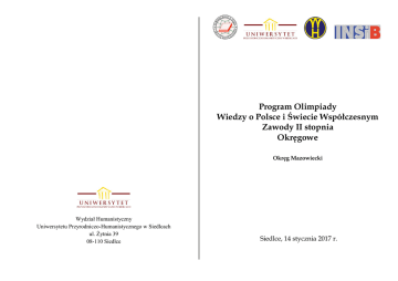 Program Olimpiady Wiedzy o Polsce i Świecie Współczesnym Zawody II stopnia Okręgowe Okręg Mazowiecki Wydział Humanistyczny Uniwersytetu Przyrodniczo-Humanistycznego w Siedlcach ul. Żytnia 39 08-110 Siedlce Siedlce, 14 stycznia 2017 r. 14 stycznia (sobota) Komitet Okręgowy: dr hab. Włodzimierz Fehler, prof. UPH – Przewodniczący Komitetu Okręgowego dr hab. Arkadiusz Indraszczyk, prof. UPH – Zastępca Przewodniczącego Komitetu Okręgowego dr hab. Adam Bobryk, prof. UPH dr hab. Mariusz Kubiak, prof. UPH dr hab. Jacek Zieliński, prof. UPH dr Andrzej Dana dr Agnieszka Filipek dr Małgorzata Lipińska-Rzeszutek dr Paweł Szmitkowski dr Renata Tarasiuk – Pełnomocnik ds. Promocji i Reklamy dr Joanna Ważniewska – Sekretarz Komitetu Okręgowego 8:00-9:30 Rejestracja Uczestników Zawodów Okręgowych – Olimpiady Wiedzy o Polsce i Świecie Współczesnym (Wydział Humanistyczny Uniwersytetu PrzyrodniczoHumanistycznego w Siedlcach, ul. Żytnia 39, sekretariat w holu głównym, parter) 9:30-10:00 Powitanie Uczestników i Gości (sala nr 1.5, I piętro) 10:00-11:30 Etap pisemny zawodów okręgowych (sala nr 1.5) 11:30-12:30 Wykład Ordynariusza Prawosławnej Diecezji LubelskoChełmskiej, Jego Ekscelencji Najprzewielebniejszego Arcybiskupa Abla nt. „Prawosławie wobec wyzwań współczesności” (sala nr 1.5) 12:30-13:00 Koncert w wykonaniu uczniów Szkoły Muzycznej w Siedlcach (sala koncertowa, parter) 13:00-13:30 Obiad w uczelnianym bufecie Sekretariat: dr Joanna Ważniewska, tel. 606810373, [email protected] dr Paweł Szmitkowski 13:35 Ogłoszenie wyników etapu pisemnego (sala 1.5) 13:45 Rozpoczęcie etapu ustnego zawodów okręgowych (sala nr 2.8, II piętro) 15:30 Ogłoszenie wyników etapu ustnego, wręczenie Laureatom certyfikatów i nagród oraz zakończenie zawodów okręgowych (sala nr 1.5) dr Renata Tarasiuk mgr Anna Czubaj