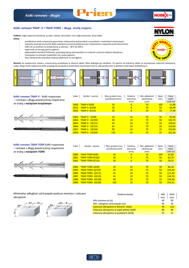 Kołki ramowe - długie Kołki ramowe TNAP -V i TNAP-TORX – długą strefą rozporu Podłoże: cegły wapienno piaskowe, pustaki, sitówki, dziurawka i inne cegły otworowe, beton lekki, Zalety: przedłużona strefa rozpierania gwarantuje maksymalną wytrzymałość w pustakach i materiałach otworowych, specjalny wewnętrzny kształt dybla zabezpiecza przed przedwczesnym rozpieraniem a wypustki przed obracaniem, kołki nie są wrażliwe na temperaturę w zakresie – 40°C do 100°C, odporność na korozję, gnicie, pękanie, odpowiednia twardość Poliamidu, powoduję lepszą wytrzymałość na ściskanie i przenosi większe obciążenia, stosowanie na zewnątrz budynków, bez ryzyka pękania, duża elastyczność powoduje większą odporność na rozciąganie. Montaż: po wywierceniu otworu, umieszczamy przelotowo w otworze dybel, lekko dobijając go młotkiem. Po oparciu się kołnierza dybla na mocowanym materiale dokręcamy śrubę. Długa strefa rozpierania ściśle przylega do przegród w materiałach otworowych lub na całej powierzchni w pełnych materiałach budowlanych. Kołki ramowe TNAP-V - Kołki rozporowe – ramowe z długą powierzchnią rozpierania ze śrubą z nacięciem krzyżowym Kołki ramowe TNAP-TORX Kołki rozporowe – ramowe z długą powierzchnią rozpierania ze śrubą z nacięciem TORX Index Symbol - wymiar Max, grubość moc. przedmiotu [mm] 2860 TNAP-V 8/80 2861 TNAP-V 8/100 2862 TNAP-V 8/120 10 30 50 2863 2864 2865 2866 2867 2868 10 30 45 65 90 130 Index TNAP-V TNAP-V TNAP-V TNAP-V TNAP-V TNAP-V 10/80 10/100 10/115 10/135 10/160 10/200 Symbol - wymiar 10 30 50 2884 2885 2886 2887 2888 2889 10 30 45 65 90 130 TNAP-TORX 10/80 TNAP-TORX 10/100 TNAP-TORX 10/115 TNAP-TORX 10/135 TNAP-TORX 10/160 TNAP-TORX 10/200 Minimalne odległości od krawędzi podczas montażu i zalecane obciążenie Min. głębokość zakotwienia [mm] Opak. (szt.) 70 70 70 100 50 50 10 10 10 10 10 10 70 70 70 70 70 70 50 50 50 50 25 25 Średnica wiercenia [mm] Min. głębokość zakotwienia [mm] Opak. (szt.) 70 70 70 100 50 50 10 10 10 10 10 10 70 70 70 70 70 70 50 50 50 50 25 50 8 8 8 Max, grubość moc. przedmiotu [mm] 2880 TNAP-TORX 8/80 2881 TNAP-TORX 8/100 2882 TNAP-TORX 8/120 Średnica wiercenia [mm] 8 8 8 Średnica kotwy Min rozstaw osi (a) Min. odległość od krawędzi (a1) Zalecane obciążenie w betonie [daN] Zalecane obciążenie w cegle pełnej [daN] Zalecane obciążenie w pustakach [daN] 39 M8 mm. 40 40 90 80 19 Cena netto [100 szt] 51,86 64,99 77,90 85,66 102,74 109,83 133,66 154,04 252,26 Cena netto [100 szt] 52,89 64,79 78,31 86,18 103,50 111,40 134,70 156,40 254,51 M10 mm. 50 50 110 96 31 Kołki ramowe - długie Kołki ramowe z długą strefą rozpierania TSX/L, TNAP-TE, TSX-S/L Podłoże: cegły wapienno piaskowe, pustaki, sitówki, dziurawka i inne cegły otworowe, beton lekki, Zalety: przedłużona strefa rozpierania gwarantuje maksymalną wytrzymałość w pustakach i materiałach otworowych, specjalny wewnętrzny kształt dybla zabezpiecza przed przedwczesnym rozpieraniem a wypustki przed obracaniem, kołki nie są wrażliwe na temperaturę w zakresie – 40°C do 100°C, odporność na korozję, gnicie, pękanie, odpowiednia twardość Poliamidu, powoduję lepszą wytrzymałość na ściskanie i przenosi większe obciążenia, stosowanie na zewnątrz budynków, bez ryzyka pękania, duża elastyczność powoduje większą odporność na rozciąganie. Montaż: po wywierceniu otworu, umieszczamy przelotowo w otworze dybel, lekko dobijając go młotkiem. Po oparciu się kołnierza dybla na mocowanym materiale dokręcamy śrubę. Długa strefa rozpierania ściśle przylega do przegród w materiałach otworowych lub na całej powierzchni w pełnych materiałach budowlanych. Kołki ramowe TSX/L Kołki rozporowe – ramowe z długą powierzchnią rozpierania ze śrubą z nacięciem krzyżowym LP L Kołki ramowe TNAP-TE Kołki rozporowe – ramowe z długą powierzchnią rozpierania ze śrubą z łbem sześciokątnym Index Symbol - wymiar 1060 1060 1062 TSX / LP 10/180 TSX / LP 10/200 TSX / LP 10/230 110 110 150 1064 1065 1066 1067 TSX / L 10/260 TSX / L 10/280 TSX / L 10/300 TSX / L 10/320 190 210 230 250 Index Symbol - wymiar Max, grubość moc. przedmiotu [mm] 10 10 10 Max, grubość moc. przedmiotu [mm] 10 30 50 2904 2905 2906 2907 2908 2909 TNAP-TE 10/80 TNAP-TE 10/100 TNAP-TE 10/115 TNAP-TE 10/135 TNAP-TE 10/160 TNAP-TE 10/200 10 30 45 65 90 130 Index Symbol - wymiar Max, grubość moc. przedmiotu [mm] LP 1079 1080 1081 TSX-S /LP 10/180 TSX-S /LP 10/200 TSX-S /LP 10/230 110 130 150 L 1083 1084 1085 1086 TSX-S /L 10/260 TSX-S/ L 10/280 TSX-S/ L 10/300 TSX-S/ L 10/320 190 210 230 250 Minimalne odległości od krawędzi podczas montażu i zalecane obciążenie 70 70 70 Opak. (szt.) Cena netto [100 szt.] 50 50 50 156,78 170,78 198,69 Średnica wiercenia [mm] Min. głębokość zakotwienia [mm] Opak. (szt.) 70 70 70 100 50 50 64,42 76,52 90,41 10 10 10 10 10 10 70 70 70 70 70 70 50 50 50 50 25 25 99,90 118,25 130,21 154,36 176,11 265,49 Średnica wiercenia [mm] Min. głębokość zakotwienia [mm] Opak. (szt.) Cena netto [100 szt.] 70 70 70 50 50 50 159,50 177,62 201,03 10 10 10 10 70 70 70 70 50 50 50 50 350,00 366,90 395,00 425,00 8 8 8 10 10 10 Średnica kotwy Min rozstaw osi (a) Min. odległość od krawędzi (a1) Zalecane obciążenie w betonie [daN] Zalecane obciążenie w cegle pełnej [daN] Zalecane obciążenie w pustakach [daN] 40 Min. głębokość zakotwienia [mm] 10 70 50 342,50 10 70 50 368,15 10 70 50 402,50 10 70 50 440,65 *Na zamówienie dostępne również z nacięciem TORX 2900 TNAP-TE 8/80 2901 TNAP-TE 8/100 2902 TNAP-TE 8/120 Kołki ramowe TSX-S/L Kołki rozporowe – ramowe z długą powierzchnią rozpierania ze śrubą z łbem sześciokątnym Średnica wiercenia [mm] Cena netto [100 szt] M8 mm. 40 40 90 80 19 M10 mm. 50 50 110 96 31 Kołki ramowe - długie Kołki ramowe z długą strefą rozpierania Podłoże: cegły wapienno piaskowe, pustaki, si