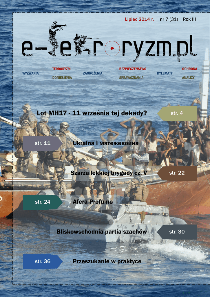 Lipiec 2014 r. TERRORYZM BEZPIECZEŃSTWO WYZWANIA ZAGROŻENIA DONIESIENIA SPRAWOZDANIA str. 4 str. 22 Afera Profumo Bliskowschodnia partia szachów str. 36 ANALIZY Ukraina i мятежевойнa Szarża lekkiej brygady cz. V str. 24 OCHRONA DYLEMATY Lot MH17 - 11 września tej dekady? str. 11 nr 7 (31) ROK III Przeszukanie w praktyce str. 30 e-Terroryzm.pl W numerze: Terroryzm str. ○ Lot MH17 - 11 września tej dekady?...................... nr 7 / 2014 (31) Internetowy Biuletyn Instytutu Studiów nad Terroryzmem Redakcja 4 TOBIASZ MAŁYSA Biuletyn redagują: Geopolityka ○ Ukraina i мятежевойнa ........................................... 11 KAZIMIERZ KRAJ ○ Szarża lekkiej brygady cz. V .................................... 22 KAZIMIERZ KRAJ Historia ○ Afera Profumo .......................................................... 24 ROBERT WITAK ○ Bliskowschodnia partia szachów (w 100. rocznicę Wielkiej Wojny) ............................ 30 KRZYSZTOF KUBIAK Bezpieczeństwo ○ Psychologiczny eksperyment Facebooka ............... 35 BERNADETTA STACHURA-TERLECKA Przemysław Bacik Hanna Ismahilova Jacek Kowalski dr Kazimierz Kraj Tobiasz Małysa Natalia Noga Kamil Pietrasik Piotr Podlasek Anna Rejman dr Jan Swół Bernadetta Stachura-Terlecka Robert Witak Ewa Wolska-Liśkiewicz Anna Wójcik Skład techniczny: Administrator www: Tobiasz Małysa Bernadetta StachuraTerlecka ○ Przeszukanie w praktyce ......................................... 36 JAN SWÓŁ Edukacja ○ Serwis internetowy od Doktorantów dla Doktorantów....................................................... 47 Warto poznać ○ Ochrana .................................................................... 49 ○ Dziennik Snajpera .................................................... 50 ○ Afera Rana................................................................ 51 Publikacja jest bezpłatna, a zespół redakcyjny oraz Autorzy nie odnoszą z niej korzyści materialnych. Publikowane teksty stanowią własność Autorów, a prezentowane poglądy nie są oficjalnymi stanowiskami Instytutu Studiów nad Terroryzmem oraz Wyższej Szkoły Informatyki i Zarządzania. Artykuły poruszane w czasopiśmie służą celom edukacyjnym oraz badawczym. Redakcja nie ponosi odpowiedzialności za inne ich wykorzystanie. Zespół redakcyjny tworzą pracownicy Katedry Bezpieczeństwa Wewnętrznego i Instytutu Studiów nad Terroryzmem Wyższej Szkoły Informatyki i Zarządzania w Rzeszowie oraz skupieni wokół tych jednostek znawcy i entuzjaści problematyki. Adresy i kontakt: Felieton ...................................................................... 54 – Poczta redakcji biuletynu: [email protected] – Strona internetowa biuletynu: www.e-terroryzm.pl – Instytut Studiów nad Terroryzmem: www.terroryzm.rzeszow.pl – Wyższa Szkoła Informatyki i Zarządzania: www.wsiz.rzeszow.pl Fotografia na okładce: Patrol antypiracki kontroluje przepływający statek u wybrzeży Somalii. Fot. European Union Naval Force / eunavfor.eu / https://www.flickr.com/photos/eunavfor/8248968313/ Wyższa Szkoła Informatyki i Zarządzania w Rzeszowie, ul. Sucharskiego 2, 32-225 Rzeszów Kalendarium 2014.07.28. N i g e r i a : Na północy, w mieście Kano zginęły 3 osoby, a kilkanaście zostało rannych w wyniku zamachów samobójczych. Ataków dokonały dwie dorosłe terrorystki oraz 15-letnia dziewczyna. 2014.07.22. Afganistan: Cztery osoby zginęły w wyniku ataku terrorystycznego w pobliżu lotniska w Kabulu. Terrorysta zdetonował ładunek wybuchowy, który miał przymocowany do motocykla. Do zorganizowania zamachu przyznało się ugrupowanie Taliban. 2014.07.21. Izrael: 7 żołnierzy zginęło w wyniku walk z bojownikami Hamasu w Strefie Gazy. Łącznie w ciągu dwóch tygodni walk zginęło ich 25. 2014.07.19. Egipt: W wyniku ostrzału przez terrorystów składu broni w punkcie kontrolnym zginęło 21 żołnierzy, a 4 zostało rannych. Ataku dokonali bojownicy islamistyczni, którzy utrzymują się z przemytu broni. 2014.07.17. Ukraina: W obwodzie donieckim na wschodzie Ukrainy został zestrzelony Boeing 777 z 298 osobami na pokładzie. Samolot należał do linii Malaysia Airlines, leciał z Amsterdamu do Kuala Lumpur. Zamachu dokonali prorosyjscy separatyści. 2014.07.08. Afganistan: 16 osób zginęło w wyniku ataku terrorystycznego w prowincji Parwan. Według afgańskich policjantów zamachu dokonał terrorysta samobójca, który podjechał na rowerze do grupy czeskich żołnierzy i zdetonował ładunek wybuchowy. Szanowni Czytelnicy! Kończy się lipiec i do rąk Państwa trafia kolejny numer miesięcznika. A w nim wiele ciekawych artykułów. Tobiasz Małysa pisze o tragicznym locie MH 17. Robert Witak o sławnej aferze Keeler - Profumo (ze szpiegostwem w tle) z przed pięćdziesięciu lat. O problemach bliskowschodnich z przed stu lat napisał profesor Krzysztof Kubiak. Problematykę przeszukania, dla zainteresowanych, poruszył Jan Swół. Zajmującą notkę o psychologicznych eksperymentach Facebooka zamieściła Bernadetta Stachura–Terlecka. Piszący te słowa kontynuuje tematykę ukraińską w dwóch artykułach, a odrzucenie dymisji premiera Ukrainy Arsenija Jaceniuka, potwierdza tezę, że deputowanym nieśpieszno do wyborów przedterminowych. W numerze jak zwykle recenzje, felieton oraz dodatkowo artykuł o portalu doktorantów. Życzę przyjemnej lektury oraz wypoczynku, do spotkania z sierpniowym wydaniem miesięcznika. Za zespół Kazimierz Kraj 2014.06.30. Egipt: W wyniku wybuchu trzech bomb, w pobliżu pałacu prezydenckiego w Kairze, zginęło dwóch oficerów egipskiej policji, a osiem osób zostało rannych. Do zamachów doszło rok po obaleniu prezydenta Mursiego. Marco Szczepanik Terroryzm TOBIASZ MAŁYSA Lot MH17 - 11 września tej dekady? W XXI wieku na pozór dziwna wydawać się może niemożność odnalezienia wraku zagubionego na morzu dużego pasażerskiego samolotu, jak to stało się z lotem MH370 w marcu te