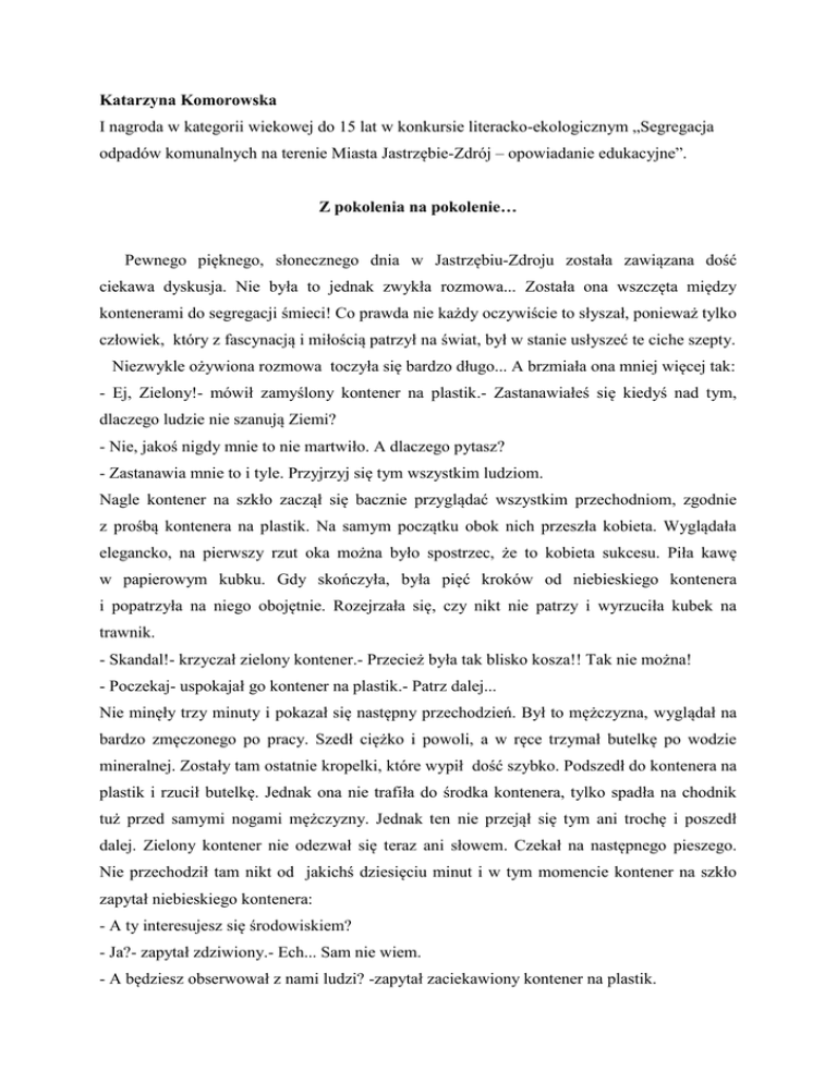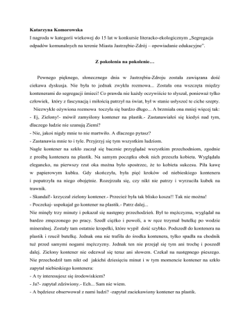 Katarzyna Komorowska I nagroda w kategorii wiekowej do 15 lat w konkursie literacko-ekologicznym „Segregacja odpadów komunalnych na terenie Miasta Jastrzębie-Zdrój – opowiadanie edukacyjne”. Z pokolenia na pokolenie… Pewnego pięknego, słonecznego dnia w Jastrzębiu-Zdroju została zawiązana dość ciekawa dyskusja. Nie była to jednak zwykła rozmowa... Została ona wszczęta między kontenerami do segregacji śmieci! Co prawda nie każdy oczywiście to słyszał, ponieważ tylko człowiek, który z fascynacją i miłością patrzył na świat, był w stanie usłyszeć te ciche szepty. Niezwykle ożywiona rozmowa toczyła się bardzo długo... A brzmiała ona mniej więcej tak: - Ej, Zielony!- mówił zamyślony kontener na plastik.- Zastanawiałeś się kiedyś nad tym, dlaczego ludzie nie szanują Ziemi? - Nie, jakoś nigdy mnie to nie martwiło. A dlaczego pytasz? - Zastanawia mnie to i tyle. Przyjrzyj się tym wszystkim ludziom. Nagle kontener na szkło zaczął się bacznie przyglądać wszystkim przechodniom, zgodnie z prośbą kontenera na plastik. Na samym początku obok nich przeszła kobieta. Wyglądała elegancko, na pierwszy rzut oka można było spostrzec, że to kobieta sukcesu. Piła kawę w papierowym kubku. Gdy skończyła, była pięć kroków od niebieskiego kontenera i popatrzyła na niego obojętnie. Rozejrzała się, czy nikt nie patrzy i wyrzuciła kubek na trawnik. - Skandal!- krzyczał zielony kontener.- Przecież była tak blisko kosza!! Tak nie można! - Poczekaj- uspokajał go kontener na plastik.- Patrz dalej... Nie minęły trzy minuty i pokazał się następny przechodzień. Był to mężczyzna, wyglądał na bardzo zmęczonego po pracy. Szedł ciężko i powoli, a w ręce trzymał butelkę po wodzie mineralnej. Zostały tam ostatnie kropelki, które wypił dość szybko. Podszedł do kontenera na plastik i rzucił butelkę. Jednak ona nie trafiła do środka kontenera, tylko spadła na chodnik tuż przed samymi nogami mężczyzny. Jednak ten nie przejął się tym ani trochę i poszedł dalej. Zielony kontener nie odezwał się teraz ani słowem. Czekał na następnego pieszego. Nie przechodził tam nikt od jakichś dziesięciu minut i w tym momencie kontener na szkło zapytał niebieskiego kontenera: - A ty interesujesz się środowiskiem? - Ja?- zapytał zdziwiony.- Ech... Sam nie wiem. - A będziesz obserwował z nami ludzi? -zapytał zaciekawiony kontener na plastik. - No dobrze... Czekali, czekali, czekali... I nagle zobaczyli chłopaka. Mógł mieć może piętnaście lat, przynajmniej na tyle wyglądał. Najwyraźniej wracał ze szkoły, ponieważ ledwo szedł, obciążony książkami i zeszytami. Usiadł na ławce tuż obok kontenerów. ,,Chyba na kogoś czeka''- pomyśleli czujni obserwatorzy. Ich przypuszczenia potwierdziły się. Podeszła do niego piękna dziewczyna i zaczęli rozmawiać o tym, co im się dzisiaj zdarzyło. W pewnym momencie chłopak chwycił ją za rękę i pociągnął za sobą. Nie wzbudziłoby to w kontenerach żadnych podejrzeń, gdyby nie głośne: "Apsik!", które echo rozniosło między budynkami. W tej chwili, już nie całkiem biała chusteczka higieniczna wpadła na ulicę. Kontenery na szkło i na plastik się nie odzywały i patrzyły znacząco na niebieski kontener. - I co o tym myślisz? - zapytał żółty kontener. - Chyba nic... To przecież ich sprawa, w jakim środowisku będą mieszkać... Dwa kontenery, żółty i zielony, spojrzały po sobie i nie odezwały się ani słowem. Jako następna przeszła młoda kobieta. Nie odznaczała się niczym szczególnym. Dziewczyna wyszła z bloku znajdującego się naprzeciwko obserwatorów. Szła na spacer z psem i przy okazji miała wyrzucić śmieci. Miała jedną reklamówkę z plastikowymi butelkami i drugą z makulaturą. Nasi bohaterowie nie byli opisani, co trzeba do nich wrzucać, więc dziewczynie nie zrobiło to różnicy, że plastikowe butelki wyrzuciła do niebieskiego kontenera, a makulaturę do żółtego. Słychać tylko było: - Ała!!!- krzyczał żółty kontener.- Dziewczyno! Co robiłaś na lekcjach o ekologii!!! - A ciebie to nie zabolało? - zapytał zielony kontener. - No boli, ale co ja na to poradzę? Po tygodniu wnikliwej obserwacji kontenery patrzyły po sobie smutno. Każdy z nich myślał tylko o tym, że przez siedem dni nie zauważyły ani jednego człowieka, który dba o środowisko. Bardzo ich to zmartwiło, nawet kontener na papier! Jednak żaden z nich nie ośmielił się powiedzieć tego na głos. Po jakimś czasie pojemniki zobaczyły spacerujących dziadka z wnuczką. Dziewczynka wyglądała na pięciolatkę, która szła energicznym i radosnym krokiem. Nagle wnuczka zapytała: - Dziadku, a dlaczego dookoła tych kontenerów jest tyle śmieci? - Widzisz, to jest tak, że niektórzy nie potrafią docenić tego, co ich otacza. Liczą się dla nich pieniądze, dobre posady w pracy. Nie interesuje ich, że przez to środowisko cierpi...- wnuczka nie dała mu skończyć i wydobyła z siebie pytanie: - Dziadku, a my możemy to posprzątać? - Oczywiście! Wzięli się ochoczo do pracy. Zbierali rozrzucone butelki, puszki, papiery i wiele, wiele innych przedmiotów. Posegregowali je i włożyli do właściwych pojemników, których przeznaczenie dokładnie opisał wnuczce dziadek. Dziewczynka odsunęła się parę kroków, aby zobaczyć, jak wyglądają kontenery, gdy wokół nich jest tak czysto. ,,Pięknie''- pomyślała, ponieważ nie przyszło jej do głowy, żeby powiedzieć to na głos. ,,Tu jest naprawdę pięknie!"- powiedziała sobie w głowie jeszcze raz. Wypełnione po brzegi pojemniki zaniemówiły. W końcu rozpoczęły rozmowę. - Cudowne dziecko! Naprawdę cudowne dziecko!- powiedział kontener na papier. - Niebieski!- powiedział żółty kontener.- Wreszcie coś cię obchodzi! Sukces! Od tej pory kontenery wiedziały, że są jeszcze ludzie, którzy dbają o środowisko i uczą dbania o nie innych! Mają o