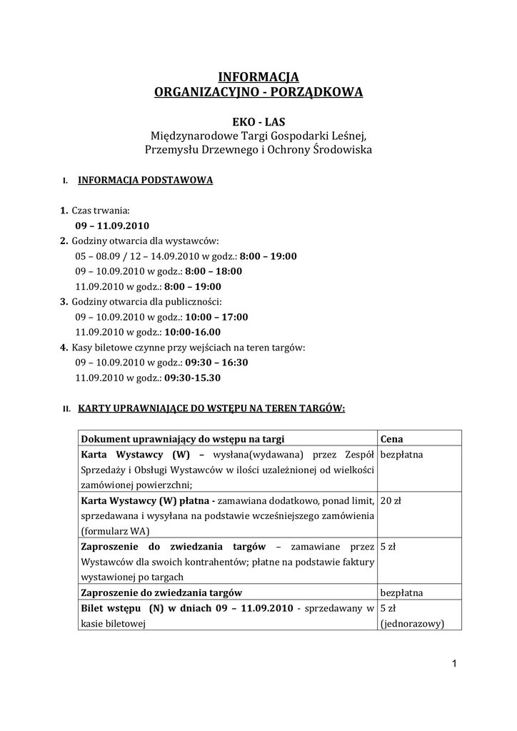 INFORMACJA ORGANIZACYJNO - PORZĄDKOWA EKO - LAS Międzynarodowe Targi Gospodarki Leśnej, Przemysłu Drzewnego i Ochrony Środowiska I. INFORMACJA PODSTAWOWA 1. Czas trwania: 09 – 11.09.2010 2. Godziny otwarcia dla wystawców: 05 – 08.09 / 12 – 14.09.2010 w godz.: 8:00 – 19:00 09 – 10.09.2010 w godz.: 8:00 – 18:00 11.09.2010 w godz.: 8:00 – 19:00 3. Godziny otwarcia dla publiczności: 09 – 10.09.2010 w godz.: 10:00 – 17:00 11.09.2010 w godz.: 10:00-16.00 4. Kasy biletowe czynne przy wejściach na teren targów: 09 – 10.09.2010 w godz.: 09:30 – 16:30 11.09.2010 w godz.: 09:30-15.30 II. KARTY UPRAWNIAJĄCE DO WSTĘPU NA TEREN TARGÓW: Dokument uprawniający do wstępu na targi Cena Karta Wystawcy (W) – wysłana(wydawana) przez Zespół bezpłatna Sprzedaży i Obsługi Wystawców w ilości uzależnionej od wielkości zamówionej powierzchni; Karta Wystawcy (W) płatna - zamawiana dodatkowo, ponad limit, 20 zł sprzedawana i wysyłana na podstawie wcześniejszego zamówienia (formularz WA) Zaproszenie do zwiedzania targów – zamawiane przez 5 zł Wystawców dla swoich kontrahentów; płatne na podstawie faktury wystawionej po targach Zaproszenie do zwiedzania targów bezpłatna Bilet wstępu (N) w dniach 09 – 11.09.2010 - sprzedawany w 5 zł kasie biletowej (jednorazowy) 1 Dla pozostałych uczestników targów: służbowe karty wstępu dla obsługi targów, karty wstępu i wjazdu na okres montażu i demontażu (bezpłatne) można uzyskać na podstawie pisemnego zamówienia wystawcy lub przedsiębiorcy budującego stoiska. UWAGA: W trakcie imprezy targowej odbywać się będą w wyznaczonych miejscach i godzinach pokazy stwarzające zagrożenie w przypadku zejścia z wyznaczonej trasy i w związku z tym zobowiązujemy wystawców i osoby zwiedzające do poruszaniu się wyłącznie wyznaczonymi drogami zwiedzania w obrębie wystawy zlokalizowanej na terenie leśnym. III. KARTY UPRAWNIAJĄCE DO WJAZDU I PARKOWANIA NA TERENIE TARGÓW Rodzaj dokumentu Cena Stała karta wjazdu ważna w dniach 05-14.09.2010r bezpłatna Dodatkowa Stała karta wjazdu ważna w dniach 05-14.09.2010r- 20 zł Stała karta wjazdu MD bezpłatna ważna w dniach montażu i bezpłatna demontażu 05 – 08.09 / 12 – 14.09.2010 Jednorazowa karta parkingowa dla zwiedzających (dotyczy jednorazowego wjazdu na wyznaczony terenu parkingu) - dla samochodów osobowych i autobusów 5 zł - dla autobusów 20 zł Uwaga: Stała karta wjazdu: – uprawnia Wystawców do wielokrotnego wjazdu na teren targowy w każdym dniu trwania targów w godzinach 8.00 – 10.00 oraz w godzinach 17.00 – 18.00 oraz bezpłatnego parkowania na wyznaczonym przez MTP terenie parkingu w godzinach 8.00 – 18.00 - uprawnia w okresie montażu i demontażu do wielokrotnego wjazdu na teren ekspozycji oraz bezpłatnego parkowania na wyznaczonym przez MTP terenie parkingu w godzinach 8.00 - 19.00. Jednorazowa karta parkingowa – uprawnia do jednorazowego wjazdu na parking w dniu oznaczonym na karcie parkingowej. Sprzedaż jednorazowych kart parkingowych /wydruk z drukarki fiskalnej/ prowadzona jest bezpośrednio przy wjeździe na parking zlokalizowany przy terenie targów od godziny 9.00 do 16.30. 2 IV. ZASADY WJAZDU NA TERENY TARGÓW 1. Wjazd w okresie montażu w dniach 05 – 08.09.2010 Wjazd na tereny targowe jest bezpłatny, dostępny w godzinach 8.00 – 19.00: a. dla samochodów dostawczych i ciężarowych – po okazaniu przy wjeździe jednego z następujących dokumentów: stałej karty wjazdu + karty wstępu Wystawcy, karty wjazdu MD - dot. firm budujących stoiska względnie powierniczych + karta wstępu MD, zlecenia dostawy (odbioru) eksponatów lub materiałów b. dla samochodów osobowych – po okazaniu przy wjeździe jednego z następujących dokumentów: stałej karty wjazdu + karty wstępu Wystawcy, karty wjazdu MD - dot. firm budujących stoiska + karta wstępu MD 2. Wjazd w okresie trwania targów na teren targów i parkingu a. w dniach 09 - 11.09.2010 do wjazdu na teren targów, w godzinach 8.00 – 10.00 oraz 17.00 – 18.00 upoważnia: stała karty wjazdu + karta wstępu Wystawcy b. w dniach 09 - 11.09.2010 do parkowania wystawców na terenie wyznaczonego przez MTP parkingu w godzinach 8.00 – 18.00 upoważnia: stała karta wjazdu + karta wstępu Wystawcy c. w dniach 09 - 11.09.2010 do parkowania zwiedzających na terenie wyznaczonego przez MTP parkingu w godzinach 9.30 – 17.00 upoważnia: jednorazowa karta parkingowa 3. Wjazd w okresie likwidacji i demontażu Likwidacja w dniu 11.09.2010 W celu demontażu stoisk samochody wpuszczane będą na tereny targowe po godz. 16:15. a. samochody dostawcze i ciężarowe: miejsce oczekiwania pojazdów dostępne bezpłatnie w godz. 7.00 19.00 – teren wyznaczonego przez MTP parkingu Demontaż w dniach 12 - 14.09.2010 Wjazd na tereny MTP jest bezpłatny, dostępny dla samochodów wg zasad jak podczas montażu. 3 Organizacja ruchu samochodowego Wjazd na teren ekspozycji w trakcie montażu i demontażu targów odbywać się będzie z dwóch stron: a. na teren ekspozycji zlokalizowanej w lesie wjazd od strony zachodniej dojazd drogą powiatową nr 1238F (zjazd z A2 w kierunku miejscowości Zagórze) b. na teren ekspozycji zlokalizowanej na polu wjazd od strony wschodniej przy stacji Statoil – dojazd drogą gminną nr 003004F Wjazd na teren ekspozycji w trakcie targów odbywać się będzie wyłącznie od strony wschodniej przy stacji Statoil – dojazd drogą gminną nr 003004F. Wyjazd w okresie montażu/targów/demontażu odbywać się będzie po przez wprowadzenie ruchu jednokierunkowym i obowiązywać będzie wg znaków drogowych i tablic informacyjnych. Przebywanie na terenie targów bez ważnego dokumentu wjazdu lub pozostawienie pojazdu podczas trwania targów na terenie MTP po godz. 18.00 i w okresie montażu i demontażu po godz. 18.00 spowoduje założenie urządzenia blokującego koło oraz nałożenie kary porządkowej w wysokości 200 zł. Kara porządkowa nie