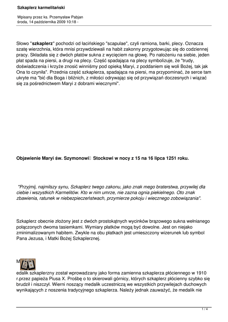 Szkaplerz karmelitański Wpisany przez ks. Przemysław Pabjan środa, 14 października 2009 10:18 - Słowo "szkaplerz" pochodzi od łacińskiego "scapulae", czyli ramiona, barki, plecy. Oznacza szatę wierzchnia, która mnisi przywdziewali na habit zakonny przygotowując się do codziennej pracy. Składała się z dwóch płatów sukna z wycięciem na głowę. Po nałożeniu na siebie, jeden płat spada na piersi, a drugi na plecy. Część spadająca na plecy symbolizuje, że "trudy, doświadczenia i krzyże znosić winniśmy pod opieką Maryi, z poddaniem się woli Bożej, tak jak Ona to czyniła". Przednia część szkaplerza, spadająca na piersi, ma przypominać, że serce tam ukryte ma "bić dla Boga i bliźnich, z miłości odrywając się od przywiązań doczesnych i wiązać się za pośrednictwem Maryi z dobrami wiecznymi". Objawienie Maryi św. Szymonowi Stockowi w nocy z 15 na 16 lipca 1251 roku. "Przyjmij, najmilszy synu, Szkaplerz twego zakonu, jako znak mego braterstwa, przywilej dla ciebie i wszystkich Karmelitów. Kto w nim umrze, nie zazna ognia piekielnego. Oto znak zbawienia, ratunek w niebezpieczeństwach, przymierze pokoju i wiecznego zobowiązania". Szkaplerz obecnie złożony jest z dwóch prostokątnych wycinków brązowego sukna wełnianego połączonych dwoma tasiemkami. Wymiary płatków mogą być dowolne. Jest on niejako zminimalizowanym habitem. Zwykle na obu płatkach jest umieszczony wizerunek lub symbol Pana Jezusa, i Matki Bożej Szkaplerznej. M edalik szkaplerzny został wprowadzany jako forma zamienna szkaplerza płóciennego w 1910 r.przez papieża Piusa X. Prośbę o to skierowali górnicy, których szkaplerz płócienny szybko się brudził i niszczył. Wierni noszący medalik uczestniczą we wszystkich przywilejach duchowych wynikających z noszenia tradycyjnego szkaplerza. Należy jednak zauważyć, że medalik nie 1/4 Szkaplerz karmelitański Wpisany przez ks. Przemysław Pabjan środa, 14 października 2009 10:18 - wyraża w pełni bogatej symboliki szkaplerza mini-habitu. Jedna strona medalika winna przedstawiać wizerunek Matki Bożej Szkaplerznej, a drugi Serca Pana Jezusa. Przyjęcie do rodziny szkaplerznej może nastąpić jedynie szkaplerzem płóciennym. Stolica apostolska uznała Szkaplerz jako sakramentale, tzn. znak, który noszącego usposabia do przyjęcia łaski oraz pogłębienia życia łaski w sobie. Swą władzą apostolską Kościół potwierdził przywileje Szkaplerza, moc jego opierając na modlitwach całego Kościoła. Nabożeństwo zaś szkaplerzne uznał, obok Różańca świętego za podstawowe nabożeństwo Maryjne. Do Polski kult Matki Bożej Szkaplerznej przynieśli Karmelici pod koniec XIV wieku. Ożywienie tego kultu miało miejsce wraz z przybyciem do Polski karmelitów bosych w 1605 roku. Zaraz w roku następnym królewicz Władysław IV ze szlachtą dworu przyjął Szkaplerz święty i od tego czasu bractwo Szkaplerza świętego rozszerza się szybko w naszym kraju. W naszych czasach bractwo Szkaplerza istnieje prawie wszędzie a często cudowne zdarzenia potwierdzają jak Najświętsza Maryja Panna jest wierna swoim obietnicom. Przywileje szkaplerza karmelitańskiego 1. Kto umrze odziany Szkaplerzem świętym, nie zostanie potępiony. 2. Noszący(a) Szkaplerz jako czciciel(ka) Matki Bożej zapewnia sobie Jej opiekę co do duszy i ciała w tym życiu i szczególną pomoc w godzinie śmierci. 3. Każdy(a), kto pobożnie nosi Szkaplerz święty i zachowuje czystość według stanu, zostanie wyprowadzony(a) z czyśćca osobiście przez Matkę Bożą w pierwsza sobotę po swej śmierci. 4. Ci którzy należą do Bractwa Szkaplerznego są duchowo złączeni z zakonem Karmelitańskim i maja udział w jego duchowych dobrach za życia i po śmierci, a więc; we 2/4 Szkaplerz karmelitański Wpisany przez ks. Przemysław Pabjan środa, 14 października 2009 10:18 - Mszach świętych, Komuniach świętych, umartwieniach, modlitwach, postach itp. Obowiązki należących do bractwa szkaplerznego 1. Przyjąć Szkaplerz karmelitański z rąk kapłana. 2. Wpisać się do księgi Bractwa Szkaplerznego. 3. W dzień i w nocy nosić na sobie Szkaplerz święty. 4. Odmawiać codziennie modlitwę naznaczoną w dniu przyjęcia do Bractwa (zazwyczaj "Pod Twoja obronę...") 5. Naśladować cnoty Matki Najświętszej i szerzyć Jej kult (cześć). Samo noszenie szkaplerza nie zapewnia jednak automatycznie zbawienia. Nie jest to bowiem paszport z wizami do nieba, za okazaniem którego, po życiu pełnym lenistwa i minimalizmu, można osiągnąć życie wieczne. Nie można szkaplerza traktować jak amuletu czy talizmanu. Byłoby to magią i zabobonem. Nie można zbawić się dzięki "przywilejowi" czy dyspensie, ale jedynie dzięki łasce Chrystusa Pana i dojrzałej wierze. Szkaplerz musi wyrażać autentyczne życie chrześcijańskie, pobudzać do czynów miłości Boga i bliźniego. Nie może być jedynie pustym znakiem. Nie można pokładać całej ufności w kawałku materiału, który przecież sam z siebie zbawić nie może. Szkaplerz karmelitański jest duchowym znakiem nabożeństwa maryjnego, polegającego na wewnętrznym oddaniu i poświęceniu się Niepokalanej Dziewicy. Nosić szkaplerz święty - znaczy uznawać Maryję za duchową Matkę, Pośredniczkę, Opiekunkę i Siostrę. Nosić "szatę Maryi" - znaczy przyznać się do podobieństwa do Maryi w sposobie myślenia, wartościowania, działania i apostołowania. Oznacza to też bycie znakiem nadziei dla innych, obdarzanie ludzi Zbawicielem jak Maryja i solidarność z pozbawionymi nadziei. Upodabniamy się do Maryi, dążąc do czystości, pokory, skromności, cichości, żyjąc wielkim zawierzeniem Bogu, będąc wdzięcznym za otrzymane łaski i ofiarnym w miłości bliźniego. Maryja uczy otwierania się na wolę Bożą, współpracy w dziele zbawienia, życia w bliskości Jezusa, rozważając każde Jego słowo w swoim sercu. Matka Boża, pomagając Kościołowi, pragnie
