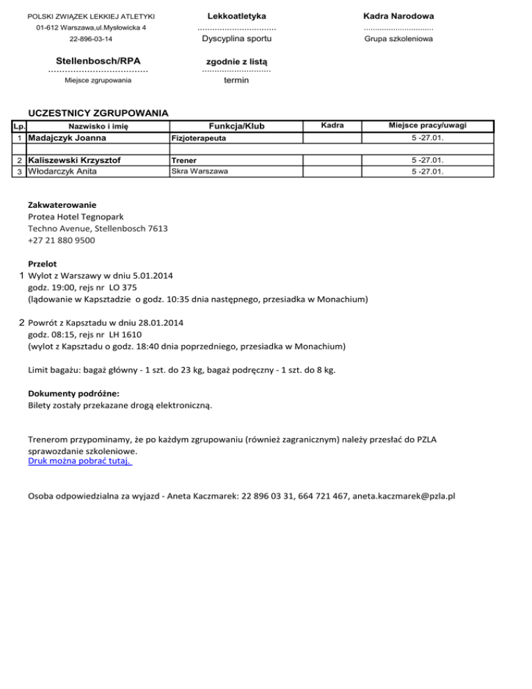 POLSKI ZWIĄZEK LEKKIEJ ATLETYKI 01-612 Warszawa,ul.Mysłowicka 4 22-896-03-14 Stellenbosch/RPA .................................... Miejsce zgrupowania Lekkoatletyka ................................ Dyscyplina sportu Kadra Narodowa ............................... Grupa szkoleniowa zgodnie z listą ............................ termin UCZESTNICY ZGRUPOWANIA Lp. Nazwisko i imię Funkcja/Klub Kadra Miejsce pracy/uwagi 1 Madajczyk Joanna Fizjoterapeuta 5 -27.01. 2 Kaliszewski Krzysztof Trener Skra Warszawa 5 -27.01. 3 Włodarczyk Anita 5 -27.01. Zakwaterowanie Protea Hotel Tegnopark Techno Avenue, Stellenbosch 7613 +27 21 880 9500 Przelot 1 Wylot z Warszawy w dniu 5.01.2014 godz. 19:00, rejs nr LO 375 (lądowanie w Kapsztadzie o godz. 10:35 dnia następnego, przesiadka w Monachium) 2 Powrót z Kapsztadu w dniu 28.01.2014 godz. 08:15, rejs nr LH 1610 (wylot z Kapsztadu o godz. 18:40 dnia poprzedniego, przesiadka w Monachium) Limit bagażu: bagaż główny - 1 szt. do 23 kg, bagaż podręczny - 1 szt. do 8 kg. Dokumenty podróżne: Bilety zostały przekazane drogą elektroniczną. Trenerom przypominamy, że po każdym zgrupowaniu (również zagranicznym) należy przesłać do PZLA sprawozdanie szkoleniowe. Druk można pobrać tutaj. Osoba odpowiedzialna za wyjazd - Aneta Kaczmarek: 22 896 03 31, 664 721 467, [email protected]