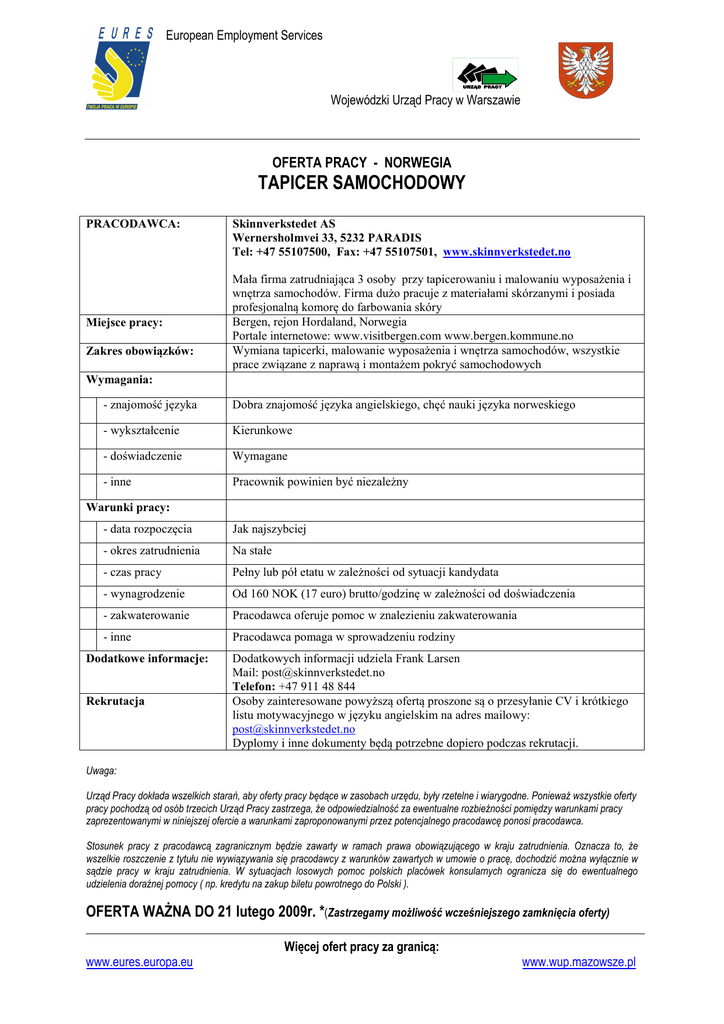 European Employment Services Wojewódzki Urząd Pracy w Warszawie OFERTA PRACY - NORWEGIA TAPICER SAMOCHODOWY PRACODAWCA: Miejsce pracy: Zakres obowiązków: Skinnverkstedet AS Wernersholmvei 33, 5232 PARADIS Tel: +47 55107500, Fax: +47 55107501, www.skinnverkstedet.no Mała firma zatrudniająca 3 osoby przy tapicerowaniu i malowaniu wyposażenia i wnętrza samochodów. Firma dużo pracuje z materiałami skórzanymi i posiada profesjonalną komorę do farbowania skóry Bergen, rejon Hordaland, Norwegia Portale internetowe: www.visitbergen.com www.bergen.kommune.no Wymiana tapicerki, malowanie wyposażenia i wnętrza samochodów, wszystkie prace związane z naprawą i montażem pokryć samochodowych Wymagania: - znajomość języka Dobra znajomość języka angielskiego, chęć nauki języka norweskiego - wykształcenie Kierunkowe - doświadczenie Wymagane - inne Pracownik powinien być niezależny Warunki pracy: - data rozpoczęcia Jak najszybciej - okres zatrudnienia Na stałe - czas pracy Pełny lub pół etatu w zależności od sytuacji kandydata - wynagrodzenie Od 160 NOK (17 euro) brutto/godzinę w zależności od doświadczenia - zakwaterowanie Pracodawca oferuje pomoc w znalezieniu zakwaterowania - inne Pracodawca pomaga w sprowadzeniu rodziny Dodatkowe informacje: Rekrutacja Dodatkowych informacji udziela Frank Larsen Mail: [email protected] Telefon: +47 911 48 844 Osoby zainteresowane powyższą ofertą proszone są o przesyłanie CV i krótkiego listu motywacyjnego w języku angielskim na adres mailowy: [email protected] Dyplomy i inne dokumenty będą potrzebne dopiero podczas rekrutacji. Uwaga: Urząd Pracy dokłada wszelkich starań, aby oferty pracy będące w zasobach urzędu, były rzetelne i wiarygodne. PoniewaŜ wszystkie oferty pracy pochodzą od osób trzecich Urząd Pracy zastrzega, Ŝe odpowiedzialność za ewentualne rozbieŜności pomiędzy warunkami pracy zaprezentowanymi w niniejszej ofercie a warunkami zaproponowanymi przez potencjalnego pracodawcę ponosi pracodawca. Stosunek pracy z pracodawcą zagranicznym będzie zawarty w ramach prawa obowiązującego w kraju zatrudnienia. Oznacza to, Ŝe wszelkie roszczenie z tytułu nie wywiązywania się pracodawcy z warunków zawartych w umowie o pracę, dochodzić moŜna wyłącznie w sądzie pracy w kraju zatrudnienia. W sytuacjach losowych pomoc polskich placówek konsularnych ogranicza się do ewentualnego udzielenia doraźnej pomocy ( np. kredytu na zakup biletu powrotnego do Polski ). OFERTA WAśNA DO 21 lutego 2009r. *(Zastrzegamy moŜliwość wcześniejszego zamknięcia oferty) Więcej ofert pracy za granicą: www.eures.europa.eu www.wup.mazowsze.pl