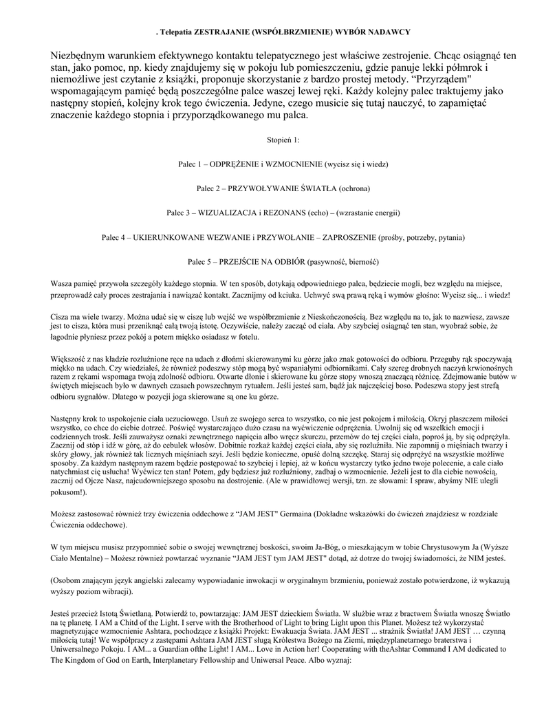 . Telepatia ZESTRAJANIE (WSPÓŁBRZMIENIE) WYBÓR NADAWCY Niezbędnym warunkiem efektywnego kontaktu telepatycznego jest właściwe zestrojenie. Chcąc osiągnąć ten stan, jako pomoc, np. kiedy znajdujemy się w pokoju lub pomieszczeniu, gdzie panuje lekki półmrok i niemożliwe jest czytanie z książki, proponuje skorzystanie z bardzo prostej metody. “Przyrządem" wspomagającym pamięć będą poszczególne palce waszej lewej ręki. Każdy kolejny palec traktujemy jako następny stopień, kolejny krok tego ćwiczenia. Jedyne, czego musicie się tutaj nauczyć, to zapamiętać znaczenie każdego stopnia i przyporządkowanego mu palca. Stopień 1: Palec 1 – ODPRĘŻENIE i WZMOCNIENIE (wycisz się i wiedz) Palec 2 – PRZYWOŁYWANIE ŚWIATŁA (ochrona) Palec 3 – WIZUALIZACJA i REZONANS (echo) – (wzrastanie energii) Palec 4 – UKIERUNKOWANE WEZWANIE i PRZYWOŁANIE – ZAPROSZENIE (prośby, potrzeby, pytania) Palec 5 – PRZEJŚCIE NA ODBIÓR (pasywność, bierność) Wasza pamięć przywoła szczegóły każdego stopnia. W ten sposób, dotykają odpowiedniego palca, będziecie mogli, bez względu na miejsce, przeprowadź cały proces zestrajania i nawiązać kontakt. Zacznijmy od kciuka. Uchwyć swą prawą ręką i wymów głośno: Wycisz się... i wiedz! Cisza ma wiele twarzy. Można udać się w ciszę lub wejść we współbrzmienie z Nieskończonością. Bez względu na to, jak to nazwiesz, zawsze jest to cisza, która musi przeniknąć całą twoją istotę. Oczywiście, należy zacząć od ciała. Aby szybciej osiągnąć ten stan, wyobraź sobie, że łagodnie płyniesz przez pokój a potem miękko osiadasz w fotelu. Większość z nas kładzie rozluźnione ręce na udach z dłońmi skierowanymi ku górze jako znak gotowości do odbioru. Przeguby rąk spoczywają miękko na udach. Czy wiedziałeś, że również podeszwy stóp mogą być wspaniałymi odbiornikami. Cały szereg drobnych naczyń krwionośnych razem z rękami wspomaga twoją zdolność odbioru. Otwarte dłonie i skierowane ku górze stopy wnoszą znaczącą różnicę. Zdejmowanie butów w świętych miejscach było w dawnych czasach powszechnym rytuałem. Jeśli jesteś sam, bądź jak najczęściej boso. Podeszwa stopy jest strefą odbioru sygnałów. Dlatego w pozycji joga skierowane są one ku górze. Następny krok to uspokojenie ciała uczuciowego. Usuń ze swojego serca to wszystko, co nie jest pokojem i miłością. Okryj płaszczem miłości wszystko, co chce do ciebie dotrzeć. Poświęć wystarczająco dużo czasu na wyćwiczenie odprężenia. Uwolnij się od wszelkich emocji i codziennych trosk. Jeśli zauważysz oznaki zewnętrznego napięcia albo wręcz skurczu, przemów do tej części ciała, poproś ją, by się odprężyła. Zacznij od stóp i idź w górę, aż do cebulek włosów. Dobitnie rozkaż każdej części ciała, aby się rozluźniła. Nie zapomnij o mięśniach twarzy i skóry głowy, jak również tak licznych mięśniach szyi. Jeśli będzie konieczne, opuść dolną szczękę. Staraj się odprężyć na wszystkie możliwe sposoby. Za każdym następnym razem będzie postępować to szybciej i lepiej, aż w końcu wystarczy tytko jedno twoje polecenie, a cale ciało natychmiast cię usłucha! Wyćwicz ten stan! Potem, gdy będziesz już rozluźniony, zadbaj o wzmocnienie. Jeżeli jest to dla ciebie nowością, zacznij od Ojcze Nasz, najcudowniejszego sposobu na dostrojenie. (Ale w prawidłowej wersji, tzn. ze słowami: I spraw, abyśmy NIE ulegli pokusom!). Możesz zastosować również trzy ćwiczenia oddechowe z “JAM JEST" Germaina (Dokładne wskazówki do ćwiczeń znajdziesz w rozdziale Ćwiczenia oddechowe). W tym miejscu musisz przypomnieć sobie o swojej wewnętrznej boskości, swoim Ja-Bóg, o mieszkającym w tobie Chrystusowym Ja (Wyższe Ciało Mentalne) – Możesz również powtarzać wyznanie “JAM JEST tym JAM JEST" dotąd, aż dotrze do twojej świadomości, że NIM jesteś. (Osobom znającym język angielski zalecamy wypowiadanie inwokacji w oryginalnym brzmieniu, ponieważ zostało potwierdzone, iż wykazują wyższy poziom wibracji). Jesteś przecież Istotą Świetlaną. Potwierdź to, powtarzając: JAM JEST dzieckiem Światła. W slużbie wraz z bractwem Światła wnoszę Światło na tę planetę. I AM a Chitd of the Light. I serve with the Brotherhood of Light to bring Light upon this Planet. Możesz też wykorzystać magnetyzujące wzmocnienie Ashtara, pochodzące z książki Projekt: Ewakuacja Świata. JAM JEST ... strażnik Światła! JAM JEST … czynną miłością tutaj! We współpracy z zastępami Ashtara JAM JEST sługą Królestwa Bożego na Ziemi, międzyplanetarnego braterstwa i Uniwersalnego Pokoju. I AM... a Guardian ofthe Light! I AM... Love in Action her! Cooperating with theAshtar Command I AM dedicated to The Kingdom of God on Earth, Interplanetary Fellowship and Uniwersal Peace. Albo wyznaj: JAM JEST dzieckiem Światła ucieleśnionym na tej planecie, aby w służbie na tej planecie wypełniać wolę mego Ojca Niebieskiego. Niech się stanie! I AM a Child of God embodied upon this planet to serve the will of my Heaventy Father. So be it! Wyznanie jest dobitnym potwierdzeniem faktu, o którym WIEMY, że jest PRAWDĄ. W ten sposób w chwili wyciszenia wyznajesz sobie i całemu Niebu to, co wiesz. A wiesz, że wiesz... i to umacnia poczucie własnego autorytetu duchowego i siły niezbędnej do pokonywania dalszej drogi. Wiedz, KIM jesteś, SKĄD przyszedłeś i DLACZEGO tu jesteś; Nie ociągaj się z wypowiedzeniem swojego CHRYSTUSOWEGO JA. Na tym etapie stopnia l tysiące Dzieci Światła Nowej Ery korzysta z pomocy kryształków kwarcu do podwyższania poziomu wibracji. Jest to zalecany i niezwykle skuteczny sposób podwyższania wibracji, wspomagany przez Wyższe Sfery. Kryształy są “zamrożonym", zagęszczonym Światłem. Kryształki kwarcu stanowią źródło siły, wypływającej z Praźródła (według Sainl Germuin żył