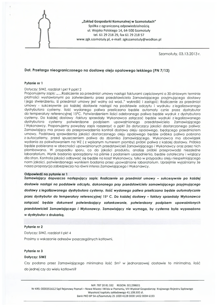 „Zakład Gospodarki Komunalnej w Szamotułach" Spółka z ograniczoną odpowiedzialnością ul. Wojska Polskiego 14, 64-500 Szamotuły tel. 61 29 218 29, fax 61 29 218 57 www .zgk.szam otuly.pl, e-mail: zgkszamotuly@ wodkan.pl Szamotuły, 03.13.2013 r. Dot. P rze ta rg u n ie o g r a n ic z o n e g o n a d o s t a w ę o le ju o p a ł o w e g o le k k i e g o (P N 7 / 1 3 ) Pytanie nr 1 Dotyczy: SIWZ. rozdział I pkt 9 ppkt 2 Proponujemy zapis:..... Rozliczenie za przedmiot umowy nastąpi fakturami częściowymi o 30-dniowym terminie płatności wystawionymi po zatwierdzeniu przez przedstawiciela Zam awiającego przyjmującego dostawy i jego stwierdzeniu, iż przedmiot umowy jest wolny od w ad..” wykreślić i zastąpić: Rozliczenie za przedmiot umowy - sukcesywnie po każdej dostawie nastąpi na podstawie odczytu i wydruku z legalizowanego dystrybutora cysterny. Ilość w ydanego paliwa przeliczana będzie autom aty cznie przez dystrybutor do tem peratury referencyjnej 15°C. Potwierdzeniem ilości odebranego paliwa będzie wydruk z dystrybutora cysterny. Do każdej dostawy -faktury sprzedaży W ykonawca załączać będzie wydruki z legalizowanego dystrybutora cysterny potwierdzone podpisem upoważnionego przedstawiciela Zam awiającego i Wykonawcy. Proponujemy powyższy zapis rozszerzyć o ppkt 2a dotyczący jakości dostarczonego paliwa: Zamawiający ma prawo do przeprowadzenia kontroli dostawy oleju opalow ego, b ę d ą ce g o przedmiotem umowy. Podstawą sprawdzenia jakości dostarczonego oleju opalow ego będzie próbka paliwa pobrana z autocysterny, przed spuszczeniem paliwa do zbiornika Zam awiającego. W ykonawca ma obowiązek w ydania za pokwitowaniem na WZ ( z wpisanym numerem plomby) próbki paliwa z każdej dostawy. Próbka będzie pobierana w obecności upoważnionych przedstawicieli Zam awiającego i W ykonawcy oraz przez nich plom bow ana. W przypadku sporu, co do jakości produktu, analizę próbki przeprowadzi niezależne laboratorium. Wynik badania sporządzony na piśmie z podaniem uzasadnienia, będzie ostateczny i wiążący dla stron. Kontrola jakości odbyw ać się będzie na koszt Wykonawcy, tylko w przypadku oleju niespełniającego norm jakości, potwierdzonego wynikiem badania przez upoważnione laboratorium. Uprzejmie wyjaśniamy że nasza propozycja zabezpiecza na równi interes Zam awiającego i Wykonawcy. O d p o w iedź na p ytanie nr 1 Z a m a w ia ją c y dopuszcza następ ujący zapis: Rozliczenie za przedmiot u m o w y - sukcesywnie p o każd ej dostawie nastqpi na podstawie odczytu, d o k o n a n e g o przy przedstawicielu z a m a w ia ją c e g o przyjm ujqcego dostawy z leg a lizo w a n e g o dystrybutora cysterny. Ilość w y d a n e g o p a liw a przeliczana b ę dzie au tom atycznie przez dystrybutor do tem peratury referencyjnej 15° C. Do k a ż d e j dostawy - faktury sprzedaży W y ko n a w ca z a łą c z a ć b ędzie d o ku m e n t po tw ie rd za ją c y zatankowanie, potwierdzony p odpisem upoważnionych przedstawicieli Z a m a w ia ją c e g o i Wykonaw cy. Z a m a w ia ją c y nie w y m a g a , by cysterna b y ła w yposażona w dystrybutor z drukarką. Pytanie nr 2 Dotyczy: SIWZ. rozdział II pkt 4 Prosimy o wskazanie adresów poszczególnych kotłowni. Pytanie nr 3 Dotyczy: SIWZ Czy podana przez Zam awiającego minimalna ilość 5m3 w jednorazowej dostawie to minimalna, ilość do jednej czy do wielu kotłowni? NIP: 787 20 81 332 REGON: 301298601 Nr KRS: 0000351612 Sąd Rejonowy Poznań - Nowe M iasto i W ilda w Poznaniu, VIII W ydział Gospodarczy Krajowego Rejestru Sądowego Wysokość kapitału zakładowego 41.108.500 zł. Bank PKO BP SA o/Szam otuły 25 1020 4128 0000 1402 0004 6193 „Zakład Gospodarki Komunalnej w Szamotułach" Spółka z ograniczoną odpowiedzialnością ul. Wojska Polskiego 14, 64-500 Szamotuły tel. 61 29 218 29, fax 61 29 218 57 w ww .zgk.szam otuly.pl, e-mail: zgkszamotuly@ wodkan.pl Pytanie nr 4: Dotyczy: SIWZ Prosimy c podanie minimalnej ilości w dostawie do poszczególnych kotłowni? O d p o w iedź na p ytanie nr 2,3,4: 1. Kotłownia 1: ul. Rynek 10, 64-500 Szamotuły (m inim alna ilość 2 m 3) 2. Kotłownia 2: M utow o 16, 64-500 Szamotuły (m inim alna ilość 3 m 3) Pytanie nr 5: Dotyczy: SIWZ Czy dostawy bę d ą łączone w jednym terminie realizacji? O d p o w ied ź na p ytan ie nr 5: Z a m a w ia ją c y nie wyklucza takiej możliwości. Pytanie nr 6: Dotyczy: SIWZ Czy Zam awiający przewiduje dostawy w soboty, święta oraz dni ustawowo wolne od pracy? W jakich godzinach będzie przyjmowane paliwo? O d p o w ied ź na p ytan ie nr 6: Z a m a w ia ją c y nie przewiduje dostaw w soboty, święta oraz w dni ustawowo w olne od pracy. Pytanie nr 7: Dotyczy: SIWZ Ponieważ Zamawiający nie sprecyzował w jakiej temperaturze zamierza odbierać paliwo, proponujemy dopisanie w § 6 projektu umowy treści: Rozliczenie dostawy nastqpi na podstawie odczytu i wydruku z legalizowanego dystrybutora cysterny. Ilość wydanego paliwa przeliczana będzie automatycznie przez dystrybutor do temperatury referencyjnej 15°C. Potwierdzeniem ilości odebranego paliwa będzie wydruk z dystrybutora cysterny. Do każdej dostawy — faktury sprzedaży Wykonawca załączać będzie wydruki z legalizowanego dystrybutora cysterny potwierdzone podpisem upoważnionego przedstawiciela Zamawiającego i Wykonawcy. Zamawiający wskazał sposób obliczania ceny dostawy cząstkowej w oparciu o cennik producenta, który ceny podaje w temperaturze referencyjnej ujednolicenie sposobu rozliczenia dostaw poprzez zastosowanie I5°C dlatego proponujemy odczytu ilości odebranego paliwa w temperaturze referencyjnej I5°C. Jest to prosty sposób na utrzymanie stałej relacji cenow ej pomiędzy ceną ofertową a ceną dostawy. NIP: 787 20 81 332 REGON: 301298601 Nr KRS: 0000351612 Sąd Rejonowy Poznań - Nowe M iasto i W ilda w Poznaniu, VIII W ydział Gospodarczy Krajowego Rejestru Sądowego Wysokość kapitału zakładowego 41