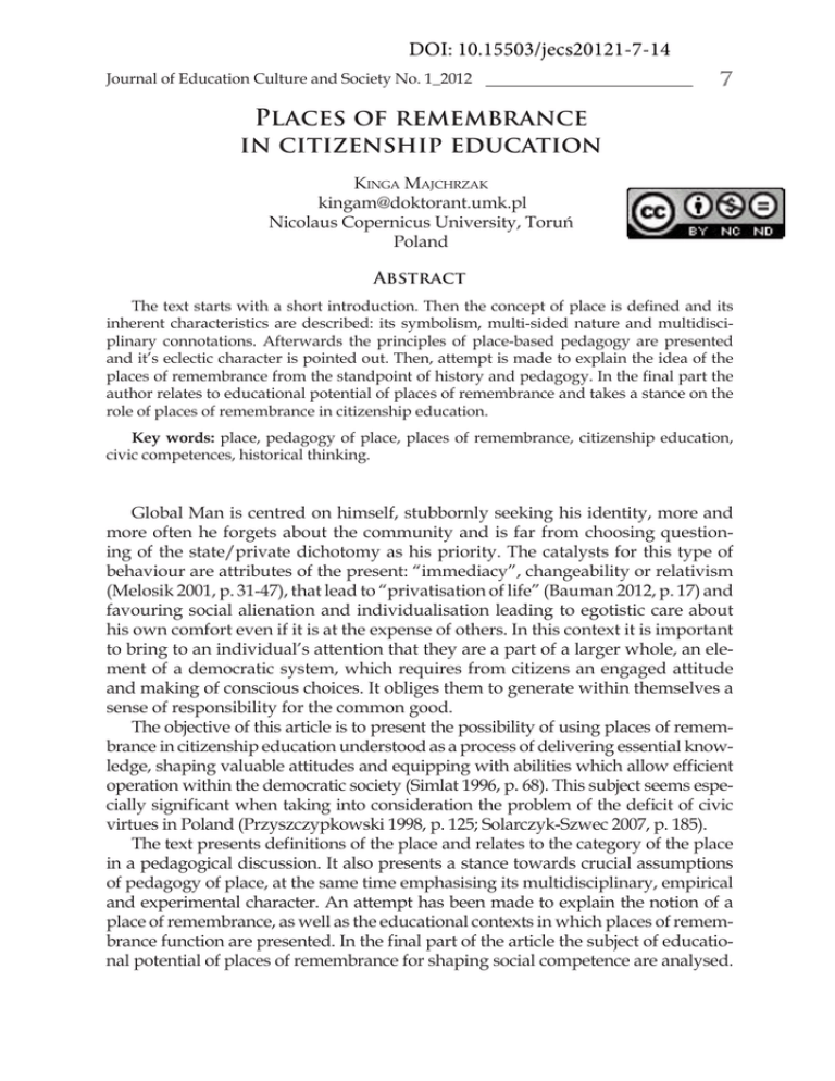 DOI: 10.15503/jecs20121-7-14 Journal of Education Culture and Society No. 1_2012 7 Places of remembrance in citizenship education KINGA MAJCHRZAK [email protected] Nicolaus Copernicus University, Toruń Poland Abstract The text starts with a short introduction. Then the concept of place is defined and its inherent characteristics are described: its symbolism, multi-sided nature and multidisciplinary connotations. Afterwards the principles of place-based pedagogy are presented and it’s eclectic character is pointed out. Then, attempt is made to explain the idea of the places of remembrance from the standpoint of history and pedagogy. In the final part the author relates to educational potential of places of remembrance and takes a stance on the role of places of remembrance in citizenship education. Key words: place, pedagogy of place, places of remembrance, citizenship education, civic competences, historical thinking. Global Man is centred on himself, stubbornly seeking his identity, more and more often he forgets about the community and is far from choosing questioning of the state/private dichotomy as his priority. The catalysts for this type of behaviour are attributes of the present: “immediacy”, changeability or relativism (Melosik 2001, p. 31-47), that lead to “privatisation of life” (Bauman 2012, p. 17) and favouring social alienation and individualisation leading to egotistic care about his own comfort even if it is at the expense of others. In this context it is important to bring to an individual’s attention that they are a part of a larger whole, an element of a democratic system, which requires from citizens an engaged attitude and making of conscious choices. It obliges them to generate within themselves a sense of responsibility for the common good. The objective of this article is to present the possibility of using places of remembrance in citizenship education understood as a process of delivering essential knowledge, shaping valuable attitudes and equipping with abilities which allow efficient operation within the democratic society (Simlat 1996, p. 68). This subject seems especially significant when taking into consideration the problem of the deficit of civic virtues in Poland (Przyszczypkowski 1998, p. 125; Solarczyk-Szwec 2007, p. 185). The text presents definitions of the place and relates to the category of the place in a pedagogical discussion. It also presents a stance towards crucial assumptions of pedagogy of place, at the same time emphasising its multidisciplinary, empirical and experimental character. An attempt has been made to explain the notion of a place of remembrance, as well as the educational contexts in which places of remembrance function are presented. In the final part of the article the subject of educational potential of places of remembrance for shaping social competence are analysed. Experience 8 A place in pedagogy One can regard the words of Yi-Fu Tuan, equating a place with safety which we are attached to, and the space with longing freedom, as an aphoristic definition of the notion of a place based on the oppositional quality towards space (Tuan 1987, p. 13). Maria Mendel (Mendel 2006, p. 26) refers to it in her discussion and so does Henryka Kwiatkowska, according to whom “the place (…); is an organised structure of meanings. In other words »places are not neutral and objective segments of physical space, but they are a territory of specifically human engagement«. (…) Places are a gift, a refuge especially for difficult times, they are the source of sense” (Kwiatkowska 2001, p. 64). Not only for H. Kwiatkowska a place is a fragment of space, which an individual identifies with by way of reflective interpretation. Also Ewa Kurantowicz, according to whom a place is “(…) realised and experienced space” (Kurantowicz 2003, p. 96), notices this characteristic. The above presented definitions oscillate around two imminent properties of a place remaining in an inseparable relation with each other: symbolism and mutual influence of places and individuals, which give them meaning (Hall 1978, p. 148; Mendel 2006, p. 9-10; Sagan 1995, p. 147). They also emphasise that the feature decisive in isolating a certain place from spatial boundlessness is its multi-faceted nature. Because a place is not an exclusively material element of space, but most of all, it has a semiotic dimension, which can be investigated both at the level of an individual and a society (Jayanandhan 2009, p. 104). The mentioned features of a place are in support of the thesis that a place can “(…) spur real passion for pedagogical activity” (Mendel 2006, p. 26). M. Mendel notices that “pedagogy of place creates, together with ontological thinking about a place, an infinity of educational possibilities. Possibility of affecting not only the pupils »directly«, but also engaging them in educational interactions by places where they occur” (Mendel 2006, p. 26). According to the researcher, the process of creating a place where the educational act occurs has all the hallmarks of education. She also claims that a place can be understood in a subjective way, it can be assigned the role of a teacher “(…) and one can talk about »an educating place«” (Mendel 2006, p. 26). Paraphrased words show that a place can be an active participant and even an originator of education. An individual that finds himself at a place with certain properties can experience a peculiar catharsis, verify former system of values or consolidate it. Therefore, pedagogical discussion about a place should go beyond identifying it with a silent witness of educational actions. Theoreticians of pedagogy of place emphasise that the understanding of this sub-discipline of pedagogy emerges from individual attributes of place anchored, among others, in: geography, history, sociology, or ecology. They emphasise the interdisciplinary, empirical and experimental character of the 
