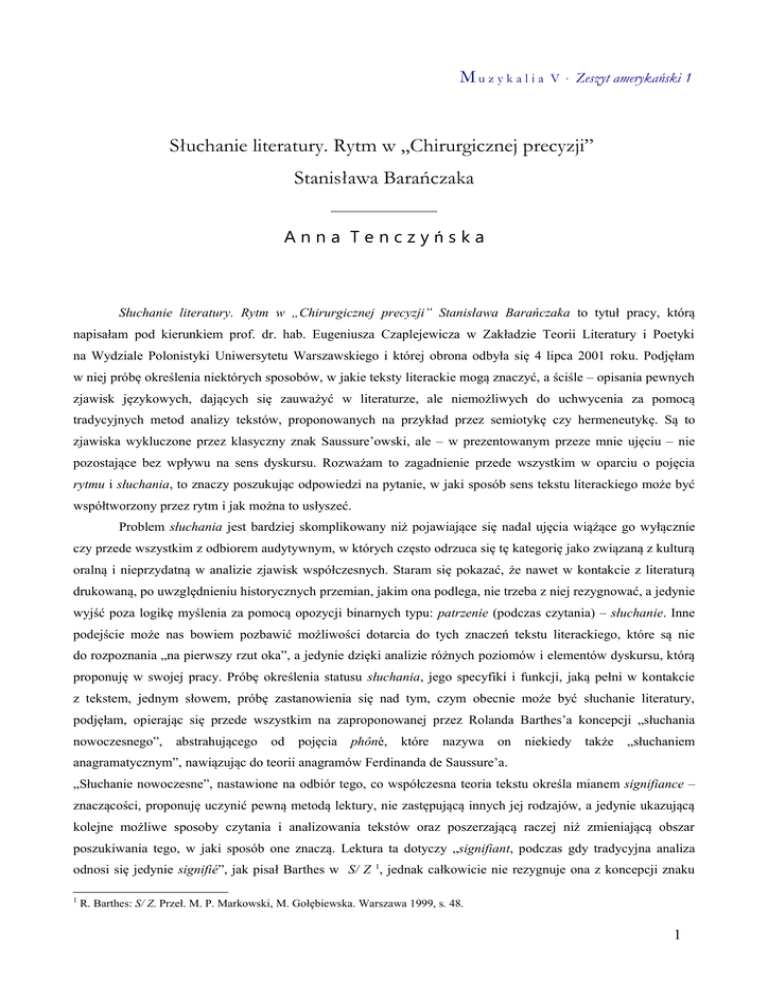 Mu z y k a l i a V · Zeszyt amerykański 1 Słuchanie literatury. Rytm w „Chirurgicznej precyzji” Stanisława Barańczaka Anna Tenczyńska Słuchanie literatury. Rytm w „Chirurgicznej precyzji” Stanisława Barańczaka to tytuł pracy, którą napisałam pod kierunkiem prof. dr. hab. Eugeniusza Czaplejewicza w Zakładzie Teorii Literatury i Poetyki na Wydziale Polonistyki Uniwersytetu Warszawskiego i której obrona odbyła się 4 lipca 2001 roku. Podjęłam w niej próbę określenia niektórych sposobów, w jakie teksty literackie mogą znaczyć, a ściśle – opisania pewnych zjawisk językowych, dających się zauważyć w literaturze, ale niemożliwych do uchwycenia za pomocą tradycyjnych metod analizy tekstów, proponowanych na przykład przez semiotykę czy hermeneutykę. Są to zjawiska wykluczone przez klasyczny znak Saussure’owski, ale – w prezentowanym przeze mnie ujęciu – nie pozostające bez wpływu na sens dyskursu. Rozważam to zagadnienie przede wszystkim w oparciu o pojęcia rytmu i słuchania, to znaczy poszukując odpowiedzi na pytanie, w jaki sposób sens tekstu literackiego może być współtworzony przez rytm i jak można to usłyszeć. Problem słuchania jest bardziej skomplikowany niż pojawiające się nadal ujęcia wiążące go wyłącznie czy przede wszystkim z odbiorem audytywnym, w których często odrzuca się tę kategorię jako związaną z kulturą oralną i nieprzydatną w analizie zjawisk współczesnych. Staram się pokazać, że nawet w kontakcie z literaturą drukowaną, po uwzględnieniu historycznych przemian, jakim ona podlega, nie trzeba z niej rezygnować, a jedynie wyjść poza logikę myślenia za pomocą opozycji binarnych typu: patrzenie (podczas czytania) – słuchanie. Inne podejście może nas bowiem pozbawić możliwości dotarcia do tych znaczeń tekstu literackiego, które są nie do rozpoznania „na pierwszy rzut oka”, a jedynie dzięki analizie różnych poziomów i elementów dyskursu, którą proponuję w swojej pracy. Próbę określenia statusu słuchania, jego specyfiki i funkcji, jaką pełni w kontakcie z tekstem, jednym słowem, próbę zastanowienia się nad tym, czym obecnie może być słuchanie literatury, podjęłam, opierając się przede wszystkim na zaproponowanej przez Rolanda Barthes’a koncepcji „słuchania nowoczesnego”, abstrahującego od pojęcia phôné, które nazywa on niekiedy także „słuchaniem anagramatycznym”, nawiązując do teorii anagramów Ferdinanda de Saussure’a. „Słuchanie nowoczesne”, nastawione na odbiór tego, co współczesna teoria tekstu określa mianem signifiance – znaczącości, proponuję uczynić pewną metodą lektury, nie zastępującą innych jej rodzajów, a jedynie ukazującą kolejne możliwe sposoby czytania i analizowania tekstów oraz poszerzającą raczej niż zmieniającą obszar poszukiwania tego, w jaki sposób one znaczą. Lektura ta dotyczy „signifiant, podczas gdy tradycyjna analiza odnosi się jedynie signifié”, jak pisał Barthes w S/ Z 1, jednak całkowicie nie rezygnuje ona z koncepcji znaku 1 R. Barthes: S/ Z. Przeł. M. P. Markowski, M. Gołębiewska. Warszawa 1999, s. 48. 1 Mu z y k a l i a V · Zeszyt amerykański 1 rozumianego jako relacja tych dwóch elementów. Obok tak pojętego słuchania zasadnicza dla mojej pracy jest teoria rytmu Henri Meschonnica. W oparciu o dokonaną przez Meschonnica krytykę rytmu rozważam problem, jakim jest zdefiniowanie tego pojęcia i odnalezienie kategorii pomocnych w jego opisaniu na gruncie teorii literatury, zwracając uwagę między innymi na kwestię jego odrębności od metrum. Wiersze Stanisława Barańczaka z tomu Chirurgiczna precyzja2, które posłużyły mi jako materiał do analizy, jeszcze „[...] czekają na swoją interpretację”, jak pisał Adorno w Teorii estetycznej3, i na historycznoliterackie ustalenia. Na pewno łatwo nie poddadzą się uogólnieniom – są zróżnicowane zarówno na poziomie formalnym, jak i tematycznym. Podtytuł, Elegie i piosenki z lat 1995-1997, naprowadza na pierwszy, raczej problematyczny, niż genologiczny, trop. Jednym z kilku tematów, który powraca w utworach składających się na najnowszy tom Barańczaka, jest kwestia przemijania, nietrwałości, śmierci. W większości utrzymane są one w tonie zwątpienia, który jednak nie narzuca się bezpośrednio, czasami ustępując miejsca pogodniejszym akcentom, w innych przypadkach przybierając postać rezygnacji, jak chociażby w zamykającym tom wierszu Płynąc na Sutton Island. Poza bogactwem językowym tych utworów, stanowiącym wartość samą w sobie, szczególną uwagę zwraca ich budowa wersyfikacyjna, a zwłaszcza silny związek z różnego rodzaju wzorcami numerycznymi. Są one tutaj traktowane asystemowo, wymiennie, chociaż wyraźnie zaznaczają swoją obecność. Regularność budowy wierszy, podkreślona przez takie zabiegi, jak np. wykorzystanie rymów wewnętrznych, została tu wzmocniona dodatkowymi rygorami formalnymi – licznymi powtórzeniami różnych elementów znaczących (całości syntaktyczne, sylaby, fonemy, odbicia głoskowe, etc.), które odgrywają istotną rolę w planie semantycznym tekstu. W swojej opinii na temat Chirurgicznej precyzji Tadeusz Nyczek4 wskazuje na „konieczność nieustannej lektury deszyfracyjnej” tego tomu – proponowana przeze mnie lektura polega na „odszyfrowywaniu” sensu tworzonego przez te właśnie elementy znaczące. Jest to sens z reguły wychodzący poza informację eksplikowaną. Wybór wierszy Stanisława Barańczaka nie był przypadkowy. Ich uważna lektura pozwala bowiem na stwierdzenie, że są one tekstami w znaczeniu, o jakim pisała Julia Kristeva, „[...] praktyką językową, w której operacje genotekstu rozpościerają się w fenotekście. Fenotekst stara się reprezentować genotekst, zapraszając czytelnika do rekonstrukcji signifiance.”5 Moja praca nie ma charakteru wyczerpującej rozprawy o mo
