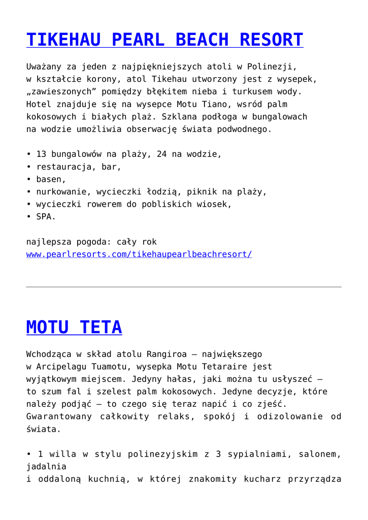 TIKEHAU PEARL BEACH RESORT Uważany za jeden z najpiękniejszych atoli w Polinezji, w kształcie korony, atol Tikehau utworzony jest z wysepek, „zawieszonych” pomiędzy błękitem nieba i turkusem wody. Hotel znajduje się na wysepce Motu Tiano, wsród palm kokosowych i białych plaż. Szklana podłoga w bungalowach na wodzie umożliwia obserwację świata podwodnego. • 13 bungalowów na plaży, 24 na wodzie, • restauracja, bar, • basen, • nurkowanie, wycieczki łodzią, piknik na plaży, • wycieczki rowerem do pobliskich wiosek, • SPA. najlepsza pogoda: cały rok www.pearlresorts.com/tikehaupearlbeachresort/ MOTU TETA Wchodząca w skład atolu Rangiroa – największego w Arcipelagu Tuamotu, wysepka Motu Tetaraire jest wyjątkowym miejscem. Jedyny hałas, jaki można tu usłyszeć – to szum fal i szelest palm kokosowych. Jedyne decyzje, które należy podjąć – to czego się teraz napić i co zjeść. Gwarantowany całkowity relaks, spokój i odizolowanie od świata. • 1 willa w stylu polinezyjskim z 3 sypialniami, salonem, jadalnia i oddaloną kuchnią, w której znakomity kucharz przyrządza posiłki, • 1 bungalow z 2-sypialniami, • nurkowanie, windsurfing, przejażdżki łodzią na pobliskie wyspy, • łowienie ryb, zbieranie muszli. najlepsza pogoda: cały rok www.yourdreamisland.com BORA BORA PEARL BEACH RESOR T & SPA Położony na wysepce Motu Tevairoa, 10 minut statkiem od legendarnej wyspy Bora Bora. • 20 bungalowów w ogrodzie z prywatnym basenem, 10 bungalowów na plaży z jacuzzi, 50 bungalowów na wodzie z dużym tarasem, • 3 restauracje, 2 bary, • basen, sporty wodne, wycieczki katamaranem, korty tenisowe, • loty helikopterem, • karmienie rekinów i płaszczek. najlepsza pogoda: cały rok www.pearlresorts.com/bora LE TAHA’A ISLAND RESOR T & SPA Położony na prywatnej wysepce 5 minut drogi statkiem od wyspy Taha’a, leżącej w Archipelagu Wysp Towarzystwa, 230 km na zachód od Tahiti. Taha’a często zwana jest wyspą waniliową, ponieważ rocznie produkuje 25 ton tego cennego specjału. Taha’a to także wyspa, gdzie ludzie żyją w pełnej harmonii z niezwykle piękną, bogatą i dziewiczą przyrodą. • • • • • • • 48 przestronnych bungalowów na wodzie, 12 willi na plaży z prywatnym basenem i ogrodem, 3 restauracje, 2 bary, basen, sporty wodne, kort tenisowy, loty helikopterem na Bora Bora, wycieczki jeepem po wyspie, łowienie ryb, nurkowanie, wspaniałe SPA. najlepsza pogoda: cały rok www.letahaa.com PACIFIC RESORT RAROTONGA Położony na południowo-wschodnim wybrzeżu największej wyspy archipelagu – Rarotonga, przy krystalicznie czystej i bezpiecznej zatoce Muri. Spokojne, leniwe dni można spędzić wylegując się na białej plaży i kąpiąc w ciepłych wodach Pacyfiku, by nocami tańczyć i bawić się w okolicznych wioskach. • • • • 56 komfortowych bungalowów, 8 willi z 2-3 sypialniami, restauracja, bar, basen, masaże, nurkowanie, sporty wodne, wycieczki w interior wyspy. najlepsza pogoda: maj – październik www.pacificresort.com PACIFIC RESORT AITUTAKI W trakcie 40 minutowego lotu z Raratonga na Aitutaki można podziwiać niezwykle piękne laguny, których kolor przechodzi z jasnoturkusowego poprzez szmaragdowy do indygo. • • • • • 24 luksusowe bungalowy położone na plaży, 3 wille, restauracja, bar, basen, SPA, wycieczki na rowerach lub skuterach, nurkowanie, przejażdżki łodzią, łowienie ryb. najlepsza pogoda: cały rok www.aitutaki.pacificresort.com TURTLE ISLAND Bujna roślinność, białe plaże, niesamowicie błękitne wody oceanu zostały uwiecznione na filmie „Blue Lagoon”. Romantyczne pikniki na jednej z 14 dziewiczych plaż wyspy, egzotyczna przyroda, kąpiele w krystalicznie czystych lagunach, malownicze zachody słońca mogą być wspaniałą scenerią podróży poślubnych. • 14 willi 2-pokojowych, • śniadania podawane na tarasie willi, romantyczne zachodzie słońca, pikniki na plaży, wyrafinowane i urozmaicone duży wybór win, • nurkowanie z maską lub z butlami, łowienie ryb morzu, przejażdżki łodzià, piknik na plaży, wycieczki wspinaczka górska, masaże. kolacje o menu oraz na pełnym rowerem, najlepsza pogoda: kwiecień – wrzesień www.turtlefiji.com THE WAKAYA CLUB & SPA Położony na prywatnej wysepce Wakaya, otoczonej rafą koralową. Intymność, dziewicze plaże, spokoje laguny, majestatyczne klify – magią tego miejsca czuje się od momentu wylądowania na wyspie. • 10 ekskluzywnych bungalowów, 1 luksusowa willa z 3 sypialniami, • znakomita restauracja, bar, • basen, piknik na plaży, pole golfowe 9 dołków, korty tenisowe, SPA. najlepsza pogoda: kwiecień – wrzesień www.wakaya.com KONA VILLAGE RESORT Leży na Dużej Wyspie Hawaii, na wybrzeżu Kohala, gdzie piaszczyste, białe plaże przeplatają się z ciemnymi, wulkanicznymi skałami. Niezwykłą atrakcją jest jeden z największych wulkanów świata – Mauna Kea – 4205 m n.p.m., na którego ośnieżonym szczycie znajduje się obserwatorium astronomiczne. Mało jest miejsc na świecie, skąd w ciągu niespełna dwóch godzin z tropikalnej, nadmorskiej plaży można dotrzeć na 4-tysięczny ośnieżony szczyt. W Kona Village mieszka słynny artysta Jon Lomberg, którego prace znane są na całym świecie. • • • • • 125 komfortowych bungalowów w stylu hawajskim, basen, korty tenisowe, sporty wodne, obserwacja gwiazd z Jonem Lombergiem, obserwacja wielorybów (grudzień – kwiecień), wycieczki do Parku Narodowego Hawaii Volcanoes. najlepsza pogoda: maj – październik www.konavillage.com www.jonlomberg.com HOTEL HANA-MAUI & HONUA SPA Położony na wschodnim wybrzeżu wyspy Maui, z dala od zgiełku dużych hoteli. Wspaniałe widoki, spokój i znakomite SPA stwarzają idealną atmosferę do romantycznego wypoczynku. • • • • 47 pokoi, 7 apartamentów, 2 baseny, 2 jacuzzi, nurkowanie, korty tenisowe, joga, przejażdżki konne, SPA. najlepsza p