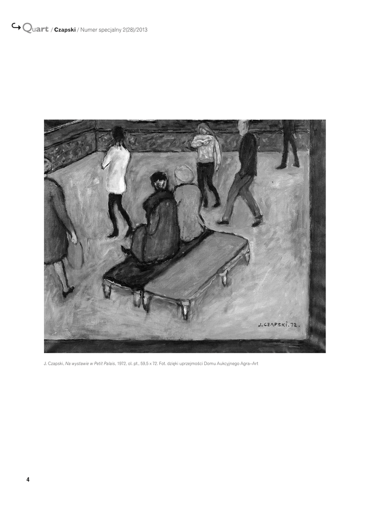 ↪Quart / Czapski / Numer specjalny 2(28)/2013 J. Czapski, Na wystawie w Petit Palais, 1972, ol. pł., 59,5 x 72. Fot. dzięki uprzejmości Domu Aukcyjnego Agra–Art 4 W a l d e m a r O k o ń / Czapski – wprowadzenie Czapski – wprowadzenie* Waldemar Okoń …znowu widzę, oddycham oczami Józef Czapski Witam wszystkich Państwa najserdeczniej i zapewniam, że moje wystąpienie będzie bardzo krótkie, ponieważ obecność tak wielu referentów i znawców działań artystycznych Józefa Czapskiego wręcz mnie – jako nieznawcę, a zaledwie odległego i cokolwiek zagubionego w gąszczu niesionych przez nią sensów widza tej sztuki – onieśmiela. Pomimo tego onieśmielenia cieszę się jednak ogromnie, że w dzisiejszym trudnym i zmerkantylizowanym świecie udało się nam spotkać i, jak rozumiem, do dosyć sporej już – jeżeli tak to można określić – „czapskologii” dołączyć kolejne rozdziały, potwierdzające, mam nadzieję, nie tylko historyczną wagę tej spuścizny. Czapski tworzył przez całe życie – możliwości materii, jaką się posługiwał – wykorzystując często do bólu i do granic, swoisty Album Orbis, złożony z setek tomów słowno-obrazowych notatek i, związanych z nimi integralnie, bardziej lub mniej autonomicznych obrazów. Bliski był w tym względzie jednemu ze swoich ulubionych autorów – Cyprianowi Kamilowi Norwidowi; on działał podobnie, notując, rysując i gromadząc przez całe dziesięciolecia, aż do swej śmierci w roku 1883, materiały będące absolutnie wyjątkową kroniką naszej cywilizacji i zarazem jedną z realizacji pamiętnika artysty „wieku kupieckiego i przemysłowego”, który to pamiętnik, według słynnego określenia Norwida, winien być „Ogryzmolony i w siebie pochylon – / Obłędny!... ależ – wielce rzeczywisty” 1. Piszę o tym, ponieważ nieco zapomnieliśmy, że w tym roku przypada także w miarę okrągła, 130 rocznica śmierci autora Vade-mecum, ale przede wszystkim dlatego, że w obfitej już literaturze poświęconej Czapskiemu nieco zabrakło mi jednego słowa-klucza, które – być może – wiele by nam wyjaśniło: słowa „romantyzm”. Zapatrzeni w kapistów, kolorystów, awangardzistów, a nawet pop-artystów (Czapski jako prekursor pop-artu – pisał o tym Konstanty „Kot” Jeleński w 1964 r 2) etc., etc., zapominamy, jak mi się wydaje, że epoka, w jakiej urodził się nasz artysta, przesycona była ideami romantycznymi, głoszącymi, iż „Cała plastyki tajemnica / Tylko w tym jednym jest, / Że duch – jak błyskawica. / * Niniejszy tekst stanowi transkrypcję wystąpienia otwierającego konferencję. 1 C. K. Norwid, Klaskaniem mając obrzękłe prawice, [w:] idem , Pisma wybrane, wyb., oprac. J. W. Gomulicki, t. 1: Wiersze, Warszawa 1968, s. 192; zob. też: P. Chlebowski, Romantyczna silva rerum. O Norwidowym „Albumie Orbis”, Lublin 2009. 2 Zob. K. A. Jeleński, Aktualność malarstwa Józefa Czapskiego, [w:] Czapski i krytycy. Antologia tekstów, wyb., oprac. M. Kitowska-Łysiak, M. Ujma, Lublin 1996, s. 43 n. 5 ↪Quart / Czapski / Numer specjalny 2(28)/2013 A chce go ująć gest”. I dalej – by zachować wysoki Norwidowski ton: „Prawdziwych szkiców robić nie można umyślnie – one się same narzucają. Odpycha się je piórem lub ołówkiem i zostaje ślad, notatka, szkic. Są to dlatego karteczki i złamki […]. Atoli żaden fotograf nie zastąpi prawdziwego szkicu” 3. Ta druga konstatacja poety, z 1874 r., jest dla nas bardzo istotna, ponieważ śledząc dzieła i wypowiedzi Czapskiego, nieustannie spotykamy się z ową, odnotowaną przez niego słowem i obrazem, „wewnętrzną koniecznością” dzieła, będącą swoistym imperatywem, który „wywołuje” je z tajemniczej sfery jakże romantycznych w gruncie rzeczy natchnień i momentalnych wizji. Do nich zaś artysta stara się dotrzeć poprzez mozolną, wytężoną, wieloletnią pracę, będąc jednocześnie w pełni świadomym, iż ów mozół jest w swej istocie zaprzeczeniem tego, co powinno być przejawem czystej spontaniczności oraz formą Łaski – i to tej niemal objawionej, pisanej, jak u mistyków i u romantyków, dużą literą. Stąd poetyka fragmentu, owych tysięcy „karteczek i złamków”, szkiców przygotowawczych do dzieł nigdy nie powstałych. Stąd też posiłkowanie się naturą, poprawianą nie przez nią samą, jak chcieli wszyscy rasowi akademicy, ale poprzez materię obrazu i słowa, które nigdy do końca materialne być nie mogą. Ze względu na ograniczone ramy mojego wystąpienia nie chcę mnożyć cytatów, ale wydaje mi się, że dwa fragmenty tekstów Czapskiego wiele nam tu wyjaśniają – na marginesie: podobnie jak Norwid, Czapski był znakomitym, o ile nie najlepszym, komentatorem swoich dzieł, objawiając w ten sposób – jakże romantyczną w swej istocie, ale pogłębioną o zrozumienie praw rządzących „wiekiem kupieckim i przemysłowym” – zdolność w „siebie pochylonej”, wręcz obsesyjnej autoanalizy. W Liście do młodego malarza pisał wprost: „Pamiętaj, że wrócenie do wizji pierwotnej nigdy nie nasyci ostatecznie malarza. Ta wizja pierwotna jest łaską. Wszystko, co zrobisz, zda ci się złe, bo obciążone myślą i wolą. […] nigdy nie dorównasz wizji, która przychodzi do nas. Musimy przyjąć naszą wobec niej nędzę” 4 . W innym zaś fragmencie, by rzecz nieco ukonkretnić, czytamy: „Naprzeciwko kawiarni »Bichette« w szarą pogodę. Rowery na tle zielonkawej ściany i czarnej jamy wnętrza kawiarni z naprzeciwka. Co w tym nowego? Nowe, że widzę coraz dobitniej, jakby namacalnie konkretniej (zresztą nadal te wizje, gdy tylko mi się zdaje, że je już dosięgam na własnym płótnie – uciekają dalej i dalej jak fatamorgany)” 5. Dzieło jawi się zatem jako próba zapisu niemożliwej do uchwycenia „rzeczywistości totalnej”, funkcjonującej niejako poza dobrem i złem, w sferze form wizualnych