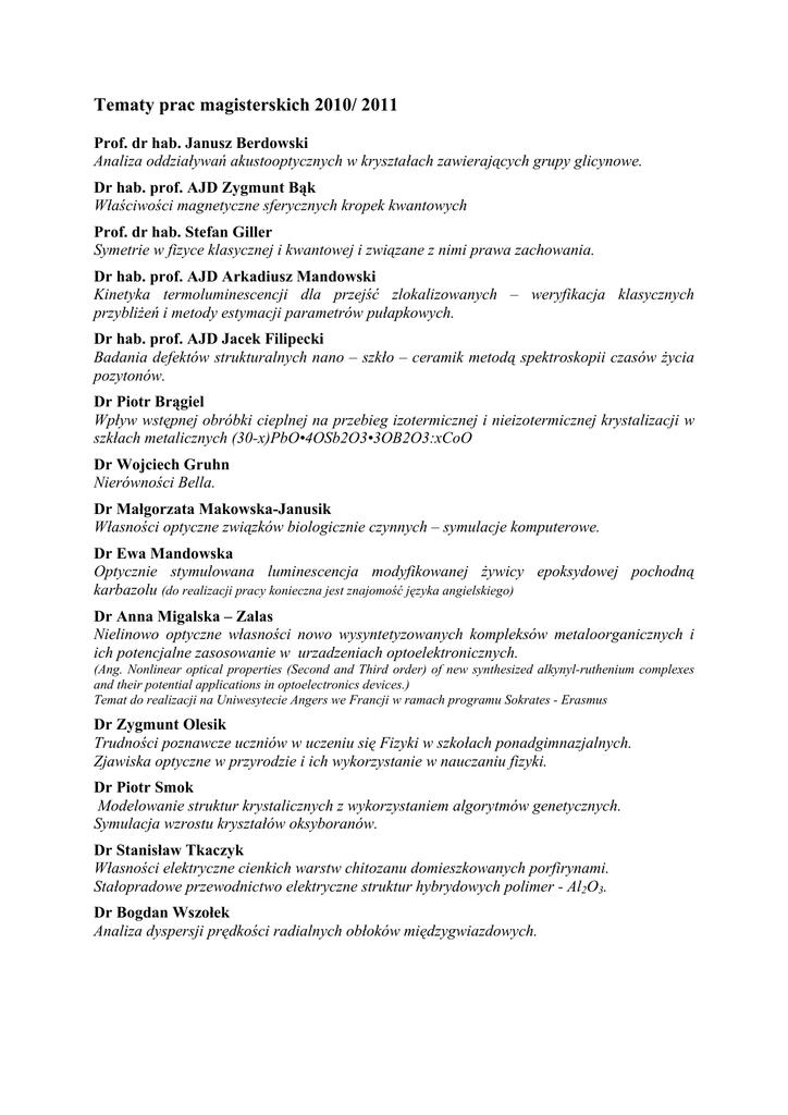 Tematy prac magisterskich 2010/ 2011 Prof. dr hab. Janusz Berdowski Analiza oddziaływań akustooptycznych w kryształach zawierających grupy glicynowe. Dr hab. prof. AJD Zygmunt Bąk Właściwości magnetyczne sferycznych kropek kwantowych Prof. dr hab. Stefan Giller Symetrie w fizyce klasycznej i kwantowej i związane z nimi prawa zachowania. Dr hab. prof. AJD Arkadiusz Mandowski Kinetyka termoluminescencji dla przejść zlokalizowanych – weryfikacja klasycznych przybliżeń i metody estymacji parametrów pułapkowych. Dr hab. prof. AJD Jacek Filipecki Badania defektów strukturalnych nano – szkło – ceramik metodą spektroskopii czasów życia pozytonów. Dr Piotr Brągiel Wpływ wstępnej obróbki cieplnej na przebieg izotermicznej i nieizotermicznej krystalizacji w szkłach metalicznych (30-x)PbO•4OSb2O3•3OB2O3:xCoO Dr Wojciech Gruhn Nierówności Bella. Dr Małgorzata Makowska-Janusik Własności optyczne związków biologicznie czynnych – symulacje komputerowe. Dr Ewa Mandowska Optycznie stymulowana luminescencja modyfikowanej żywicy epoksydowej pochodną karbazolu (do realizacji pracy konieczna jest znajomość języka angielskiego) Dr Anna Migalska – Zalas Nielinowo optyczne własności nowo wysyntetyzowanych kompleksów metaloorganicznych i ich potencjalne zasosowanie w urzadzeniach optoelektronicznych. (Ang. Nonlinear optical properties (Second and Third order) of new synthesized alkynyl-ruthenium complexes and their potential applications in optoelectronics devices.) Temat do realizacji na Uniwesytecie Angers we Francji w ramach programu Sokrates - Erasmus Dr Zygmunt Olesik Trudności poznawcze uczniów w uczeniu się Fizyki w szkołach ponadgimnazjalnych. Zjawiska optyczne w przyrodzie i ich wykorzystanie w nauczaniu fizyki. Dr Piotr Smok Modelowanie struktur krystalicznych z wykorzystaniem algorytmów genetycznych. Symulacja wzrostu kryształów oksyboranów. Dr Stanisław Tkaczyk Własności elektryczne cienkich warstw chitozanu domieszkowanych porfirynami. Stałopradowe przewodnictwo elektryczne struktur hybrydowych polimer - Al2O3. Dr Bogdan Wszołek Analiza dyspersji prędkości radialnych obłoków międzygwiazdowych.