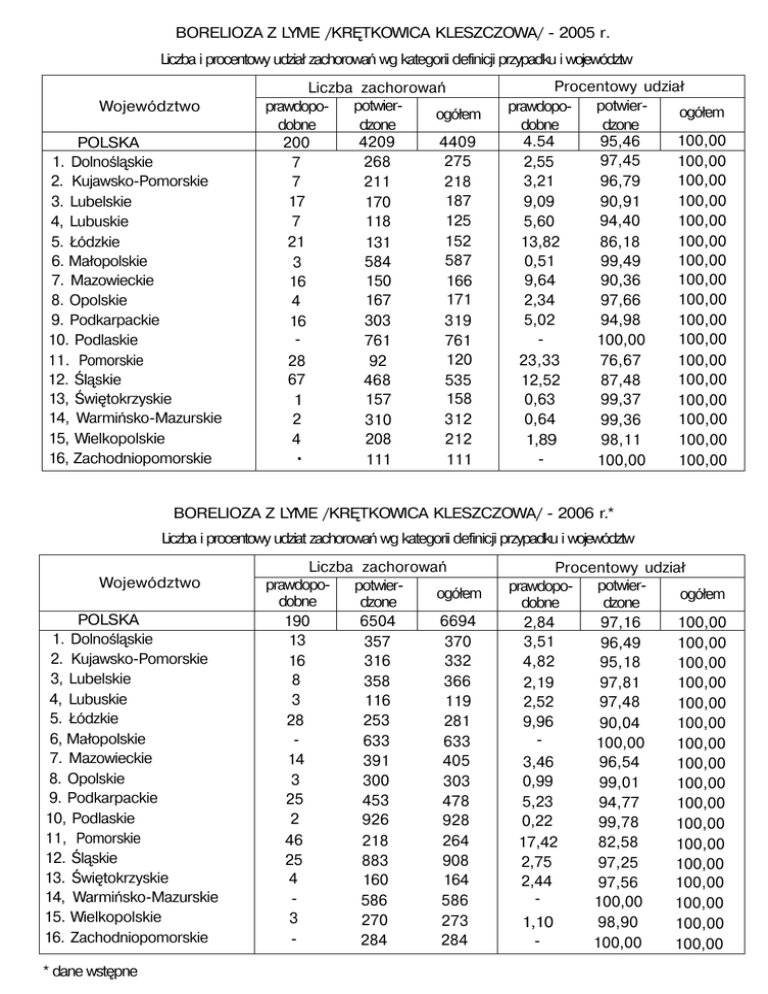 BORELIOZA Z LYME /KRĘTKOWICA KLESZCZOWA/ - 2005 r. Liczba i procentowy udział zachorowań wg kategorii definicji przypadku i województw Województwo POLSKA 1. Dolnośląskie 2. Kujawsko-Pomorskie 3. Lubelskie 4, Lubuskie 5. Łódzkie 6. Małopolskie 7. Mazowieckie 8. Opolskie 9. Podkarpackie 10. Podlaskie 11. Pomorskie 12. Śląskie 13, Świętokrzyskie 14, Warmińsko-Mazurskie 15, Wielkopolskie 16, Zachodniopomorskie Liczba zachorowań potwierprawdopoogółem dobne dzone 4409 4209 200 275 268 7 7 218 211 187 17 170 125 118 7 152 21 131 587 584 3 150 166 16 171 167 4 303 319 16 761 761 120 28 92 67 468 535 158 157 1 2 312 310 4 208 212 • 111 111 Procentowy udział prawdopo- potwierogółem dobne dzone 100,00 4.54 95,46 97,45 100,00 2,55 100,00 3,21 96,79 100,00 9,09 90,91 94,40 100,00 5,60 100,00 13,82 86,18 100,00 0,51 99,49 100,00 9,64 90,36 100,00 2,34 97,66 5,02 94,98 100,00 100,00 100,00 76,67 100,00 23,33 100,00 12,52 87,48 0,63 99,37 100,00 100,00 0,64 99,36 1,89 98,11 100,00 100,00 100,00 BORELIOZA Z LYME /KRĘTKOWICA KLESZCZOWA/ - 2006 r.* Liczba i procentowy udziat zachorowań wg kategorii definicji przypadku i województw Województwo POLSKA 1. Dolnośląskie 2. Kujawsko-Pomorskie 3, Lubelskie 4, Lubuskie 5. Łódzkie 6, Małopolskie 7. Mazowieckie 8. Opolskie 9. Podkarpackie 10, Podlaskie 11, Pomorskie 12. Śląskie 13. Świętokrzyskie 14, Warmińsko-Mazurskie 15. Wielkopolskie 16. Zachodniopomorskie * dane wstępne Liczba zachorowań prawdopo potwier ogółem dobne dzone 190 6504 6694 13 357 370 16 316 332 8 366 358 3 116 119 28 253 281 633 633 14 391 405 3 300 303 25 453 478 2 926 928 46 218 264 25 883 908 4 160 164 586 586 3 270 273 284 284 Procentowy udział prawdopo potwierogółem dobne dzone 2,84 97,16 100,00 3,51 96,49 100,00 4,82 95,18 100,00 2,19 97,81 100,00 2,52 97,48 100,00 9,96 90,04 100,00 100,00 100,00 3,46 96,54 100,00 0,99 99,01 100,00 5,23 94,77 100,00 0,22 99,78 100,00 17,42 82,58 100,00 2,75 97,25 100,00 2,44 97,56 100,00 100,00 100,00 1,10 98,90 100,00 100,00 100,00 BORELIOZA Z LYME /KRĘTKOWICA KLESZCZOWA/ - 2005 r. zachorowań (w kwartałach i ogółem), zapadalność oraz liczba i procent hospitalizowanych wg województw Województwo POLSKA 1. Dolnośląskie 2, Kujawsko-Pomorskie 3. Lubelskie 4. Lubuskie 5. Łódzkie 6. Małopolskie 7. Mazowieckie 8, Opolskie 9. Podkarpackie 10. Podlaskie 11. Pomorskie 12. Śląskie 13. Świętokrzyskie 14, Warmińsko-Mazurskie 15. Wielkopolskie 16. Zachodniopomorskie Liczba zachorowań w kwartałach I 578 44 20 28 4 36 40 23 26 42 104 21 81 16 51 24 18 II 627 37 32 23 8 32 63 11 26 42 156 11 57 32 62 25 10 III 1450 89 78 70 38 42 244 61 64 124 197 46 176 36 95 63 27 IV 1754 105 88 66 75 42 240 71 55 111 304 42 221 74 104 100 56 Liczba zachorowań w roku Zapadalność (na 100 tyś.) Liczba % 4409 275 218 187 125 152 587 166 171 319 761 120 535 158 312 212 111 11,5 9,5 10,5 8,6 12,4 5,9 18,0 3,2 16,3 15,2 63,4 5,5 11,4 12,3 21,8 6,3 6,6 1763 170 51 130 9 103 83 42 65 112 415 64 165 65 166 65 58 39,99 61,82 23,39 69,52 7,20 67,76 14,14 25,30 38,01 35,11 54,53 53,33 30,84 41,14 53,21 30,66 52,25 Hospitalizacja BORELIOZA Z LYME /KRĘTKOWICA KLESZCZOWA/ - 2006 r.* Liczba zachorowań (w kwartałach i ogółem), zapadalność oraz liczba i procent hospitalizowanych wg województw Województwo POLSKA 1. Dolnośląskie 2, Kujawsko-Pomorskie 3, Lubelskie 4. Lubuskie 5. Łódzkie 6. Małopolskie 7. Mazowieckie S. Opolskie 9. Podkarpackie 10. Podlaskie 11. Pomorskie 12, Śląskie 13, Świętokrzyskie 14. Warmińsko-Mazurskie 15. Wielkopolskie 16. Zachodniopomorskie * dane wstępne Liczba zachorowań w kwartałach I 953 64 28 76 9 46 55 31 41 74 201 19 120 17 87 39 46 II 904 56 24 71 12 46 74 17 36 76 171 9 152 31 71 34 24 III 1869 113 104 84 39 85 243 98 93 157 236 92 183 45 158 80 59 IV 2968 137 176 135 59 104 261 259 133 171 320 144 453 71 270 120 155 Liczba zachorowań w roku Zapadalność (na 100 tyś.) Liczba % 6694 370 332 366 119 281 633 405 303 478 928 264 908 164 586 273 284 17,5 12,8 16,1 16,8 11,8 10,9 19,4 7,8 29,0 22,8 77,5 12,0 19,4 12,8 41,1 8,1 16,8 2261 217 71 199 7 158 107 100 71 170 320 81 269 67 198 104 122 33,78 58,65 21,39 54,37 5,88 56,23 16,90 24,69 23,43 35,56 34,48 30,68 29,63 40,85 33,79 38,10 42,96 Hospitalizacja