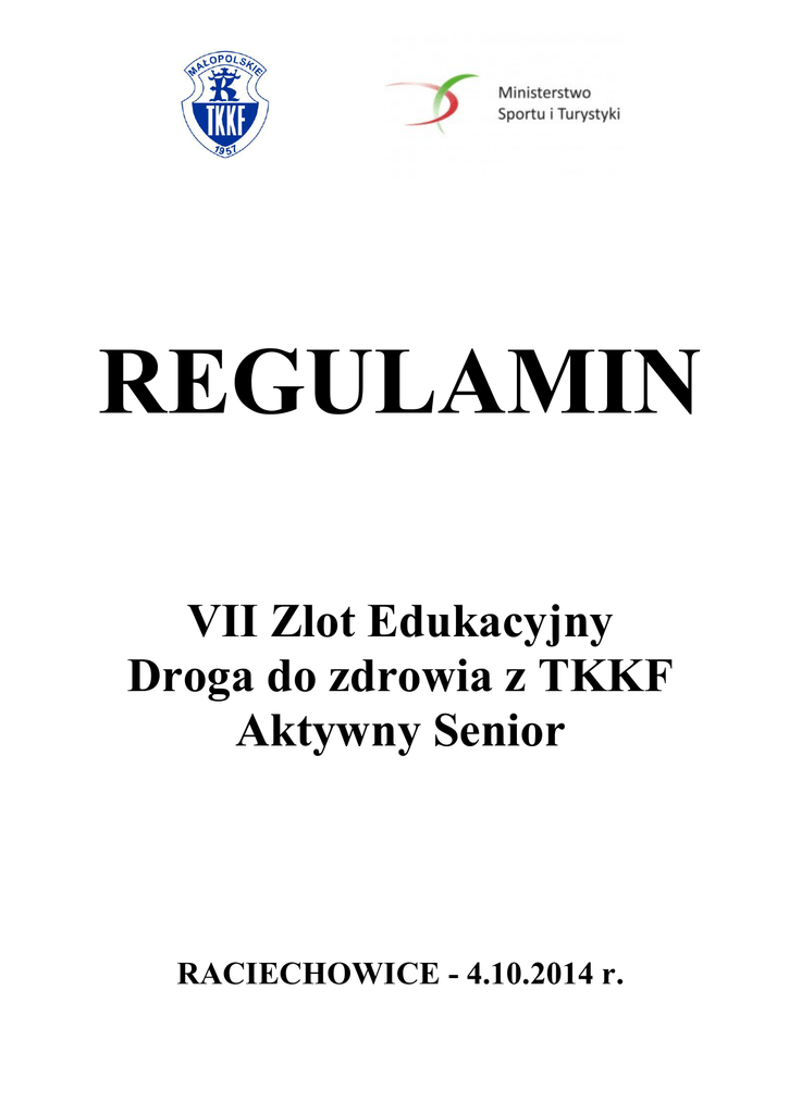 REGULAMIN VII Zlot Edukacyjny Droga do zdrowia z TKKF Aktywny Senior RACIECHOWICE - 4.10.2014 r. REGULAMIN VII Zlotu edukacyjnego „Droga do zdrowia z TKKF – Aktywny Senior „ - Raciechowice – 4.10.2014 r. - I. Cel: - promocja zdrowego stylu życia, tworzenie wzorców zachowań w zakresie aktywności fizycznej oraz nawiązywanie związków między ruchem a zachowaniem człowieka - prezentacja programu oraz bezpośredni udział uczestników w różnych formach rekreacji ruchowej - wymiana doświadczeń , nawiązanie kontaktów koleżeńskich pomiędzy uczestnikami z różnych środowisk II. Organizator: > Małopolskie Towarzystwo Krzewienia Kultury Fizycznej – Zarząd Wojewódzki w Krakowie III. Partnerzy: > Ministerstwo Sportu i Turystyki IV. Wsparcie medialne: > Dziennik Polski V. Termin i miejsce: 1. Termin – 4.10.2014 (sobota) 2. Miejsce: Raciechowice VI. Program 9:00 – przyjazd uczestników (należy zjawić się do godz. 9:30) 9:00 do 10:00 – Biuro Zawodów na parkingu koło kościoła: rejestracja uczestników, wypożyczenie kijów Nordic Walking 10:15 – uroczyste otwarcie imprezy przy kościele 10:30 – zbiórka uczestników, instruktaż prawidłowej techniki chodzenia z kijami Nordic Walking i rozgrzewka 10:50 – 12:00 marsz z kijami Nordic Walking 12:00 do 14:30 – Biały namiot: Spotkanie z lekarzem Pomiar ciśnienia Badanie poziomu cholesterolu i cukru Ważenie Testy sprawnościowe 12:30 – zapisy do Trójboju Seniora 12:30 do 15:00 – wydawanie posiłku 12:30 do 15:00 Trójbój Seniora o tytuł „Najsprawniejszej Seniorki” i „Najsprawniejszego Seniora” Małopolskiego TKKF wg odrębnego regulaminu 12:30 do 15:45 – muzyka 15:45 – ogłoszenie wyników i wręczenie pucharów oraz nagród 16:15 – zakończenie imprezy i wyjazd uczestników VII. Warunki uczestnictwa VIII. W Zlocie udział biorą osoby po 50 roku życia Uczestnicy mają obowiązek stosowania się do poleceń organizatorów Uczestników obowiązuje wygodne obuwie i strój sportowy Mile widziani uczestnicy z kijami nordic walking Uczestnicy za okazaniem dowodu osobistego mogą wypożyczyć kije nordic walking. Zgłoszenia i zapisy Grupy zorganizowane do dnia 02.10.2014 r. na adres e-mail: [email protected] na załączonym formularzu lub telefonicznie: 12 633-26-62, 506-477-006 (listę uczestników należy zarejestrować w dniu imprezy w Biurze Zawodów do godz. 10:00 Osoby indywidualne w Biurze Zawodów do godz. 10:00 IX. Nagrody Za zajęcie I miejsca w Trójboju Seniora – puchary, dyplomy i nagrody rzeczowe Za zajęcie II i III miejsca w Trójboju Seniora – dyplomy i nagrody rzeczowe X. Postanowienia końcowe Uczestników Zlotu i Trójboju Seniora obowiązują zasady „fair play” oraz niniejszy regulamin Opiekę medyczną zapewniają organizatorzy Uczestnicy startują na własną odpowiedzialność Uczestnicy dodatkowo mogą ubezpieczyć się od OC i/lub NNW Organizatorzy nie ponoszą odpowiedzialności za straty materialne powstałe w trakcie trwania imprezy Uczestnicy mają obowiązek zapoznać się z regulaminem imprezy wraz z regulaminem Trójboju Seniora do niego załączonymi Uczestnicy imprezy są zobowiązani do przestrzegania niniejszego regulaminu, ogólnych zasad bezpieczeństwa i stosowania się do poleceń organizatorów Uczestnicy podpisując listę startową akceptują poniższą klauzulę: Organizatorzy i wszystkie osoby z nim współpracujące, a także osoby związane z przeprowadzeniem i organizacją imprezy nie ponoszą odpowiedzialności względem uczestników za szkody osobowe, rzeczowe i majątkowe, które wystąpią przed, w trakcie lub po imprezie. Uczestnicy startują na własną odpowiedzialność. Uczestnicy ponoszą odpowiedzialność cywilną i prawną za wszystkie szkody, wyrządzone z własnej winy. Przez akceptację niniejszej deklaracji uczestnicy zrzekają się prawa dochodzenia prawnego lub zwrotnego od organizatorów lub jego zleceniobiorców w razie wypadku lub szkody związanej z imprezą. Przyjmuję do wiadomości, że w razie wypadku nie mogę wnosić żadnych roszczeń w stosunku do organizatora. Przyjmuję do wiadomości, że należy przestrzegać zarządzeń służb porządkowych. Zgadzam się z warunkami uczestnictwa. Zdjęcia, nagrania filmowe, wywiady, relacje z wydarzenia z moją osobą mogą być wykorzystane przez prasę, radio, telewizję i internet. Wyrażam zgodę na przetwarzanie moich danych osobowych i mojego wizerunku zgodnie z ustawą z dnia 29 sierpnia 1997r. o ochronie danych osobowych (Dz. U. Nr 133, poz.883) i Art. 81. UstPrAut. Organizatorzy zastrzegają sobie prawo ostatecznej interpretacji niniejszego regulaminu wraz z regulaminami do niego załączonymi ORGANIZATOR