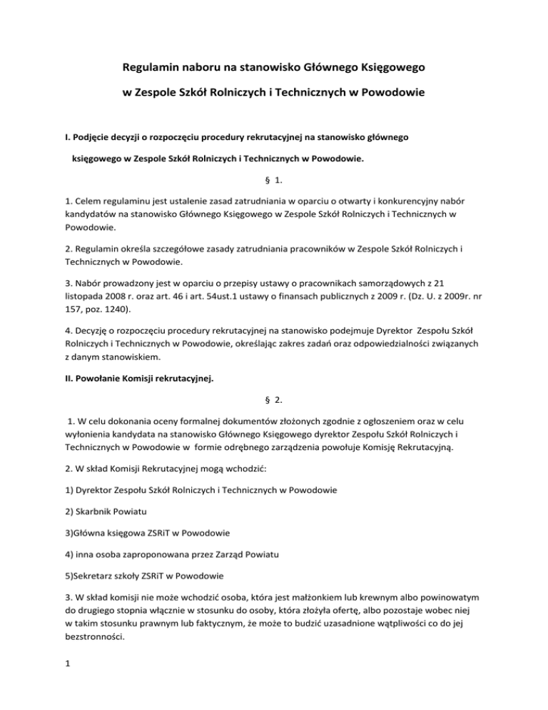 Regulamin naboru na stanowisko Głównego Księgowego w Zespole Szkół Rolniczych i Technicznych w Powodowie I. Podjęcie decyzji o rozpoczęciu procedury rekrutacyjnej na stanowisko głównego księgowego w Zespole Szkół Rolniczych i Technicznych w Powodowie. § 1. 1. Celem regulaminu jest ustalenie zasad zatrudniania w oparciu o otwarty i konkurencyjny nabór kandydatów na stanowisko Głównego Księgowego w Zespole Szkół Rolniczych i Technicznych w Powodowie. 2. Regulamin określa szczegółowe zasady zatrudniania pracowników w Zespole Szkół Rolniczych i Technicznych w Powodowie. 3. Nabór prowadzony jest w oparciu o przepisy ustawy o pracownikach samorządowych z 21 listopada 2008 r. oraz art. 46 i art. 54ust.1 ustawy o finansach publicznych z 2009 r. (Dz. U. z 2009r. nr 157, poz. 1240). 4. Decyzję o rozpoczęciu procedury rekrutacyjnej na stanowisko podejmuje Dyrektor Zespołu Szkół Rolniczych i Technicznych w Powodowie, określając zakres zadań oraz odpowiedzialności związanych z danym stanowiskiem. II. Powołanie Komisji rekrutacyjnej. § 2. 1. W celu dokonania oceny formalnej dokumentów złożonych zgodnie z ogłoszeniem oraz w celu wyłonienia kandydata na stanowisko Głównego Księgowego dyrektor Zespołu Szkół Rolniczych i Technicznych w Powodowie w formie odrębnego zarządzenia powołuje Komisję Rekrutacyjną. 2. W skład Komisji Rekrutacyjnej mogą wchodzić: 1) Dyrektor Zespołu Szkół Rolniczych i Technicznych w Powodowie 2) Skarbnik Powiatu 3)Główna księgowa ZSRiT w Powodowie 4) inna osoba zaproponowana przez Zarząd Powiatu 5)Sekretarz szkoły ZSRiT w Powodowie 3. W skład komisji nie może wchodzić osoba, która jest małżonkiem lub krewnym albo powinowatym do drugiego stopnia włącznie w stosunku do osoby, która złożyła ofertę, albo pozostaje wobec niej w takim stosunku prawnym lub faktycznym, że może to budzić uzasadnione wątpliwości co do jej bezstronności. 1 4. Komisja Rekrutacyjna działa do czasu zakończenia procedury naboru na wolne stanowisko pracy. III. Etapy naboru. § 3. 1. Ogłoszenie o naborze powinno zawierać: 1) adres jednostki; 2) określenie stanowiska; 3) określenie wymagań związanych ze stanowiskiem, zgodnie z opisem danego stanowiska, ze wskazaniem, które z nich są niezbędne, a które dodatkowe; 4) wskazanie zakresu zadań wykonywanych na stanowisku; 5) wskazanie wymaganych dokumentów; 6) określenie terminu i miejsca składania dokumentów. - termin do składania dokumentów określony w ogłoszeniu o naborze, nie może być krótszy niż 10 dni od dnia opublikowania tego ogłoszenia. 2. Składanie dokumentów aplikacyjnych. 3. Wstępna selekcja – analiza dokumentów aplikacyjnych. 4. Ogłoszenie listy kandydatów, którzy spełniają wymogi formalne. 5. Selekcja końcowa kandydatów po przeprowadzeniu rozmowy kwalifikacyjnej. 6. Sporządzanie protokołu z przeprowadzonego naboru na dane stanowisko. 7. Podjęcie decyzji o zatrudnieniu i podpisanie umowy o pracę. 8. Ogłoszenie wyników naboru. IV. Ogłoszenie o naborze na stanowisko Głównego Księgowego w Zespole Szkół Rolniczych i Technicznych w Powodowie § 4. 1. Ogłoszenie o naborze na stanowisko Głównego Księgowego w Zespole Szkół Rolniczych i Technicznych oraz o naborze kandydatów na to stanowisko umieszcza się obligatoryjnie na stronie internetowej Zespołu Szkół Rolniczych i Technicznych. 2 2. Możliwe jest umieszczanie ogłoszenia dodatkowo w innych miejscach, m. in.: a) na tablicy ogłoszeń Zespołu Szkół Rolniczych i Technicznych, b) prasie, 3. Ogłoszenie o naborze powinno zawierać: 1) adres jednostki; 2) określenie stanowiska; 3) określenie wymagań związanych ze stanowiskiem, zgodnie z opisem danego stanowiska, ze wskazaniem, które z nich są niezbędne, a które dodatkowe; 4) wskazanie zakresu zadań wykonywanych na stanowisku; 5) wskazanie wymaganych dokumentów; 6) określenie terminu i miejsca składania dokumentów. 4. Termin do składania dokumentów określony w ogłoszeniu o naborze, nie może być krótszy niż 10 dni od dnia opublikowania tego ogłoszenia na stronie internetowej Zespołu Szkół Rolniczych i Technicznych w Powodowie. 5. Wzór ogłoszenia naboru na stanowisko urzędnicze stanowi załącznik Nr 1. V. Przyjmowanie dokumentów aplikacyjnych. § 5. 1. Po ogłoszeniu umieszczonym na stronie internetowej i tablicy ogłoszeń Zespołu Szkół Rolniczych i Technicznych, następuje przyjmowanie dokumentów aplikacyjnych od kandydatów zainteresowanych pracą na stanowisku Głównego Księgowego w Zespole Szkół Rolniczych i Technicznych w Powodowie. 2. Na dokumenty aplikacyjne składają się w szczególności: 1) list motywacyjny; 2) curriculum vitae (CV); 3) kserokopie świadectw pracy; 4) kserokopie dyplomów potwierdzających wykształcenie; 5) kserokopie zaświadczeń o ukończonych kursach, szkoleniach. 3. Dokumenty aplikacyjne składane przez osoby ubiegające się o zatrudnienie mogą być przyjmowane tylko po umieszczeniu ogłoszenia o organizowanym naborze na stanowisko Głównego Księgowego i tylko w formie pisemnej. 4. Nie ma możliwości przyjmowania dokumentów aplikacyjnych drogą elektroniczną. 3 5. Nie ma możliwości przyjmowania dokumentów aplikacyjnych poza ogłoszeniem. VI. Rozpatrywanie ofert. § 6. 1. Po upływie terminu do złożenia ofert Komisja Rekrutacyjna rozpoczyna swoja pracę. Prace komisji odbywają się na posiedzeniach zwoływanych przez jej przewodniczącego. 2. Komisja rekrutacyjna dokonuje wstępnej analizy dokumentów aplikacyjnych. 3. Celem analizy dokumentów jest porównanie danych zawartych w aplikacji, z wymaganiami formalnymi określonymi w ogłoszeniu. 4. Wynikiem analizy dokumentów jest wstępne określenie możliwości zatrudnienia kandydata do pracy na stanowisko Głównego Księgowego. 5. Informacje o kandydatach, którzy zgłosili się do naboru, stanowią informację publiczną w zakresie objętym wymaganiami określonymi w ogłoszeniu o nab