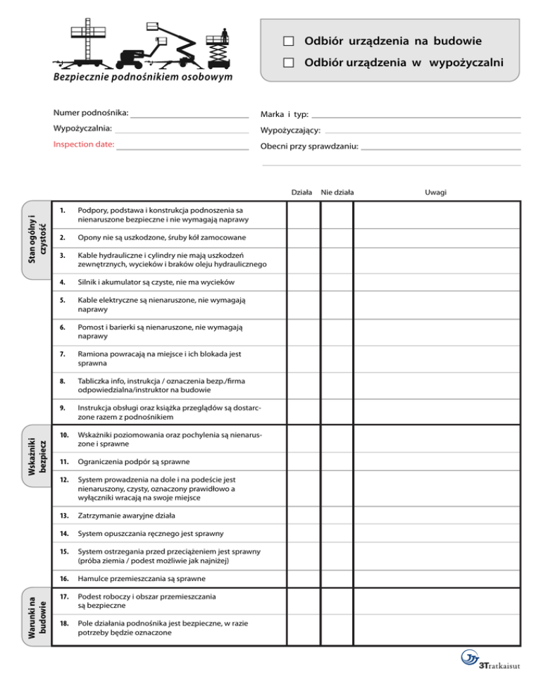 Odbiór urządzenia na budowie Odbiór urządzenia w wypożyczalni Bezpiecznie podnośnikiem osobowym Numer podnośnika: Marka i typ: Wypożyczalnia: Wypożyczający: Inspection date: Obecni przy sprawdzaniu: Warunki na budowie Wskażniki bezpiecz Stan ogólny i czystość Działa 1. Podpory, podstawa i konstrukcja podnoszenia sa nienaruszone bezpieczne i nie wymagają naprawy 2. Opony nie są uszkodzone, śruby kół zamocowane 3. Kable hydrauliczne i cylindry nie mają uszkodzeń zewnętrznych, wycieków i braków oleju hydraulicznego 4. Silnik i akumulator są czyste, nie ma wycieków 5. Kable elektryczne są nienaruszone, nie wymagają naprawy 6. Pomost i barierki są nienaruszone, nie wymagają naprawy 7. Ramiona powracają na miejsce i ich blokada jest sprawna 8. Tabliczka info, instrukcja / oznaczenia bezp./firma odpowiedzialna/instruktor na budowie 9. Instrukcja obsługi oraz książka przeglądów są dostarczone razem z podnośnikiem 10. Wskażniki poziomowania oraz pochylenia są nienaruszone i sprawne 11. Ograniczenia podpór są sprawne 12. System prowadzenia na dole i na podeście jest nienaruszony, czysty, oznaczony prawidłowo a wyłączniki wracają na swoje miejsce 13. Zatrzymanie awaryjne działa 14. System opuszczania ręcznego jest sprawny 15. System ostrzegania przed przeciążeniem jest sprawny (próba ziemia / podest możliwie jak najniżej) 16. Hamulce przemieszczania są sprawne 17. Podest roboczy i obszar przemieszczania są bezpieczne 18. Pole działania podnośnika jest bezpieczne, w razie potrzeby będzie oznaczone Nie działa Uwagi