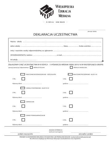 w U eD . Wielkopolska Edukacja Medialna ix edycja - kino rialto . ............................................................ pieczęć szkoły DEKLARACJA UCZESTNICTWA Nazwa szkoły ........................................................................................................................................, adres szkoły ................................................ .........................., klasa.................., liczba uczniów.................., imię i nazwisko osoby odpowiedzialnej za zgłoszenie ..................................................................................., SPOSÓB KONTAKTU: telefon: ........................................, e-mail....................................................................., tel.szkoły ................................ . ZGŁASZAMY CHĘĆ UCZESTNICTWA W IX EDYCJI / II PÓŁROCZU WEDUM ROKU 2015/16 W NASTĘPUJĄCEJ GRUPIE: (proszę zaznaczyć odpowiednio): WERSJA POLSKA WERSJA ANGIELSKA NAUCZANIE WCZESNOSZKOLNE - SZEŚCIOLATKI NAUCZANIE POCZĄTKOWE - KLASY I-III CYKL: CYKL: Wybrany dzień: .............................................. godzina: .............................................. SZKOŁA PODSTAWOWA - KLASY IV-VI CYKL: CYKL: Wybrany dzień: .............................................. godzina: .............................................. GIMNAZJUM CYKL: CYKL: Wybrany dzień: .............................................. godzina: .............................................. SZKOŁY PONADGIMNAZJALNE CYKL: CYKL: Wybrany dzień: .............................................. godzina: .............................................. ZGODA DYREKCJI: ............................................................ podpis nauczyciela (jeśli jest wymagana) ............................................................ pieczątka i podpis PROSIMY O ZOSTAWIENIE DEKLARACJI W KASIE KINA LUB PRZESŁANIE MAILEM ([email protected]). Na odwrocie znajdują się informacje dotyczące zasad płatności oraz regulamin. PŁATNOŚCI 1. Klasa płaci za seans na każdym spotkaniu (przed wejściem na salę kinową), lub wykupuje karnet na wszystkie spotkania (dzień przed pierwszym seansem). 2. Cena biletu dla 1 osoby na seans 2D wynosi 10zł. 3. Bilety w miarę wolnych miejsc można kupić przed seansem (prosimy o kontakt z kasą kina). 4. Cena karnetu na 4 spotkania dla jednej osoby wynosi 36zł. 5. Karnety można wykupić do dnia poprzedzającego pierwsze spotkanie. Niewykorzystane karnety nie podlegają zwrotowi. 6. Opiekunowie uczestniczą w spotkaniach nieodpłatnie. 7. W razie konieczności stosujemy znaczne ulgi dla max. 1 uczestnika (w ramach każdej klasy), znajdującego się w trudnej sytuacji finansowej. Prosimy o zaznaczenie takiej konieczności w formularzu zgłoszeniowym, oraz o złożenie osobnego wniosku do 10.02.2016. REGULAMIN WeduM 1. Podstawą do wejścia na salę kinową jest ważny karnet lub bilet. 2. Opiekunowie grupy biorą odpowiedzialność za jej zachowanie w kinie. 3. Opiekun zapisując klasę do programu, podaje preferowany przez siebie sposób komunikacji z nim. Organizator nie ponosi odpowiedzialności, jeśli informacja wysłana we wskazany sposób nie dotrze do adresata. 4. Organizator zastrzega sobie prawo do zmian w programie z przyczyn od niego niezależnych. 5. Organizator zastrzega sobie prawo do zmiany terminów spotkań (o czym poinformuje z co najmniej 7 - dniowym wyprzedzeniem). 6. Organizator zastrzega sobie prawo do odwołania cyklu spotkań, jeśli nie zapiszą się na niego co najmniej cztery klasy. 7. Nauczyciel, który zgłasza klasę do programu, jest jego szkolnym koordynatorem i odpowiada za przepływ informacji wśród innych opiekunów danej grupy. 8. Na sali kinowej obowiązuje zakaz jedzenia: popcornu, chipsów, dań z restauracji McDonald’s itp. oraz używania telefonów komórkowych , aparatów fotograficznych, a także nagrywania. w U eD Zapoznałam/em się z warunkami regulaminu i sposobem płatności ................................................................ (data i podpis)