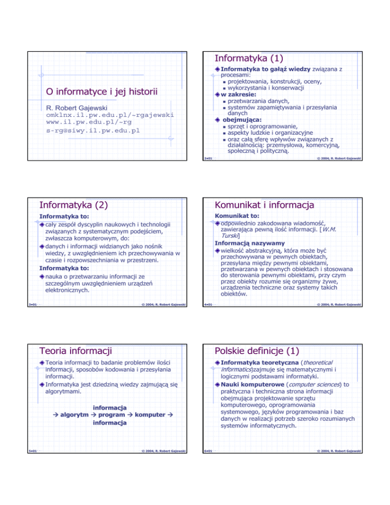 O informatyce i jej historii Informatyka (1) Informatyka (2) Komunikat i