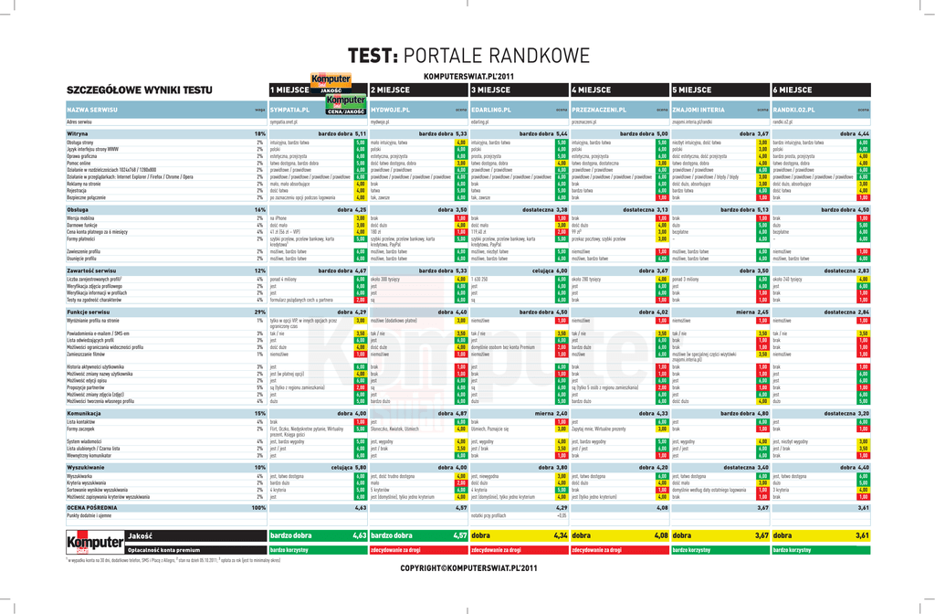 TEST: PORTALE RANDKOWE KOMPUTERSWIAT.PL’2011 SZCZEGÓŁOWE WYNIKI TESTU 1 MIEJSCE NAZWA SERWISU waga Adres serwisu SYMPATIA.PL ocena sympatia.onet.pl Witryna 18% Obsługa strony Język interfejsu strony WWW Oprawa graficzna Pomoc online Działanie w rozdzielczościach 1024x768 / 1280x800 Działanie w przeglądarkach: Internet Explorer / Firefox / Chrome / Opera Reklamy na stronie Rejestracja Bezpieczne połączenie 2% 2% 2% 2% 2% 2% 2% 2% 2% Obsługa 2% 4% 4% 2% Zawieszenie profilu Usunięcie profilu 2% 2% Zawartość serwisu 4% 2% 2% 4% Funkcje serwisu 6,00 6,00 6,00 2,00 4,00 6,00 6,00 3,00 6,00 6,00 6,00 5,00 6,00 przeznaczeni.pl bardzo dobra 5,44 intuicyjna, bardzo łatwa polski prosta, przejrzysta łatwo dostępna, dobra prawidłowe / prawidłowe prawidłowe / prawidłowe / prawidłowe / prawidłowe brak łatwa tak, zawsze dobra 3,50 brak dość dużo 180 zł szybki przelew, przelew bankowy, karta kredytowa, PayPal możliwe, bardzo łatwe możliwe, bardzo łatwe 1,00 4,00 1,00 5,00 6,00 6,00 4,00 6,00 6,00 6,00 dobra 4,29 ocena 5,00 6,00 6,00 3,00 6,00 6,00 6,00 6,00 1,00 dobra 3,67 3,00 3,00 4,00 4,00 6,00 3,00 3,00 6,00 1,00 niezbyt intuicyjna, dość łatwa polski dość estetyczna, dość przejrzysta łatwo dostępna, dobra prawidłowe / prawidłowe prawidłowe / prawidłowe / błędy / błędy dość dużo, absorbujące bardzo łatwa brak dostateczna 3,13 RANDKI.O2.PL ocena randki.o2.pl bardzo dobra 5,00 intuicyjna, bardzo łatwa polski estetyczna, przejrzysta łatwo dostępna, dostateczna prawidłowe / prawidłowe prawidłowe / prawidłowe / prawidłowe / prawidłowe brak bardzo łatwa brak dobra 4,44 bardzo intuicyjna, bardzo łatwa polski bardzo prosta, przejrzysta łatwo dostępna, dobra prawidłowe / prawidłowe prawidłowe / prawidłowe / prawidłowe / prawidłowe dość dużo, absorbujące dość łatwa brak bardzo dobra 5,13 6,00 6,00 4,00 4,00 6,00 6,00 3,00 4,00 1,00 bardzo dobra 4,50 1,00 3,00 2,00 5,00 brak dość dużo 99 zł3 przekaz pocztowy, szybki przelew 1,00 4,00 3,00 3,00 brak dużo bezpłatne – 1,00 5,00 6,00 6,00 brak dużo bezpłatne – 1,00 5,00 6,00 6,00 5,00 6,00 niemożliwe możliwe, bardzo łatwe 1,00 6,00 możliwe, bardzo łatwe możliwe, bardzo łatwe 6,00 6,00 niemożliwe możliwe, bardzo łatwe 1,00 6,00 celująca 6,00 6,00 6,00 6,00 6,00 1 630 250 jest jest są dobra 4,40 5,00 6,00 5,00 4,00 6,00 6,00 6,00 5,00 6,00 ZNAJOMI INTERIA znajomi.interia.pl/randki dostateczna 3,38 brak dość mało 119,40 zł szybki przelew, przelew bankowy, karta kredytowa, PayPal możliwe, niezbyt łatwe możliwe, bardzo łatwe bardzo dobra 5,33 około 300 tysięcy jest jest są ocena około 280 tysięcy jest jest brak bardzo dobra 4,50 dobra 3,67 4,00 6,00 6,00 1,00 dobra 3,50 6,00 6,00 1,00 1,00 ponad 3 miliony jest brak brak dobra 4,02 około 240 tysięcy jest brak brak mierna 2,45 dostateczna 2,83 4,00 6,00 1,00 1,00 dostateczna 2,84 niemożliwe 1,00 niemożliwe 1,00 niemożliwe 1,00 niemożliwe 1,00 3% 3% 3% 1% 3,50 6,00 4,00 1,00 tak / nie jest dość duże niemożliwe 3,50 6,00 4,00 1,00 tak / nie jest domyślnie osobom bez konta Premium niemożliwe 3,50 6,00 2,00 1,00 tak / nie jest bardzo duże możliwe 3,50 6,00 6,00 6,00 3,50 1,00 1,00 3,50 tak / nie brak brak niemożliwe 3,50 1,00 1,00 1,00 3% 2% 2% 5% 2% 4% jest jest (w płatnej opcji) jest są (tylko z regionu zamieszkania) jest dużo 6,00 4,00 6,00 2,00 6,00 5,00 brak brak jest są jest bardzo dużo 1,00 1,00 6,00 6,00 6,00 6,00 jest brak jest są jest dużo 6,00 1,00 6,00 6,00 6,00 5,00 brak brak jest są (tylko 5 osób z regionu zamieszkania) jest bardzo dużo 1,00 1,00 6,00 2,00 6,00 6,00 tak / nie brak brak możliwe (w specjalnej części wizytówki znajomi.interia.pl) brak brak jest brak jest dość dużo 1,00 1,00 6,00 1,00 6,00 4,00 brak jest jest brak jest dużo 1,00 6,00 6,00 1,00 6,00 5,00 4% 2% System wiadomości Lista ulubionych / Czarna lista Wewnętrzny komunikator 4% 2% 3% 4% 2% 2% 2% dobra 4,00 brak Flirt, Oczko, Niedyskretne pytanie, Wirtualny prezent, Księga gości jest, bardzo wygodny jest / jest jest 10% jest, łatwo dostępna bardzo dużo 4 kryteria jest 100% dobra 4,87 bardzo korzystny mierna 2,40 bardzo dobra 4,80 dostateczna 3,20 jest Słoneczko, Kwiatek, Uśmiech 6,00 4,00 brak Uśmiech, Poznajcie się 1,00 3,00 jest Zapytaj mnie, Wirtualne prezenty 6,00 3,00 jest brak 6,00 1,00 jest brak 6,00 1,00 5,00 6,00 6,00 jest, wygodny jest / brak jest 4,00 3,50 6,00 jest, wygodny jest / brak brak 4,00 3,50 1,00 jest, bardzo wygodny jest / jest brak 5,00 6,00 1,00 jest, wygodny jest / jest jest 4,00 6,00 6,00 jest, niezbyt wygodny jest / brak brak 3,00 3,50 1,00 celująca 5,80 6,00 6,00 5,00 6,00 dobra 4,00 jest, dość trudno dostępna mało 5 kryteriów jest (domyślnie), tylko jedno kryterium 4,00 2,00 6,00 4,00 3,00 4,00 5,00 4,00 notatki przy profilach 4,29 +0,05 4,57 4,63 bardzo dobra zdecydowanie za drogi dobra 3,80 jest, niewygodna dość dużo 4 kryteria jest (domyślnie), tylko jedno kryterium jest, łatwo dostępna dość dużo brak jest (tylko jedno kryterium) dobra 4,20 6,00 4,00 1,00 4,00 dostateczna 3,40 jest, łatwo dostępna dość mało domyślnie według daty ostatniego logowania brak 4,08 6,00 3,00 1,00 1,00 jest, łatwo dostępna dużo 3 kryteria brak 3,67 dobra 4,40 6,00 5,00 4,00 1,00 3,61 4,57 dobra4,34 dobra4,08 dobra3,67 dobra3,61 zdecydowanie za drogi 3 w wypadku konta na 30 dni, dodatkowo telefon, SMS i Płacę z Allegro, stan na dzień 05.10.2011; opłata za rok (jest to minimalny okres) dobra 4,33 1,00 5,00 4,63 bardzo dobra 2 bardzo dobra 5,33 mało intuicyjna, łatwa polski estetyczna, przejrzysta dość łatwo dostępna, dobra prawidłowe / prawidłowe prawidłowe / prawidłowe / prawidłowe / prawidłowe brak łatwa tak, zawsze bardzo dobra 4,67 ponad 4 miliony jest jest formularz pożądanych cech u partnera 15% Opłacalność konta premium edarling.pl PRZEZNACZENI.PL 3,00 Lista kontaktów Formy zaczepek Jakość 6,00 6,00 ocena 6 MIEJSCE możliw