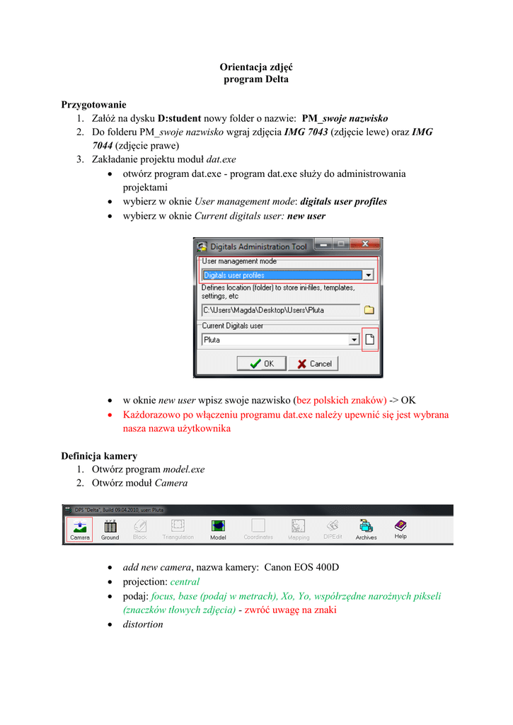 Orientacja zdjęć program Delta Przygotowanie 1. Załóż na dysku D:student nowy folder o nazwie: PM_swoje nazwisko 2. Do folderu PM_swoje nazwisko wgraj zdjęcia IMG 7043 (zdjęcie lewe) oraz IMG 7044 (zdjęcie prawe) 3. Zakładanie projektu moduł dat.exe otwórz program dat.exe - program dat.exe służy do administrowania projektami wybierz w oknie User management mode: digitals user profiles wybierz w oknie Current digitals user: new user w oknie new user wpisz swoje nazwisko (bez polskich znaków) -> OK Każdorazowo po włączeniu programu dat.exe należy upewnić się jest wybrana nasza nazwa użytkownika Definicja kamery 1. Otwórz program model.exe 2. Otwórz moduł Camera add new camera, nazwa kamery: Canon EOS 400D projection: central podaj: focus, base (podaj w metrach), Xo, Yo, współrzędne narożnych pikseli (znaczków tłowych zdjęcia) - zwróć uwagę na znaki distortion o kliknij na „1”, wpisz kolejno wartości: 5,10,15,20 oraz przypisz im wartość dystorsji. Pozostałe wartości zone usuń ręcznie -> zatwierdź OK. o wybierz Fill absent ustaw aktywną kamerę: klikam prawym przyciskiem myszy na nazwę kamery -> set current camera odkliknij opcję „edit” save as -> nazwa pliku: models.ini - nadpisać utworzony już plik Definiowane fotopunktów 1. otwórz moduł Ground 2. wybierz add, pojawia się okno dialogowe ground point, wpisz współrzędne 6 fotopunktów - zwróć uwagę na numerację punktów oraz znaki przy wartościach 3. niebieską strzałką, przerzuć wszystkie punkty do okna dialogowego block points 4. zapisz plik -> save, powstaje plik ground.txt Orientacja wewnętrzna 1. otwórz moduł model -> inner orientation 2. załaduj zdjęcia IMG 7043 (zdjęcie lewe) oraz IMG 7044 (zdjęcie prawe) 3. wybierz rodzaj kamery 4. Zaznacz opcje: orientation mode - stereo model; orientation process - start new session; affine transformation -> Proceed 5. w oknie dialogowym incorrect poxel size wpisz wartość 5,6 6. zaznacz kursorem 4 narożniki zdjęć w kolejności: 1 4 Uwaga: nie pomylić kolejności 7. Błędy: 0,00µm 8. zapisz raport -> save 2 3 Orientacja wzajemna 1. otwórz moduł model -> relative orientation 2. załaduj zdjęcia IMG 7043 (zdjęcie lewe) oraz IMG 7044 (zdjęcie prawe) 3. zaznacz: start new session, standard (6) points ->Proceed 4. control -> stereoscope, control on, reverse shutters 5. zaznacz 6 punktów w rejonie grubera, wskazując dokładnie te same miejsca na zdjęciu lewym oraz prawy. 1 2 4 5 3 6 Uwaga: nie pomylić kolejności, jeśli np. znaczek 2 zostanie postawiony błędnie, należy postawić pozostałe, a następnie przejść do edycji znaczka 2 6. Maksymalny błąd 1µm 7. zapisz raport -> save Orientacja bezwzględna 1. otwórz moduł model -> absolute orientation 2. załaduj zdjęcia IMG 7043 (zdjęcie lewe) oraz IMG 7044 (zdjęcie prawe) 3. zaznacz: survey method: aerial photo, orientation method: stereomodel, orientation process: start new session, scale 1:1000 -> Proceed 1. Maksymalny błąd 2,0 cm