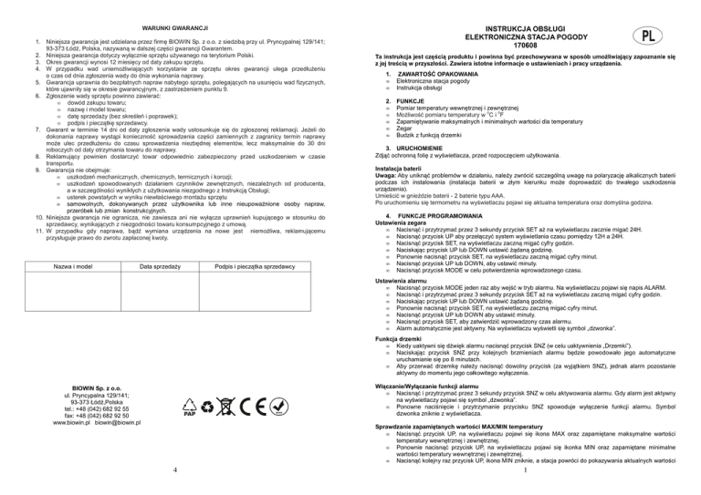 WARUNKI GWARANCJI 1. Niniejsza gwarancja jest udzielana przez firmę BIOWIN Sp. z o.o. z siedzibą przy ul. Pryncypalnej 129/141; 93-373 Łódź, Polska, nazywaną w dalszej części gwarancji Gwarantem. 2. Niniejsza gwarancja dotyczy wyłącznie sprzętu używanego na terytorium Polski. 3. Okres gwarancji wynosi 12 miesięcy od daty zakupu sprzętu. 4. W przypadku wad uniemożliwiających korzystanie ze sprzętu okres gwarancji ulega przedłużeniu o czas od dnia zgłoszenia wady do dnia wykonania naprawy. 5. Gwarancja uprawnia do bezpłatnych napraw nabytego sprzętu, polegających na usunięciu wad fizycznych, które ujawniły się w okresie gwarancyjnym, z zastrzeżeniem punktu 9. 6. Zgłoszenie wady sprzętu powinno zawierać: • dowód zakupu towaru; • nazwę i model towaru; • datę sprzedaży (bez skreśleń i poprawek); • podpis i pieczątkę sprzedawcy. 7. Gwarant w terminie 14 dni od daty zgłoszenia wady ustosunkuje się do zgłoszonej reklamacji. Jeżeli do dokonania naprawy wystąpi konieczność sprowadzenia części zamiennych z zagranicy termin naprawy może ulec przedłużeniu do czasu sprowadzenia niezbędnej elementów, lecz maksymalnie do 30 dni roboczych od daty otrzymania towaru do naprawy. 8. Reklamujący powinien dostarczyć towar odpowiednio zabezpieczony przed uszkodzeniem w czasie transportu. 9. Gwarancja nie obejmuje: • uszkodzeń mechanicznych, chemicznych, termicznych i korozji; • uszkodzeń spowodowanych działaniem czynników zewnętrznych, niezależnych od producenta, a w szczególności wynikłych z użytkowania niezgodnego z Instrukcją Obsługi; • usterek powstałych w wyniku niewłaściwego montażu sprzętu • samowolnych, dokonywanych przez użytkownika lub inne nieupoważnione osoby napraw, przeróbek lub zmian konstrukcyjnych. 10. Niniejsza gwarancja nie ogranicza, nie zawiesza ani nie wyłącza uprawnień kupującego w stosunku do sprzedawcy, wynikających z niezgodności towaru konsumpcyjnego z umową. 11. W przypadku gdy naprawa, bądź wymiana urządzenia na nowe jest niemożliwa, reklamującemu przysługuje prawo do zwrotu zapłaconej kwoty. Nazwa i model Data sprzedaży Podpis i pieczątka sprzedawcy INSTRUKCJA OBSŁUGI ELEKTRONICZNA STACJA POGODY 170608 Ta instrukcja jest częścią produktu i powinna być przechowywana w sposób umożliwiający zapoznanie się z jej treścią w przyszłości. Zawiera istotne informacje o ustawieniach i pracy urządzenia. 1. • • ZAWARTOŚĆ OPAKOWANIA Elektroniczna stacja pogody Instrukcja obsługi 2. FUNKCJE • Pomiar temperatury wewnętrznej i zewnętrznej o o • Możliwość pomiaru temperatury w C i F • Zapamiętywanie maksymalnych i minimalnych wartości dla temperatury • Zegar • Budzik z funkcją drzemki 3. URUCHOMIENIE Zdjąć ochronną folię z wyświetlacza, przed rozpoczęciem użytkowania. Instalacja baterii Uwaga: Aby uniknąć problemów w działaniu, należy zwrócić szczególną uwagę na polaryzację alkalicznych baterii podczas ich instalowania (instalacja baterii w złym kierunku może doprowadzić do trwałego uszkodzenia urządzenia). Umieścić w gnieździe baterii - 2 baterie typu AAA. Po uruchomieniu się termometru na wyświetlaczu pojawi się aktualna temperatura oraz domyślna godzina. 4. FUNKCJE PROGRAMOWANIA Ustawienia zegara • Nacisnąć i przytrzymać przez 3 sekundy przycisk SET aż na wyświetlaczu zacznie migać 24H. • Nacisnąć przycisk UP aby przełączyć system wyświetlania czasu pomiędzy 12H a 24H. • Nacisnąć przycisk SET, na wyświetlaczu zaczną migać cyfry godzin. • Naciskając przycisk UP lub DOWN ustawić żądaną godzinę. • Ponownie nacisnąć przycisk SET, na wyświetlaczu zaczną migać cyfry minut. • Nacisnąć przycisk UP lub DOWN, aby ustawić minuty. • Nacisnąć przycisk MODE w celu potwierdzenia wprowadzonego czasu. Ustawienia alarmu • Nacisnąć przycisk MODE jeden raz aby wejść w tryb alarmu. Na wyświetlaczu pojawi się napis ALARM. • Nacisnąć i przytrzymać przez 3 sekundy przycisk SET aż na wyświetlaczu zaczną migać cyfry godzin. • Naciskając przycisk UP lub DOWN ustawić żądaną godzinę. • Ponownie nacisnąć przycisk SET, na wyświetlaczu zaczną migać cyfry minut. • Nacisnąć przycisk UP lub DOWN aby ustawić minuty. • Nacisnąć przycisk SET, aby zatwierdzić wprowadzony czas alarmu. • Alarm automatycznie jest aktywny. Na wyświetlaczu wyświetli się symbol „dzwonka”. Funkcja drzemki • Kiedy uaktywni się dźwięk alarmu nacisnąć przycisk SNZ (w celu uaktywnienia „Drzemki”). • Naciskając przycisk SNZ przy kolejnych brzmieniach alarmu będzie powodowało jego automatyczne uruchamianie się po 8 minutach. • Aby przerwać drzemkę należy nacisnąć dowolny przycisk (za wyjątkiem SNZ), jednak alarm pozostanie aktywny do momentu jego całkowitego wyłączenia. Włączanie/Wyłączanie funkcji alarmu • Nacisnąć i przytrzymać przez 3 sekundy przycisk SNZ w celu aktywowania alarmu. Gdy alarm jest aktywny na wyświetlaczy pojawi się symbol „dzwonka”. • Ponowne naciśnięcie i przytrzymanie przycisku SNZ spowoduje wyłączenie funkcji alarmu. Symbol dzwonka zniknie z wyświetlacza. BIOWIN Sp. z o.o. ul. Pryncypalna 129/141; 93-373 Łódź,Polska tel.: +48 (042) 682 92 55 fax: +48 (042) 682 92 50 www.biowin.pl [email protected] Sprawdzanie zapamiętanych wartości MAX/MIN temperatury • Nacisnąć przycisk UP, na wyświetlaczu pojawi się ikona MAX oraz zapamiętane maksymalne wartości temperatury wewnętrznej i zewnętrznej. • Ponownie nacisnąć przycisk UP, na wyświetlaczu pojawi się ikonka MIN oraz zapamiętane minimalne wartości temperatury wewnętrznej i zewnętrznej. • Nacisnąć kolejny raz przycisk UP, ikona MIN zniknie, a stacja powróci do pokazywania aktualnych wartości 4 1 temperatury. Kasowanie zapamiętanych wartości MAX/MIN • Podczas wyświetlania temperatury MAX nacisnąć MODE. Zapamiętana przez stację temperatura maks