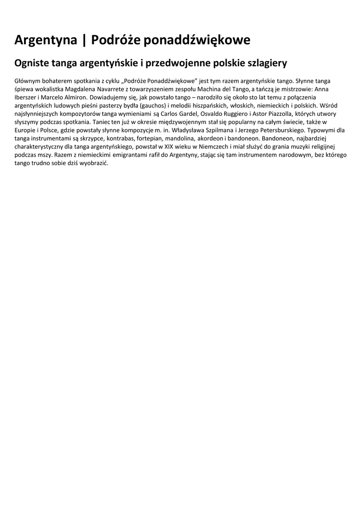 Argentyna | Podróże ponaddźwiękowe Ogniste tanga argentyńskie i przedwojenne polskie szlagiery Głównym bohaterem spotkania z cyklu „Podróże Ponaddźwiękowe” jest tym razem argentyńskie tango. Słynne tanga śpiewa wokalistka Magdalena Navarrete z towarzyszeniem zespołu Machina del Tango, a tańczą je mistrzowie: Anna Iberszer i Marcelo Almiron. Dowiadujemy się, jak powstało tango – narodziło się około sto lat temu z połączenia argentyńskich ludowych pieśni pasterzy bydła (gauchos) i melodii hiszpańskich, włoskich, niemieckich i polskich. Wśród najsłynniejszych kompozytorów tanga wymieniami są Carlos Gardel, Osvaldo Ruggiero i Astor Piazzolla, których utwory słyszymy podczas spotkania. Taniec ten już w okresie międzywojennym stał się popularny na całym świecie, także w Europie i Polsce, gdzie powstały słynne kompozycje m. in. Władysława Szpilmana i Jerzego Petersburskiego. Typowymi dla tanga instrumentami są skrzypce, kontrabas, fortepian, mandolina, akordeon i bandoneon. Bandoneon, najbardziej charakterystyczny dla tanga argentyńskiego, powstał w XIX wieku w Niemczech i miał służyć do grania muzyki religijnej podczas mszy. Razem z niemieckimi emigrantami rafił do Argentyny, stając się tam instrumentem narodowym, bez którego tango trudno sobie dziś wyobrazić.