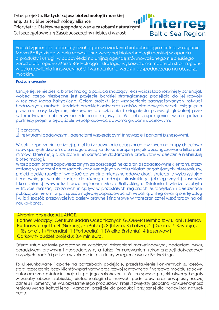 Tytuł projektu: Bałtycki sojusz biotechnologii morskiej ang. Baltic blue biotechnology alliance Priorytet: 2. Efektywne gospodarowanie zasobami naturalnymi Cel szczegółowy: 2.4 Zasobooszczędny niebieski wzrost Projekt zgromadzi podmioty działające w dziedzinie biotechnologii morskiej w regionie Morza Bałtyckiego w celu rozwoju innowacyjnej biotechnologii morskiej w oparciu o produkty i usługi, w odpowiedzi na unijną agendę zrównoważonego niebieskiego wzrostu dla regionu Morza Bałtyckiego - strategię wykorzystania mocnych stron regionu w celu rozwijania innowacyjności i wzmacniania wzrostu gospodarczego na obszarze morskim. Podsumowanie Uznaje się, że niebieska biotechnologia posiada znaczący, lecz wciąż słabo rozwinięty potencjał, wobec czego niezbędne jest przyjęcie bardziej strategicznego podejścia do jej rozwoju w regionie Morza Bałtyckiego. Celem projektu jest wzmocnienie zaangażowanych instytucji badawczych, małych i średnich przedsiębiorstw oraz klastrów biznesowych w celu osiągnięcia przez nie masy krytycznej niezbędnej do działania i osiągnięcia przewagi globalnej przez systematyczne mobilizowanie zdolności krajowych. W celu zaspokojenia swoich potrzeb partnerzy projektu będą ściśle współpracować z dwoma grupami docelowymi: 1) biznesem, 2) instytutami badawczymi, agencjami wspierającymi innowacje i parkami biznesowymi. W celu rozpoczęcia realizacji projektu i zapewnienia usług zorientowanych na grupy docelowe i powiązanych działań od samego początku do konsorcjum projektu zaangażowano kilka podmiotów, które mają duże szanse na skuteczne dostarczenie produktów w dziedzinie niebieskiej biotechnologii. Wraz z podmiotami odpowiedzialnymi za poszczególne działania i dodatkowymi klientami, którzy zostaną wyznaczeni na zasadach konkurencyjnych w toku działań angażujących interesariuszy, projekt będzie rozwijać i wdrażać optymalne międzynarodowe drogi, skutecznie wykorzystując i zapewniając szeroki dostęp do różnego rodzaju infrastruktury, (ekologicznych) zasobów i kompetencji wewnątrz i poza regionem Morza Bałtyckiego. Działania i wiedza zdobyta w trakcie realizacji zbliżonych inicjatyw w pozostałych regionach europejskich i dziedzinach pokażą partnerom, w jaki sposób najlepiej dopracować ich wspólną, zintegrowaną ofertę usług i w jaki sposób przezwyciężyć bariery prawne i finansowe w transgranicznej współpracy na osi nauka-biznes. Akronim projektu: ALLIANCE. Partner wiodący: Centrum Badań Oceanicznych GEOMAR Helmholtz w Kilonii, Niemcy. Partnerzy projektu: 4 (Niemcy), 4 (Polska), 3 (Litwa), 3 (Łotwa), 2 (Dania), 2 (Szwecja), 1 (Estonia), 1 (Finlandia), 1 (Portugalia), 1 (Wielka Brytania), 4 (rezerwowi). Całkowity budżet projektu: 3,4 mln euro. Oferta usług zostanie połączona ze wspólnymi działaniami marketingowymi, badaniami rynku, doradztwem prawnym i gospodarczym, a także formułowaniem rekomendacji dotyczących przyszłych badań i potrzeb w zakresie infrastruktury w regionie Morza Bałtyckiego. To ukierunkowane i oparte na potrzebach podejście, przedstawienie konkretnych sukcesów, stałe rozszerzanie bazy klientów/partnerów oraz rozwój rentownego finansowo modelu zapewni autonomiczne działanie projektu po jego zakończeniu. W ten sposób projekt otworzy bogaty w zasoby obszar niebieskiej biotechnologii dla nowych podmiotów oraz przyspieszy rozwój biznesu i komercyjne wykorzystanie jego produktów. Projekt zwiększy globalną konkurencyjność regionu Morza Bałtyckiego i wzmocni przejście do produkcji przyjaznej dla środowiska naturalnego.