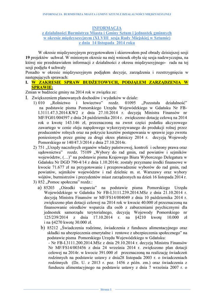 INFORMACJA BURMISTRZA MIASTA i GMINY SZTUM Z DZIAŁALNOŚCI MIĘDZYSESYJNEJ INFORMACJA z działalności Burmistrza Miasta i Gminy Sztum i jednostek gminnych w okresie międzysesyjnym (XLVIII sesja Rady Miejskiej w Sztumie) z dnia 14 listopada 2014 roku W okresie międzysesyjnym przygotowałem i skierowałem pod obrady dzisiejszej sesji 19 projektów uchwał. W minionym okresie na mój wniosek obyła się sesja nadzwyczajna, na której nie przedstawiałem informacji z działalności z okresu międzysesyjnego- rada na tej sesji podjęła 4 uchwały Ponadto w okresie międzysesyjnym podjąłem decyzje, zarządzenia i rozstrzygnięcia w następujących sprawach: I. W ZAKRESIE SPRAW BUDŻETOWYCH, PODJĄŁEM ZARZĄDZENIA W SPRAWIE: Zmian w budżecie gminy na 2014 rok w związku ze: I. Zwiększeniem planowanych dochodów i wydatków w dziale: 1) 010 „Rolnictwo i łowiectwo” rozdz. 01095 „Pozostała działalność” na podstawie pisma Pomorskiego Urzędu Wojewódzkiego w Gdańsku Nr FBI.3111.47.3.2014.KW2 z dnia 27.10.2014 r. decyzją Ministra Finansów nr MF/FG01/004597 z dnia 24 października 2014 r. zwiększono dotację celową na 2014 rok o kwotę 143.146 zł, przeznaczoną na zwrot części podatku akcyzowego zawartego w cenie oleju napędowego wykorzystywanego do produkcji rolnej przez producentów rolnych oraz na pokrycie kosztów postępowania w sprawie jego zwrotu poniesionych przez gminę za drugi okres płatniczy 2014 r. decyzją Wojewody Pomorskiego nr 140/47.3/2014 z dnia 27.10.2014r. 2) 751 „Urzędy naczelnych organów władzy państwowej, kontroli i ochrony prawa oraz sądownictwa” rozdz. 75109 „Wybory do rad gmin, rad powiatów i sejmików województw, (…)” na podstawie pisma Krajowego Biura Wyborczego Delegatura w Gdańsku Nr DGD 790-4/14 z dnia 1.10.2014r. zostały przyznane środki finansowe w kwocie 71.677 zł na przygotowanie i przeprowadzenie wyborów do rad gmin, rad powiatów, sejmików województw i rad dzielnic m. st. Warszawy oraz wybory wójtów, burmistrzów i prezydentów miast zarządzonych na dzień 16 listopada 2014 r. 3) 852 „Pomoc społeczna” rozdz.: a) 85203 „Ośrodki wsparcia” na podstawie pisma Pomorskiego Urzędu Wojewódzkiego w Gdańsku Nr FB-I.3111.239.2014.MSz z dnia 21.10.2014 r. decyzją Ministra Finansów nr MF/FS14/004049 z dnia 10 października 2014 r. zwiększono plan dotacji celowej na 2014 rok w kwocie 40.000 zł przeznaczoną na finansowanie ośrodków wsparcia dla osób z zaburzeniami psychicznymi dla jednostek samorządu terytorialnego, decyzją Wojewody Pomorskiego nr 125/239/2014 z dnia 17.10.2014 r. na §4210 kwotę 10.000 zł i na §4270 kwotę 30.000 zł. b) 85212 „Świadczenia rodzinne, świadczenia z funduszu alimentacyjnego oraz składki na ubezpieczenia emerytalne i rentowe z ubezpieczenia społecznego” na podstawie pisma Pomorskiego Urzędu Wojewódzkiego w Gdańsku: - Nr FB-I.3111.200.2014.MSz z dnia 29.10.2014 r. decyzją Ministra Finansów Nr MF/FS14/003456 z dnia 24 września 2014 r. zwiększono plan dotacji celowej na 2014r. w kwocie 391.000 zł przeznaczoną na realizację świadczeń rodzinnych na podstawie ustawy z dnia28 listopada 2003 r. o świadczeniach rodzinnych (Dz. U. z 2013 r. poz. 1456 z późn. zm.) oraz świadczenia z funduszu alimentacyjnego na podstawie ustawy z dnia 7 września 2007 r. o Strona 1 INFORMACJA BURMISTRZA MIASTA i GMINY SZTUM Z DZIAŁALNOŚCI MIĘDZYSESYJNEJ pomocy osobom uprawnionym do alimentów (Dz. U. z 2012r. poz. 1228 z późn. zm.), - Nr FB I.3111.232.2014.MSz z dnia 29.10.2014 r. decyzją Ministra Finansów Nr MF/FS14/003847 z dnia 10 października 2014 r. zwiększono plan dotacji celowej na 2014r. w kwocie 34.000 zł przeznaczoną na realizację zadań z zakresu administracji rządowej, tj. realizację ustawy z dnia 4 kwietnia 2014r. o ustaleniu i wypłacie zasiłków dla opiekunów (Dz. U. z 2014 r. poz. 567) w związku z wykonaniem wyroku Trybunału Konstytucyjnego z dnia 5 grudnia 2013 r. dla jednostek samorządu terytorialnego decyzją Wojewody Pomorskiego nr 130/232/2014 z dnia 28.10.2014 r. c) 85213 „Składki na ubezpieczenie zdrowotne opłacane za osoby pobierające niektóre świadczenia z pomocy społecznej, niektóre świadczenia rodzinne oraz za osoby uczestniczące w zajęciach w centrum integracji społecznej” na podstawie pisma Pomorskiego Urzędu Wojewódzkiego w Gdańsku Nr FBI.3111.237.2014.DW z dnia 21.10.2014 r. decyzją Ministra Finansów Nr MF/FS14/004118 z dnia 10 października 2014 r. zwiększono plan dotacji celowej na 2014r. w kwocie 6.800 zł przeznaczoną na dofinansowanie opłacenia składek na ubezpieczenie zdrowotne, o których mowa z art. 17 ust. 1 pkt 20 ustawy z dnia 12 marca 2004 r. o pomocy społecznej (Dz. U. z 2013 r. poz. 182, ze zm.) dla jednostek samorządu terytorialnego decyzją - Wojewody Pomorskiego nr 130/237/2014 z dnia 21.10.2014 r., d) 85214 „Zasiłki i pomoc w naturze oraz składki na ubezpieczenia emerytalne i rentowe” na podstawie pisma Pomorskiego Urzędu Wojewódzkiego w Gdańsku Nr FB-I.3111.234.2014.MSz z dnia 14.10.2014 r. decyzją Ministra Finansów nr MF/FS14/003916 z dnia 6.10.2014r. zwiększono plan dotacji na 2014 rok w kwocie 67.000 zł przeznaczoną na dofinansowanie wypłat zasiłków okresowych w części gwarantowanej z budżetu państwa, zgodnie z postanowieniami art. 147 ust. 7 ustawy o pomocy społecznej (Dz. U. z 2013r., poz. 182, z późn. zm.) dla jst, decyzją Wojewody Pomorskiego nr 116/234/2014 z dnia 13 października 2014r. e) 85215 „Dodatki mieszkaniowe” na podstawie pisma Pomorskiego Urzędu Wojewódzkiego w Gdańsku Nr FB-I.3111.66.3.2014KW z dnia 08.10.2014 r. decyzją Wojewody Pomorskiego nr 115/66.3/2014 z dnia 08.10.2014r. zwiększono plan dotacji na 2014 rok w kwocie 1.948 zł. Środki pochodzą z rezerwy celowej budżetu państwa (poz. 24) z przeznaczeniem na wypłatę zryczałtowanych dodatków energetycznych za IV kwartał 2014 roku dla odbiorców wrażliwych ener