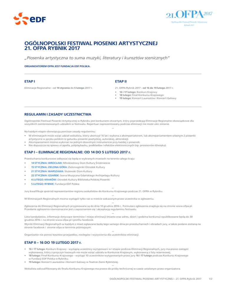 OGÓLNOPOLSKI FESTIWAL PIOSENKI ARTYSTYCZNEJ 21. OFPA RYBNIK 2017 „Piosenka artystyczna to suma muzyki, literatury i kunsztów scenicznych” ORGANIZATOREM OFPA JEST FUNDACJA EDF POLSKA. ETAP I ETAP II Eliminacje Regionalne - od 14 stycznia do 5 lutego 2017 r. 21. OFPA Rybnik 2017 - od 16 do 19 lutego 2017 r. • 16 i 17 lutego: Konkurs Krajowy • 18 lutego: Finał Konkursu Krajowego • 19 lutego: Koncert Laureatów i Koncert Galowy REGULAMIN I ZASADY UCZESTNICTWA Ogólnopolski Festiwal Piosenki Artystycznej w Rybniku jest konkursem otwartym, który poprzedzają Eliminacje Regionalne obowiązkowe dla wszystkich zainteresowanych udziałem w festiwalu. Repertuar zaprezentowany podczas eliminacji nie może ulec zmianie. – Na każdym etapie obowiązują poniższe zasady regulaminu: • W eliminacjach może wziąć udział wokalista, który ukończył 16 lat i wykona z akompaniatorem, lub akompaniamentem własnym 2 piosenki artystyczne w języku polskim (z gatunku piosenki poetyckiej, autorskiej, aktorskiej). • Akompaniament można wykonać na jednym dowolnym instrumencie przy każdej z piosenek. • Nie dopuszcza się śpiewu a’capella, półplaybacku, podkładów i efektów elektronicznych (np. procesorów dźwięku). ETAP I – ELIMINACJE REGIONALNE: OD 14 DO 5 LUTEGO 2017 r. Przesłuchania konkursowe odbywać się będą w wybranych miastach na terenie całego kraju: • 14 STYCZNIA: WROCŁAW: Młodzieżowy Dom Kultury Śródmieście • 15 STYCZNIA: ZIELONA GÓRA: Zielonogórski Ośrodek Kultury • 21 STYCZNIA: WARSZAWA: Służewski Dom Kultury • 22 STYCZNIA: GDAŃSK: Scena Muzyczna Gdańskiego Archipelagu Kultury • 4 LUTEGO: KRAKÓW: Ośrodek Kultury Biblioteka Polskiej Piosenki • 5 LUTEGO: RYBNIK: Fundacja EDF Polska – Jury kwalifikuje spośród reprezentantów regionu wokalistów do Konkursu Krajowego podczas 21. OFPA w Rybniku. – W Eliminacjach Regionalnych można wystąpić tylko raz w mieście wskazanym przez uczestnika w zgłoszeniu. – Zgłoszenia do Eliminacji Regionalnych przyjmowane są do dnia 10 grudnia 2016 r.. Formularz zgłoszenia znajduje się na stronie www.ofpa.pl. Przesłanie zgłoszenia równoznaczne jest z zapoznaniem się i akceptacją regulaminu festiwalu. – Lista kandydatów, informacje dotyczące terminów i miejsc eliminacji (miasto oraz adres, dzień i godzina konkursu) opublikowane będą do 30 grudnia 2016 r. na stronie www.ofpa.pl i profilu facebook. Wyniki Eliminacji Regionalnych w każdym z miast ogłaszane będą tego samego dnia po przesłuchaniach i obradach jury, a także podane zostaną na stronie facebook i stronie ofpa w terminie późniejszym. – Organizator nie ponosi kosztów przejazdów, noclegów i wyżywienia dla uczestników eliminacji. ETAP II – 16 DO 19 LUTEGO 2017 r. • 16 i 17 lutego: Konkurs Krajowy - wystąpią uczestnicy wytypowani w I etapie podczas Eliminacji Regionalnych, jury ma prawo zastąpić wykonawcę, który z przyczyn losowych nie może wziąć udziału w Konkursie Krajowym, wykonawcą z listy rezerwowej. • 18 lutego: Finał Konkursu Krajowego – wystąpi 10 uczestników wytypowanych przez jury 16 i 17 lutego podczas Konkursu Krajowego w Fundacji EDF Polska w Rybniku. • 19 lutego: Koncert Laureatów i Koncert Galowy w Teatrze Ziemi Rybnickiej. – Wokalista zakwalifikowany do finału Konkursu Krajowego ma prawo do próby technicznej w czasie ustalonym przez organizatora. OGÓLNOPOLSKI FESTIWAL PIOSENKI ARTYSTYCZNEJ – 21. OFPA Rybnik 2017 1/2 – Kolejność występu w obu etapach ustala organizator (poprzez losowanie), natomiast kolejność wykonywania utworów leży w gestii wokalisty. – Prezentacje konkursowe oceniać będzie profesjonalne Jury, które w werdykcie ustali także podział nagród pieniężnych, oraz przyzna tytuł najlepszego akompaniatora festiwalu. WERDYKT: Werdykt Finału Konkursu 21. OFPA ogłoszony zostanie przez jury 18 lutego podczas konferencji prasowej po koncercie towarzyszącym. Laureaci konkursu są zobowiązani do uczestnictwa w Koncercie Laureatów bieżącej edycji. Jurorzy decydują który utwór z repertuaru zostanie wykonany podczas Koncertu Laureatów. – Wręczenie nagród, Koncert Laureatów oraz Koncert Galowy odbędzie się 19 lutego 2017 r. na scenie Teatru Ziemi Rybnickiej, Plac Teatralny 1. NAGRODY: • Nagrody organizator festiwalu Fundacji EDF Polska - 20.000,00 zł (kwota do podziału przez jury). • Nagroda specjalna - zaproszenie do II etapu Przeglądu Piosenki Aktorskiej we Wrocławiu - nagrodę przyznać może juror 21. OFPA Pan Mariusz Kiljan, przedstawiciel Rady Artystycznej PPA. • Nagroda Studia Piosenki Polskiego Radia - zaproszenie do udziału w koncercie Studia Piosenki Polskiego Radia w 2017 r. • Nagrody rzeczowe ufundowane przez Muzeum Piosenki Polskiej w Opolu. • Nagroda indywidualna dr Ewy Paszek - 2500,00 zł (prywatną nagrodę przyznaje fundatorka). • Nominacje na Studencki Festiwal Piosenki w Krakowie. ZASADY ORGANIZACYJNE: Udział w eliminacjach jest obowiązkowy dla wszystkich zainteresowanych uczestnictwem w Konkursie Krajowym. W eliminacjach uczestnik może wystąpić tylko raz w mieście wskazanym przez organizatora. – Organizator nie bierze odpowiedzialności za niedopełnienie przez wokalistów formalności związanych z wymogami prawa autorskiego. – Uczestnicy konkursu wyrażają zgodę na nieodpłatne wykorzystanie swojego wizerunku dla celów organizacyjno - promocyjnych organizatorów OFPA w materiałach i na różnych nośnikach: zdjęcia, rejestracje i emisje radiowe, telewizyjne lub internetowe, wydawnictwa płytowe, publikacje prasowe, profil facebook i oficjalna strona organizatora. Uczestnicy konkursu udzielają Fundacji EDF Polska, która jest organizatorem OFPA, nieodpłatnej licencji na: nagranie, odtwarzanie, przetwarzanie, publiczne odtwarzanie w tym utrwalanie i wydawanie na wszystkich nośnikach w czasie nieograniczonym piosenek prezentowanych w czasie konkursu oraz koncertów towarzysz