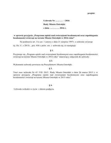 projekt Uchwała Nr ………. / 2016 Rady Miasta Ostrołęki z dnia …………. 2016 r. w sprawie przyjęcia „Programu opieki nad zwierzętami bezdomnymi oraz zapobiegania bezdomności zwierząt na terenie Miasta Ostrołęki w 2016 roku” Na podstawie art. 11a ust. 1 ustawy z dnia 21 sierpnia 1997r. o ochronie zwierząt (tj. Dz. U. z 2013r. , poz. 856 z późn. zm. ) uchwala się, co następuje: § 1. Przyjmuje się „Program opieki nad zwierzętami bezdomnymi oraz zapobiegania bezdomności zwierząt na terenie Miasta Ostrołęki w 2016 roku” stanowiący załącznik do uchwały. § 2. Wykonanie uchwały powierza się Prezydentowi Miasta Ostrołęki. § 3. Traci moc uchwała Nr 43 /VII/ 2015 Rady Miasta Ostrołęki z dnia 26 marca 2015 r. w sprawie przyjęcia „Programu opieki nad zwierzętami bezdomnymi oraz zapobiegania bezdomności zwierząt na terenie Miasta Ostrołęki w 2015 roku”. § 4. Uchwała wchodzi w życie z dniem podjęcia. Załącznik do projektu uchwały Nr……… /2016 Rady Miasta Ostrołęki z dnia ……… 2016 r w sprawie przyjęcia Programu opieki nad zwierzętami bezdomnymi oraz zapobiegania bezdomności zwierząt na terenie Miasta Ostrołęki w 2016 roku Program opieki nad zwierzętami bezdomnymi oraz zapobiegania bezdomności zwierząt na terenie Miasta Ostrołęki w 2016 roku Wprowadzenie: „Zwierzę, jako istota żyjąca, zdolna do odczuwania cierpienia nie jest rzeczą Człowiek jest mu winien poszanowanie, ochronę i opiekę „ ( art. 1 ustawy z dnia 21 sierpnia 1997 r. o ochronie zwierząt). Program ma zastosowanie do wszystkich zwierząt domowych, w szczególności psów i kotów, w tym kotów wolno żyjących oraz zwierząt gospodarskich. Większość działań określonych w Programie dotyczy psów i kotów, ponieważ skala bezdomności tych zwierząt jest największa w całym kraju, jak również w Ostrołęce. Bezdomność zwierząt jest zjawiskiem społecznym, którego głównymi przyczynami są: • niekontrolowane rozmnażanie, • porzucanie zwierząt przez właścicieli, • ucieczki zwierząt, • łatwość pozyskiwania zwierząt, • panujące mody na dane rasy zwierząt, • brak edukacji i wiedzy społeczeństwa w zakresie metod zapobiegania bezdomności ze szczególnym uwzględnieniem sterylizacji i kastracji. Elektroniczne znakowanie ( czipowanie ) zwierząt to jedna z głównych metod zapobiegania bezdomności zwierząt dlatego też schronisko „ Canis” w Kruszewie gm. Goworowo dla bezdomnych zwierząt z którym Miasto ma podpisano umowę będzie na bieżąco czipowało zwierzęta adoptowane ze schroniska. Ze schroniska „ CANIS” w Kruszewie gm. Goworowo miesięcznie jest adoptowanych około 12 sztuk psów, rocznie jest to około 150 sztuk psów z tego 58 psów z terenu Miasta Ostrołęki adoptowanych przez nowych właścicieli. Dane o zaczipowanych zwierzętach będą wprowadzane do Bazy Safe – Animal , zrzeszonej w European Pet Network co pozwoli na szybkie odnajdywanie właścicieli zagubionych zwierząt. Sterylizacja lub kastracja ( pozbawienie możliwości rozmnażania) zwierząt bezdomnych oraz domowych to norma we wszystkich cywilizowanych krajach oraz najskuteczniejsza metoda unikania niekontrolowanej rozrodczości zwierząt. Program zakłada zachęcanie właścicieli zwierząt do ich sterylizacji i kastracji, poprzez prowadzenie działań edukacyjnoinformacyjnych oraz akcji dofinansowania tych zabiegów. Koty wolno żyjące, bytujące głównie w piwnicach budynków mieszkalnych, są elementem ekosystemu miejskiego, a ich obecność zapobiega rozprzestrzenianiu się gryzoni ( myszy i szczurów). Koty te nie są zwierzętami bezdomnymi, dlatego nie należy ich wyłapywać ani wywozić, lecz stwarzać warunki bytowania w miejscach ich dotychczasowego schronienia. W celu kontroli populacji kotów wolno żyjących, w tym ich zdrowotności Urząd Miasta Ostrołęki finansuje zabiegi sterylizacji lub kastracji oraz leczenie tych zwierząt. Ponadto, wspiera osoby społecznie opiekujące się tymi zwierzętami ( karmicieli) poprzez zapewnienie karmy, w celu dokarmiania kotów. Realizacja wszystkich zadań, określonych w rozdziale 4 Programu, zmierza do ograniczenia liczby bezdomnych zwierząt trafiających pod opiekę schroniska dla bezdomnych zwierząt i organizacji społecznych, działających na terenie Miasta Ostrołęki, których statutowym celem działania jest ochrona zwierząt. Rozdział I POSTANOWIENIA OGÓLNE § 1. Ilekroć w uchwale jest mowa o: 1) „urzędzie”, należy przez to rozumieć Urząd Miasta Ostrołęki, 2) „Wydziale Gospodarki Komunalnej i Ochrony Środowiska” należy przez to rozumieć komórkę organizacyjną Urzędu Miasta Ostrołęki, 3) „schronisku”, należy przez to rozumieć Schronisko dla Bezdomnych Zwierząt „ CANIS” w Kruszewie gm. Goworowo, 4) „Straży Miejskiej Ostrołęki” należy przez to rozumieć komórkę organizacyjną Urzędu Miasta Ostrołęki, 5) „programie”, należy przez to rozumieć Program opieki nad zwierzętami bezdomnymi oraz zapobiegania bezdomności zwierząt na terenie Miasta Ostrołęki w 2016 rok,. 6) „mieście” należy przez to rozumieć Miasto Ostrołęka. § 2. Koordynatorem programu jest Prezydent Miasta Ostrołęki. Rozdział 2 CEL I ZADANIA PROGRAMU § 3. 1. Celem programu jest zapobieganie bezdomności zwierząt na terenie Miasta oraz opieka nad zwierzętami bezdomnymi. 2. Zadania priorytetowe programu to: 1) elektroniczne znakowanie ( czipowanie) zwierząt, w szczególności psów, 2) ograniczenie populacji bezdomnych zwierząt poprzez sterylizację i kastrację zwierząt domowych , w szczególności psów i kotów, 3) zapewnienie opieki bezdomnym zwierzętom z terenu Miasta Ostrołęki, 4) sprawowanie opieki nad kotami wolno żyjącymi, w tym ich dokarmianie, 5) poszukiwanie nowych właścicieli dla bezdomnych zwierząt, 6) odławianie bezdomnych zwierząt, 7) zapewnienie całodobowej opieki weterynaryjnej w przypadkach zdarz