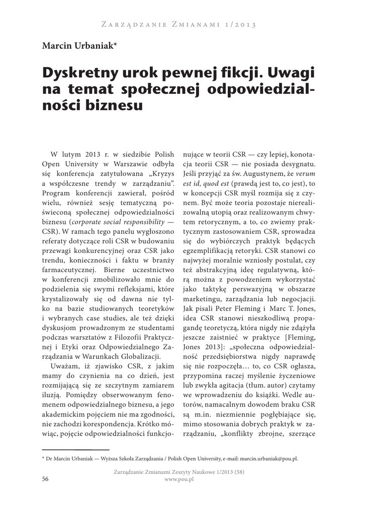 Z Z / Marcin Urbaniak* Dyskretny urok pewnej fikcji. Uwagi na temat społecznej odpowiedzialności biznesu W lutym 2013 r. w siedzibie Polish Open University w Warszawie odbyła się konferencja zatytułowana „Kryzys a współczesne trendy w zarządzaniu”. Program konferencji zawierał, pośród wielu, również sesję tematyczną poświeconą społecznej odpowiedzialności biznesu (corporate social responsibility — CSR). W ramach tego panelu wygłoszono referaty dotyczące roli CSR w budowaniu przewagi konkurencyjnej oraz CSR jako trendu, konieczności i faktu w branży farmaceutycznej. Bierne uczestnictwo w konferencji zmobilizowało mnie do podzielenia się swymi refleksjami, które krystalizowały się od dawna nie tylko na bazie studiowanych teoretyków i wybranych case studies, ale też dzięki dyskusjom prowadzonym ze studentami podczas warsztatów z Filozofii Praktycznej i Etyki oraz Odpowiedzialnego Zarządzania w Warunkach Globalizacji. Uważam, iż zjawisko CSR, z jakim mamy do czynienia na co dzień, jest rozmijającą się ze szczytnym zamiarem iluzją. Pomiędzy obserwowanym fenomenem odpowiedzialnego biznesu, a jego akademickim pojęciem nie ma zgodności, nie zachodzi korespondencja. Krótko mówiąc, pojęcie odpowiedzialności funkcjo- nujące w teorii CSR — czy lepiej, konotacja teorii CSR — nie posiada desygnatu. Jeśli przyjąć za św. Augustynem, że verum est id, quod est (prawdą jest to, co jest), to w koncepcji CSR myśl rozmija się z czynem. Być może teoria pozostaje nierealizowalną utopią oraz realizowanym chwytem retorycznym, a to, co zwiemy praktycznym zastosowaniem CSR, sprowadza się do wybiórczych praktyk będących egzemplifikacją retoryki. CSR stanowi co najwyżej moralnie wzniosły postulat, czy też abstrakcyjną ideę regulatywną, którą można z powodzeniem wykorzystać jako taktykę perswazyjną w obszarze marketingu, zarządzania lub negocjacji. Jak pisali Peter Fleming i Marc T. Jones, idea CSR stanowi nieszkodliwą propagandę teoretyczą, która nigdy nie zdążyła jeszcze zaistnieć w praktyce [Fleming, Jones 2013]: „społeczna odpowiedzialność przedsiębiorstwa nigdy naprawdę się nie rozpoczęła… to, co CSR ogłasza, przypomina raczej myślenie życzeniowe lub zwykła agitacja (tłum. autor) czytamy we wprowadzeniu do książki. Wedle autorów, namacalnym dowodem braku CSR są m.in. niezmiennie pogłębiające się, mimo stosowania dobrych praktyk w zarządzaniu, „konflikty zbrojne, szerzące * Dr Marcin Urbaniak — Wyższa Szkoła Zarządzania / Polish Open University, e-mail: [email protected]. 56 Zarządzanie Zmianami Zeszyty Naukowe 1/2013 (58) www.pou.pl się ubóstwo czy ekologiczne zniszczenia” (tłum. autor) [Fleming, Jones 2013, s. 96]. We wstępie chciałbym również poczynić drobne uwagi wobec ewentualnych głosów krytycznych, a takich nie powinno zabraknąć. Po pierwsze uważam, iż każde przedsiębiorstwo (ze swej natury) jest teoretycznie odpowiedzialne społecznie, na każdym ciąży powinność odpowiadania za swą działalność. Jednak między teorią i powinnością a realizacją i praktycznym wykonaniem jest przepaść — „pomiędzy koncepcję i kreację pada Cień”, jak pisał niegdyś Th. S. Eliot w Wydrążonych ludziach. Po drugie, niniejszy artykuł porusza konkretne kwestie i nie rości sobie absolutnie pretensji do kompleksowego spojrzenia na problematykę CSR — jest ona zbyt obszerna, wobec czego autor siłą rzeczy pominął wiele istotnych zagadnień (jak np. zasada stakeholders value), aby skupić się na kilku arbitralnie zaakcentowanych kwestiach. *** O jakiej konotacji teorii CSR piszę? Posługuję się pojęciem odpowiedzialności zaprezentowanym przez Romana Ingardena w rozprawie O odpowiedzialności i jej podstawach ontycznych wzbogaconym o własności wskazane przez trzech innych myślicieli [Ingarden 1987]. Warto przypomnieć pokrótce, czym charakteryzuje się odpowiedzialność w wykładni Ingardena: „Przede wszystkim trzeba odróżnić cztery rozmaite sytuacje, w których występuje fenomen odpowiedzialności: § ktoś ponosi odpowiedzialność za coś albo inaczej mówiąc, jest za coś odpowiedzialny, § ktoś podejmuje odpowiedzialność za coś, § ktoś jest za coś pociągany do odpowiedzialności, § ktoś działa odpowiedzialnie” [Ingarden 1987, s. 74]. Osoba ludzka staje się automatycznie podmiotem odpowiedzialności jako autor swych czynów i niezależnie od woli odpowiadania za te czyny lub nie. Istnieją przypadki, gdy dokonaliśmy pewnego czynu wbrew własnemu sumieniu i przekonaniom; gdy ulegliśmy nałogowi czy przemożnej żądzy i nie potrafiliśmy samodzielnie się powstrzymać. Także wtedy — twierdzi Ingraden — jest to nasz własny czyn, za który odpowiadamy. Dopiero gdy działamy pod całkowitym przymusem zewnętrznych okoliczności, „kiedy wszystko jest wymuszone i w niczym nie przyzwolone, wtedy dopiero zachowanie człowieka nie jest jego własnym czynem” [Ingarden 1987, s. 92]. Na co dzień jednak „odpowiedzialność ciąży na sprawcy”. Akceptacja ponoszenia odpowiedzialności „jest realnym aktem psychicznym osoby, nie samym przeżyciem, i prowadzi do jakiejś zasadniczej gotowości wewnętrznej” [Ingarden 1987, s. 75], gdzie celem nie jest szybkie pozbycie się ciężaru spoczywającego na sumieniu, ale „przede wszystkim spełnienie wymagań wynikających z odpowiedzialności”. Ingarden pisał również o odpowiedzialności zbiorowej, która „zachodzi przede wszystkim wszędzie tam, gdzie działanie opiera się na podjętej wspólnie z innymi ludźmi decyzji” [Ingarden 1987, s. 87]. Tak więc pojęcie czy to jednostkowej, czy kolektywnej odpowiedzialności wiąże się z męstwem ponoszenia niekorzystnych konsekwencji swych czynów oraz z permanentną gotowością do wyrzeczeń bądź zadośćuczynienia za swoje działania i efekty tych działań. Sprawca, który jest odpowiedzialny za działania o 