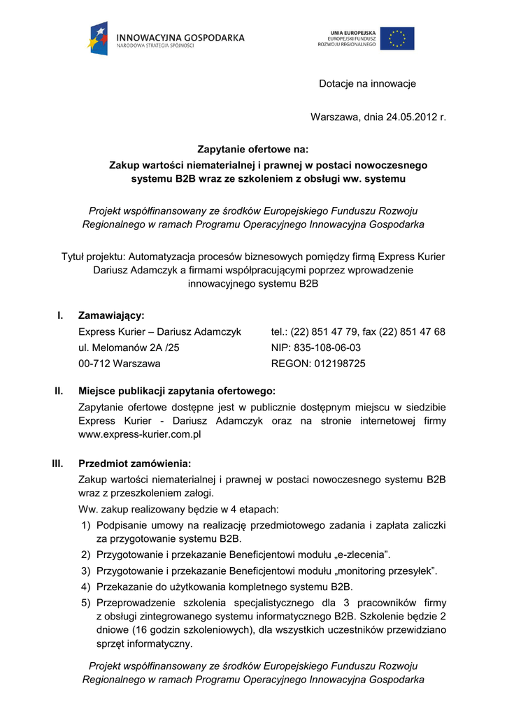 Dotacje na innowacje Warszawa, dnia 24.05.2012 r. Zapytanie ofertowe na: Zakup wartości niematerialnej i prawnej w postaci nowoczesnego systemu B2B wraz ze szkoleniem z obsługi ww. systemu Projekt współfinansowany ze środków Europejskiego Funduszu Rozwoju Regionalnego w ramach Programu Operacyjnego Innowacyjna Gospodarka Tytuł projektu: Automatyzacja procesów biznesowych pomiędzy firmą Express Kurier Dariusz Adamczyk a firmami współpracującymi poprzez wprowadzenie innowacyjnego systemu B2B I. II. Zamawiający: Express Kurier – Dariusz Adamczyk tel.: (22) 851 47 79, fax (22) 851 47 68 ul. Melomanów 2A /25 NIP: 835-108-06-03 00-712 Warszawa REGON: 012198725 Miejsce publikacji zapytania ofertowego: Zapytanie ofertowe dostępne jest w publicznie dostępnym miejscu w siedzibie Express Kurier - Dariusz Adamczyk oraz na stronie internetowej firmy www.express-kurier.com.pl III. Przedmiot zamówienia: Zakup wartości niematerialnej i prawnej w postaci nowoczesnego systemu B2B wraz z przeszkoleniem załogi. Ww. zakup realizowany będzie w 4 etapach: 1) Podpisanie umowy na realizację przedmiotowego zadania i zapłata zaliczki za przygotowanie systemu B2B. 2) Przygotowanie i przekazanie Beneficjentowi modułu „e-zlecenia”. 3) Przygotowanie i przekazanie Beneficjentowi modułu „monitoring przesyłek”. 4) Przekazanie do użytkowania kompletnego systemu B2B. 5) Przeprowadzenie szkolenia specjalistycznego dla 3 pracowników firmy z obsługi zintegrowanego systemu informatycznego B2B. Szkolenie będzie 2 dniowe (16 godzin szkoleniowych), dla wszystkich uczestników przewidziano sprzęt informatyczny. Projekt współfinansowany ze środków Europejskiego Funduszu Rozwoju Regionalnego w ramach Programu Operacyjnego Innowacyjna Gospodarka Dotacje na innowacje Wdrożenie systemu na każdym etapie jego przygotowania w trakcie realizacji projektu zostanie potwierdzone częściowym protokołem odbioru, zaś po przeprowadzeniu testów końcowym protokołem odbioru. System ma być aplikacją napisaną w technologii Java Enterprise Edition, opartą na koncepcji SOA/ESB. Dzięki takiej architekturze ma być możliwe dowolne konfigurowanie przepływu dokumentów między systemami Beneficjenta oraz jego kontrahentów. W ramach systemu ma nastąpić: Zaimplementowanie systemu B2B oraz jego integracja z systemami partnerów, Stworzenie portalu internetowego umożliwiającego partnerom śledzenie transakcji realizowanych w systemie, podgląd statusów, zadłużenia i zobowiązań. System B2B ma na celu usprawnienie wymiany danych między kontrahentami w procesach handlowych zachodzących w firmie Express Kurier Dariusz Adamczyk przez zastąpienie dokumentów PDF wysyłanych pocztą email na automatyczne przetwarzanie dokumentów w formacie EDI. W szczególności automatyzacja ma objąć następujące rodzaje dokumentów: Zapytanie o cenę Oferta Zamówienie Zestawienie faktur i płatności Dokumenty transportowe Do funkcjonalności systemu B2B musi należeć: Składanie/inicjowanie obsługi zamówień; Monitorowanie statusów i rozliczeń realizowanych zleceń i kontraktów; Rozliczenia kontrahentów; Dostęp do obrazów faktur; Weryfikowanie przez partnerów poprawności danych podstawowych; Zarządzanie kontaktami z kontrahentami i obsługa towarzyszących zdarzeń/dokumentacji (zamówień, umów, faktur); Możliwość konfiguracji i dostosowania do specyfiki firmy; Obsługa wielu i zagranicznych; języków, możliwość obsługi transakcji krajowych Obsługa elektronicznej wymiany danych (EDI); Projekt współfinansowany ze środków Europejskiego Funduszu Rozwoju Regionalnego w ramach Programu Operacyjnego Innowacyjna Gospodarka Dotacje na innowacje Wsparcie w sprzedaży – generowanie cennikami, rabatami, płatnościami; dokumentów, zarządzanie Wsparcie w przygotowywaniu ofert – kalkulowanie ofert pod klientów z uwzględnieniem wszystkich informacji znajdujących się w bazach danych systemu; Monitorowanie realizacji przyjętej oferty; Konfiguracja transakcji; cenników dla produktów, klientów, poszczególnych Zarządzanie transportem (filtrowanie zleceń, alokowanie środków transportu, odbiór towaru, dostawa towaru, wymiana dokumentów, dostarczenie statusu realizacji zlecenia, wymiana palet, rozliczenia finansowe); Przyjmowanie, rejestrowanie realizacji zleceń, zleceń transportowych, potwierdzenie Archiwizacja wykonanych operacji transportowych; Zapewnia możliwości komunikacji elektronicznej z wszystkimi partnerami, niezależnie czy używają we własnej organizacji EDI czy nie; Historia i wydruk zamówień; Śledzenie statusów dokumentów; Dedykowane oprogramowanie pozwalające automatycznie przekazywać dokumenty pomiędzy interfejsem wewnętrznego systemu finansowoksięgowego, a środowiskiem systemu B2B; Przyjmowanie/wysyłanie dokumentów elektronicznych; Translacja dokumentów do formatu interfejsu systemu wewnętrznego; Translacja dokumentów do formatu XML i przekazanie ich do systemów partnerów handlowych (routing). Ze względu na szeroki zakres możliwości integracyjnych systemu B2B Beneficjent nie przewiduje wystąpienia ograniczeń technologicznych odnośnie integracji systemu Beneficjenta z systemami przedsiębiorców współpracujących. Poniżej przedstawiono zakres możliwości integracyjnych: Integracja z systemami ERP i FK przedsiębiorstw (m.in. SAP, RAKS, Symfonia, WF-Mag itp.), Konwertery danych z wielu aplikacji, w tym z oprogramowania RAKS oraz mechanizmy importu danych, Wszechstronne wykorzystanie usług sieciowych do komunikacji pomiędzy różnymi aplikacjami/modułami, Projekt współfinansowany ze środków Europejskiego Funduszu Rozwoju Regionalnego w ramach Programu Operacyjnego Innowacyjna Gospodarka Dotacje na innowacje Integracja z systemami ERP firm użytkowników, integracja z istniejącymi systemami partnerów, migracja danych, import z innych systemów, wprowadzanie ofert na formularzach internetowych, Różne poziomy integracji/peł