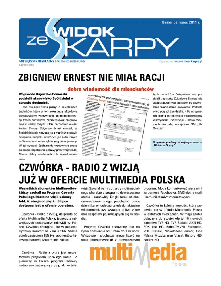 Magazyn mieszkańców SM „Na Skarpie” Numer 52, lipiec 2011 r. MIESIĘCZNIK BEZPŁATNY NAKŁAD 8000 EGZEMPLARZY Czytaj nas też: www.smnaskarpie.pl ISO 9001:2008 ZBigniew Ernest nie miał racji dobra wiadomość dla mieszkańców Wojewoda Kujawsko-Pomorski podzielił stanowisko Spółdzielni w sprawie dociepleń. tych budynków. Wojewoda nie podzielił poglądów Zbigniewa Ernesta nie znajdując żadnych podstaw, by pozwolenie na ocieplenie unieważnić. Podzielił więc pogląd Spółdzielni. - Po otrzymaniu pisma natychmiast rozpoczęliśmy wstrzymane inwestycje - mówi Wojciech Piechota, wiceprezes SM „Na Skarpie”. Dwa miesiące temu pisząc o ociepleniach budynków, które w tym roku będą rekordowe tłumaczyliśmy wstrzymanie termomodernizacji trzech budynków. Zaprotestował Zbigniew Ernest, radny miejski (PIS), na codzień mieszkaniec Skarpy. Zbigniew Ernest uważał, że Spółdzielnia nie zapytała go o zdanie w sprawie ocieplenia budynku w którym jak setki innych osób mieszka i zaskarżył decyzję do wojewody. W tej sytuacji Spółdzielnia wstrzymała pracę do czasu rozpatrzenia sprawy przez wojewodę. Mamy dobrą wiadomość dla mieszkańców O sprawie pisaliśmy w majowym numerze „Widoku ze Skarpy” reklama Czwórka - radio z Wizją już w ofercie Multimedia Polska Wszystkich abonentów Multimediów, którzy czekali na Program Czwarty Polskiego Radia na wizji, ucieszy fakt, iż stacja od piątku 8 lipca dostępna jest w ofercie operatora. Czwórka - Radio z Wizją, dołączyła do oferty Multimedia Polska, jednego z największych dostawców telewizji w Polsce. Czwórka dostępna jest w pakiecie Cyfrowy Komfort na kanale 566. Stacja objęła zasięgiem 155 tys. abonentów telewizji cyfrowej Multimedia Polska. Czwórka - Radio z wizją jest nowatorskim projektem Polskiego Radia. To pierwszy w Polsce program radiowy nadawany tradycyjną drogą, jak i w tele- wizji. Specjalnie na potrzeby multimedialnego charakteru programu dostosowano studio i ramówkę. Dzięki temu słuchacze-widzowie mogą podglądać pracę dziennikarzy, oglądać teledyski, aktualne wiadomości, czy występy dj’òw, vj’òw oraz zespołów pojawiających się w studiu. Program Czwórki nadawany jest na żywo codziennie od 6 rano do 1 w nocy. Widzowie i słuchacze mogą liczyć na stałą interaktywność z prowadzącymi program. Mogą komunikować się z nimi za pomocą Facebooka, SMS-ów, e-maili i komunikatorów internetowych. Czwórka to kolejna nowość, która pojawiła się w ofercie Multimedia Polska w ostatnich miesiącach. W maju spółka dołączyła do swojej oferty 10 nowych kanałów: TVP HD, TVP Seriale, AXN HD, FOX Life HD, Rebel.TV,VH1 European, VH1 Classic, Nickelodeon Junior, Kino Polska Muzyka oraz Viasat History HD/ Nature HD.