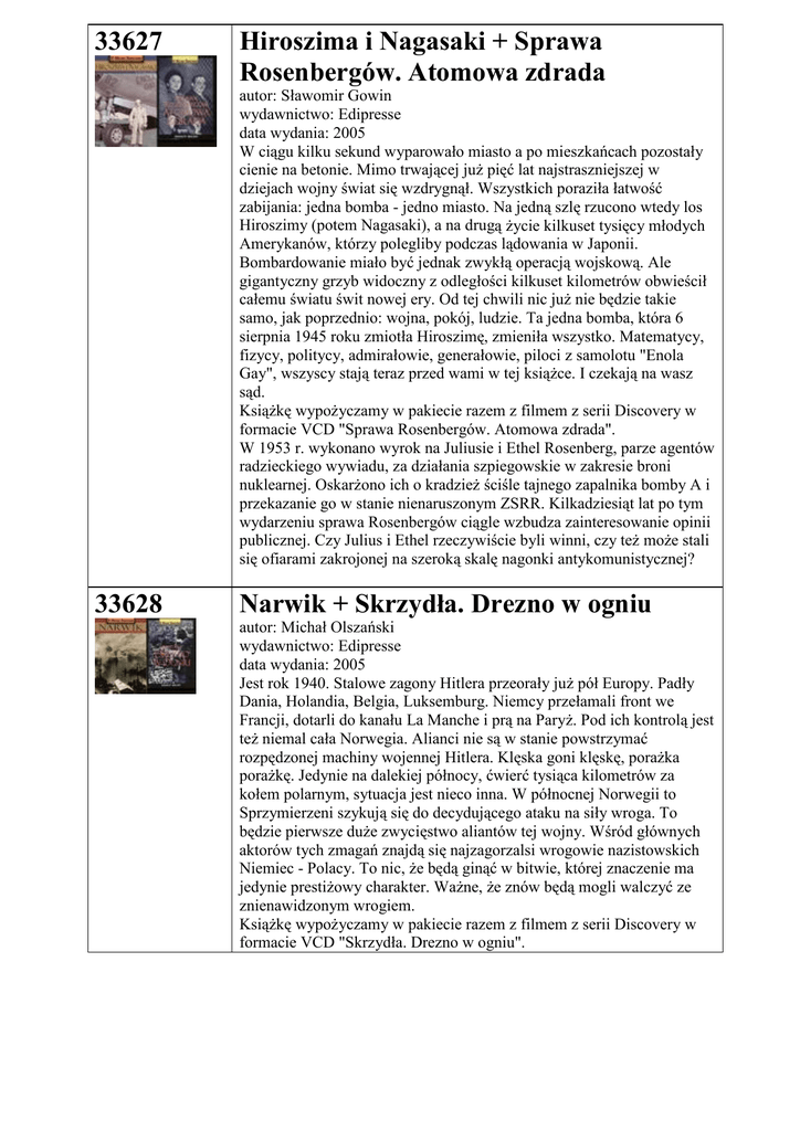 33627 Hiroszima i Nagasaki + Sprawa Rosenbergów. Atomowa zdrada autor: Sławomir Gowin wydawnictwo: Edipresse data wydania: 2005 W ciągu kilku sekund wyparowało miasto a po mieszkańcach pozostały cienie na betonie. Mimo trwającej już pięć lat najstraszniejszej w dziejach wojny świat się wzdrygnął. Wszystkich poraziła łatwość zabijania: jedna bomba - jedno miasto. Na jedną szlę rzucono wtedy los Hiroszimy (potem Nagasaki), a na drugą życie kilkuset tysięcy młodych Amerykanów, którzy polegliby podczas lądowania w Japonii. Bombardowanie miało być jednak zwykłą operacją wojskową. Ale gigantyczny grzyb widoczny z odległości kilkuset kilometrów obwieścił całemu światu świt nowej ery. Od tej chwili nic już nie będzie takie samo, jak poprzednio: wojna, pokój, ludzie. Ta jedna bomba, która 6 sierpnia 1945 roku zmiotła Hiroszimę, zmieniła wszystko. Matematycy, fizycy, politycy, admirałowie, generałowie, piloci z samolotu "Enola Gay", wszyscy stają teraz przed wami w tej książce. I czekają na wasz sąd. Książkę wypożyczamy w pakiecie razem z filmem z serii Discovery w formacie VCD "Sprawa Rosenbergów. Atomowa zdrada". W 1953 r. wykonano wyrok na Juliusie i Ethel Rosenberg, parze agentów radzieckiego wywiadu, za działania szpiegowskie w zakresie broni nuklearnej. Oskarżono ich o kradzież ściśle tajnego zapalnika bomby A i przekazanie go w stanie nienaruszonym ZSRR. Kilkadziesiąt lat po tym wydarzeniu sprawa Rosenbergów ciągle wzbudza zainteresowanie opinii publicznej. Czy Julius i Ethel rzeczywiście byli winni, czy też może stali się ofiarami zakrojonej na szeroką skalę nagonki antykomunistycznej? 33628 Narwik + Skrzydła. Drezno w ogniu autor: Michał Olszański wydawnictwo: Edipresse data wydania: 2005 Jest rok 1940. Stalowe zagony Hitlera przeorały już pół Europy. Padły Dania, Holandia, Belgia, Luksemburg. Niemcy przełamali front we Francji, dotarli do kanału La Manche i prą na Paryż. Pod ich kontrolą jest też niemal cała Norwegia. Alianci nie są w stanie powstrzymać rozpędzonej machiny wojennej Hitlera. Klęska goni klęskę, porażka porażkę. Jedynie na dalekiej północy, ćwierć tysiąca kilometrów za kołem polarnym, sytuacja jest nieco inna. W północnej Norwegii to Sprzymierzeni szykują się do decydującego ataku na siły wroga. To będzie pierwsze duże zwycięstwo aliantów tej wojny. Wśród głównych aktorów tych zmagań znajdą się najzagorzalsi wrogowie nazistowskich Niemiec - Polacy. To nic, że będą ginąć w bitwie, której znaczenie ma jedynie prestiżowy charakter. Ważne, że znów będą mogli walczyć ze znienawidzonym wrogiem. Książkę wypożyczamy w pakiecie razem z filmem z serii Discovery w formacie VCD "Skrzydła. Drezno w ogniu". 39010 Wielka kolekcja sławnych malarzy, t.39 Gustave Courbet + DVD Wydawnictwo: Oxford Educational Wielka kolekcja sławnych malarzy - Gustave Courbet (39). Kolekcja wielkoformatowych albumów z doskonałą jakością reprodukcji na papierze kredowym. Z każdym tomem płyta DVD z kolekcją filmów pokazujących tajemnice malarskiego warsztatu. 39011 Wielka kolekcja sławnych malarzy, t.38 Caspar David Friedrich + DVD Wydawnictwo: Oxford Educational Wielka kolekcja sławnych malarzy - Caspar David Friedrich (38). Kolekcja wielkoformatowych albumów z doskonałą jakością reprodukcji na papierze kredowym. Z każdym tomem płyta DVD z kolekcją filmów pokazujących tajemnice malarskiego warsztatu. 39013 Wielka kolekcja sławnych malarzy, t.21 Georges Seurat + DVD Wydawnictwo: Oxford Educational Wielka kolekcja sławnych malarzy - Georges Seurat (21). Kolekcja wielkoformatowych albumów z doskonałą jakością reprodukcji na papierze kredowym. Z każdym tomem płyta DVD z kolekcją filmów pokazujących tajemnice malarskiego warsztatu.Georges Seurat zmarł młodo, zaledwie kilka lat po rozpoczęciu kariery malarskiej. Uważał, że sztuka powinna opierać się na systemie; był twórcą nowego kierunku w malarstwie - postimpresjonizmu. Seurat to przykład artysty, którego dzieło przysłoniło człowieka. Jego obrazy skomponowane z tysięcy plamek są stosunkowo znane, natomiast o ich autorze wiadomo niewiele. 39014 Wielka kolekcja sławnych malarzy, t.25 - Henri Matisse + DVD Wydawnictwo: Oxford Educational Wielka kolekcja sławnych malarzy - Henri Matisse (25). Kolekcja wielkoformatowych albumów z doskonałą jakością reprodukcji na papierze kredowym. Z każdym tomem płyta DVD z kolekcją filmów pokazujących tajemnice malarskiego warsztatu. Długie, osiemdziesięciopięcioletnie życie Henriego Matisse'a objęło czasy rewolucji w sztuce. Artyści, poszukując nowych form wyrazu, odrzucali estetykę opartą na antycznych kanonach. Początkowo Matisse poddał się wpływom impresjonizmu, ale szybko od niego odszedł, by współtworzyć kierunek nazwany fowizmem, kładący nacisk na nieskrępowane użycie koloru jako środka artystycznego. Charakterystykę obrazów francuskiego mistrza można ująć w trzech słowach: barwa, światło, harmonia. 39015 Wielka kolekcja sławnych malarzy, t.37 James Whistler + DVD Wydawnictwo: Oxford Educational Wielka kolekcja sławnych malarzy -James Whistler (37). Kolekcja wielkoformatowych albumów z doskonałą jakością reprodukcji na papierze kredowym. Doskonały album i filmy o największych malarzach świata. Z każdym tomem płyta DVD z kolekcją filmów pokazujących tajemnice malarskiego warsztatu. 39016 Wielka kolekcja sławnych malarzy, t.40 - John Constable + DVD Wydawnictwo: Oxford Educational Wielka kolekcja sławnych malarzy - John Constable (40). Kolekcja wielkoformatowych albumów z doskonałą jakością reprodukcji na papierze kredowym. Z każdym tomem płyta DVD z kolekcją filmów pokazujących tajemnice malarskiego warsztatu. 39600 Zemsta. Omówienie lektury szkolnej (+ DVD) Stare zamczysko gdzieś w dawnej Polsce i jego mieszkańcy. Dwaj śmiertelni wrogowie toczą od lat prywatn
