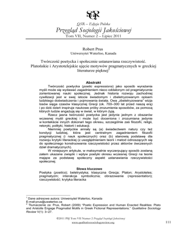 QSR – Edycja Polska Przegląd Socjologii Jakościowej Tom VII, Numer 2 – Lipiec 2011 Robert Prus1 Uniwersytet Waterloo, Kanada Twórczość poetycka i społecznie ustanawiana rzeczywistość. Platońskie i Arystotelejskie ujęcie motywów pragmatycznych w greckiej literaturze pięknej2 Abstrakt Twórczość poetycka (poetic expressions) jako sposób wyrażania myśli może się wydawać zagadnieniem nieco oddalonym od pragmatycznie zorientowanej nauki społecznej. Jednak historia rozwoju zachodniej cywilizacji jest w swej istocie świadomym i zbeletryzowanym opisem ludzkiego doświadczenia i pojmowania świata. Owa „zbeletryzowana” wizja losów sięga czasów klasycznej Grecji (ok. 700–300 lat przed naszą erą) i po dziś dzień inspiruje naukowe próby zrozumienia sposobów, za pomocą których ludzie angażują się w świat, w którym żyją. Rzecz jasna twórczość poetycka jest jedynie jednym z obszarów wczesnej myśli greckiej i może być doceniona i zrozumiana jedynie w kontekście innych dokonań tego okresu, szczególnie zaś filozofii, religii, retoryki, polityki, historii i edukacji. Niemniej poetyckie annały są (a) świadectwem natury czy też kondycji ludzkiej, która jest centralnym zagadnieniem filozofii pragmatycznej (i nauk społecznych) oraz (b) stanowią podstawę dla rozwoju krytyki literackiej (z uwzględnieniem teorii i metod odnoszących się do społecznego konstruowania rzeczywistości przez aktorów ówczesnych dzieł dramatycznych). W niniejszym artykule, w maksymalnie wyczerpujący sposób zostaną zatem ukazane związki i wpływ poetyki okresu wczesnej Grecji na teorie mające za podstawę społeczny aspekt ustanawiania rzeczywistości społecznej. Słowa kluczowe Poetyka (poetics); beletrystyka; klasyczna Grecja; Platon; Arystoteles; pragmatyzm; interakcja symboliczna; obrazowanie (representation); rzeczywistość; krytyka literacka 1 Dane adresowe autora: Uniwersytet Waterloo, Kanada E-mail:[email protected] 2 Tłumaczenie za: Prus, Robert (2009) “Poetic Expression and Human Enacted Realities: Plato and Aristotle Engage Pragmatist Motifs in Greek Fictional Representations.” Qualitative Sociology Review V(1): 3–27. ©2011 PSJ Tom VII Numer 2 Przegląd Socjologii Jakościowej www.qualitativesociologyreview.org 111 Na pierwszy rzut oka może się wydawać, że poetyka lub też świadomie zbeletryzowane ludzkie losy doby klasycznej Grecji (ok. 700–300 p.n.e.) nie mogą stanowić inspiracji dla pragmatycznych koncepcji życia społecznego. Jednak te związki zostaną zaprezentowane w niniejszym artykule. Jeśli nie będziemy kurczowo trzymać się tezy, że dzieła natury poetyckiej są wizjonerskim substytutem dokonań socjologicznych, to okaże się, że korzeni socjologicznych teorii życia społecznego należy szukać w dokonaniach Homera, Platona, Arystotelesa i innych twórców epoki klasycznej Grecji. Zatem dużo wcześniej niż w dziewiętnastowiecznych pismach Comte‟a, Durkheima, Marksa i Webera. Chociaż powyższa teza może być dla niektórych nie do przyjęcia, to jednak inni, sięgając do dorobku literatury greckiej, mogą tam odnaleźć „socjologicznie” ważkie treści. Dyskusja prowadzona w niniejszym artykule koncentruje się na poetyce, jednakże podobną debatę można prowadzić w odniesieniu do klasycznego rozumienia retoryki, religii, filozofii, historii stosunków etnicznych, polityki i edukacji. Wszystkie te obszary zainteresowania mogą inspirować socjologiczne pojmowanie zagadnień życia zbiorowego (Prus 2004, 2007a, 2008a). Ten artykuł nawiązuje również do szeroko dyskutowanego przez interakcjonistów problemu społecznego konstruowania reguł rozumienia rzeczywistości i jej ustanawiania na przestrzeni wieków (Mead 1934; Blumer 1969; Prus 1996, 1997, 1999; Prus, Grills 2003). Prezentowane tutaj tezy stanowią zaś przyczynek dla zrozumienia znaczenia tekstów napisanych w dobie klasycznej Grecji dla współczesnych nauk społecznych. Zdając sobie sprawę, że wielu czytelników będzie miało jedynie mgliste pojęcie o wczesnej literaturze greckiej, zdecydowałem się oswoić ten analizowany materiał poprzez odwołanie się do bardziej powszechnych terminów. Czytelnicy lepiej zaznajomieni ze wspomnianą literaturą dostrzegą tu nieco „poetyckiej swobody” (poetic license), na jaką pozwoliłem sobie w celu rozwinięcia twierdzeń obecnych w tym tekście. Mając na uwadze pragmatyczną tradycję, której rdzeniem są założenia opartej na języku intersubiektywności (linguistically informed intersubiectivity) i społecznie ustanawianej rzeczywistości (human enacted realities), zasadniczo oparłem się na źródłach, w których owe założenia są przedstawione explicite (vs. inferencyjnie). W tym przypadku termin poetyka (poetics) odnosi się do świadomie zbeletryzowanych dzieł (fictionalized representations), które niosą w sobie pewne pierwiastki rozrywkowe. Treść tych dzieł może być przekazywana na scenie, jak i w formie tekstu do samodzielnego odczytania. Mogą być one jedynie wypowiedziane lub też wsparte przez inne środki wyrazu, takie jak gra aktorów, różne przedmioty i dekoracje, dźwięki lub inne działania artystyczne. Zauważmy jednak, że istotą rozróżnienia dzieł poetyckich od innych form ekspresji (jak kształty, obrazy, ruchy i dźwięki) jest to, że dzieła te zasadniczo bazują na komunikacji językowej3. Można odnieść wrażenie, że tekst poetycki może się wiązać z wręcz nieograniczoną liczbą form przekazu. Dlatego też istotne jest dostrzeżenie znaczenia języka jako intencjonalnej i intersubiektywnej (nawet, gdy trudno to dostrzec) formy relacji w porównaniu z innymi formami (np. sztukami 3 Patrz: dwa szczególnie dogłębne studia światów artystycznych i zaangażowanych w nie ludzi: Dewey (1934) i Becker (1982). ©2011 PSJ Tom VII Numer 2 Przegląd Socjologii Jakościowej www.qualitativesociologyreview.org 112 plastycznymi, fotografi