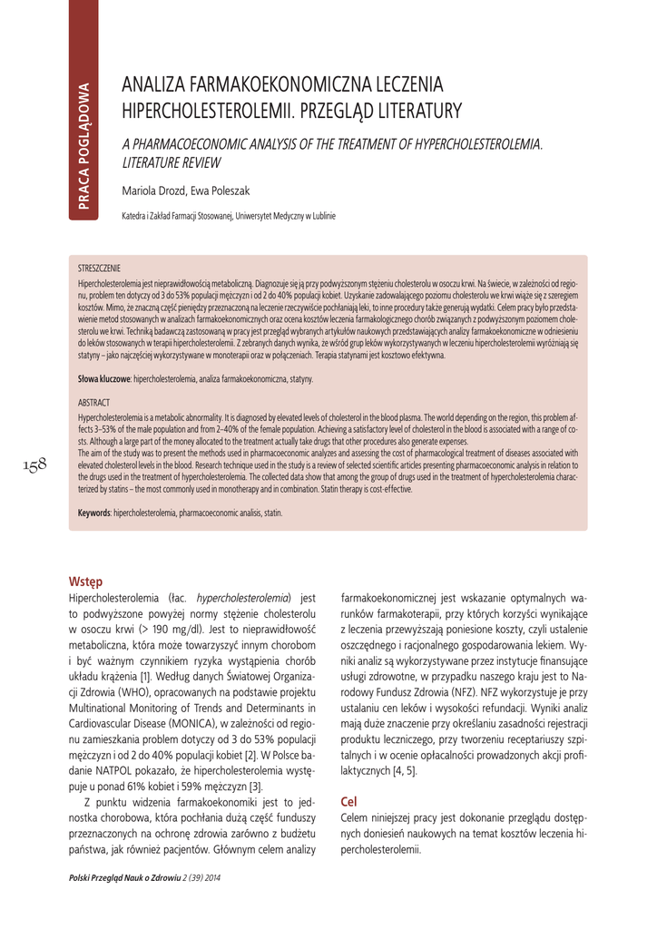 PRACA POGLĄDOWA ANALIZA FARMAKOEKONOMICZNA LECZENIA HIPERCHOLESTEROLEMII. PRZEGLĄD LITERATURY A PHARMACOECONOMIC ANALYSIS OF THE TREATMENT OF HYPERCHOLESTEROLEMIA. LITERATURE REVIEW Mariola Drozd, Ewa Poleszak Katedra i Zakład Farmacji Stosowanej, Uniwersytet Medyczny w Lublinie STRESZCZENIE Hipercholesterolemia jest nieprawidłowością metaboliczną. Diagnozuje się ją przy podwyższonym stężeniu cholesterolu w osoczu krwi. Na świecie, w zależności od regionu, problem ten dotyczy od 3 do 53% populacji mężczyzn i od 2 do 40% populacji kobiet. Uzyskanie zadowalającego poziomu cholesterolu we krwi wiąże się z szeregiem kosztów. Mimo, że znaczną część pieniędzy przeznaczoną na leczenie rzeczywiście pochłaniają leki, to inne procedury także generują wydatki. Celem pracy było przedstawienie metod stosowanych w analizach farmakoekonomicznych oraz ocena kosztów leczenia farmakologicznego chorób związanych z podwyższonym poziomem cholesterolu we krwi. Techniką badawczą zastosowaną w pracy jest przegląd wybranych artykułów naukowych przedstawiających analizy farmakoekonomiczne w odniesieniu do leków stosowanych w terapii hipercholesterolemii. Z zebranych danych wynika, że wśród grup leków wykorzystywanych w leczeniu hipercholesterolemii wyróżniają się statyny – jako najczęściej wykorzystywane w monoterapii oraz w połączeniach. Terapia statynami jest kosztowo efektywna. Słowa kluczowe: hipercholesterolemia, analiza farmakoekonomiczna, statyny. ABSTRACT 158 Hypercholesterolemia is a metabolic abnormality. It is diagnosed by elevated levels of cholesterol in the blood plasma. The world depending on the region, this problem affects 3–53% of the male population and from 2–40% of the female population. Achieving a satisfactory level of cholesterol in the blood is associated with a range of costs. Although a large part of the money allocated to the treatment actually take drugs that other procedures also generate expenses. The aim of the study was to present the methods used in pharmacoeconomic analyzes and assessing the cost of pharmacological treatment of diseases associated with elevated cholesterol levels in the blood. Research technique used in the study is a review of selected scientific articles presenting pharmacoeconomic analysis in relation to the drugs used in the treatment of hypercholesterolemia. The collected data show that among the group of drugs used in the treatment of hypercholesterolemia characterized by statins – the most commonly used in monotherapy and in combination. Statin therapy is cost-effective. Keywords: hipercholesterolemia, pharmacoeconomic analisis, statin. Wstęp Hipercholesterolemia (łac. hypercholesterolemia) jest to podwyższone powyżej normy stężenie cholesterolu w osoczu krwi (> 190 mg/dl). Jest to nieprawidłowość metaboliczna, która może towarzyszyć innym chorobom i być ważnym czynnikiem ryzyka wystąpienia chorób układu krążenia [1]. Według danych Światowej Organizacji Zdrowia (WHO), opracowanych na podstawie projektu Multinational Monitoring of Trends and Determinants in Cardiovascular Disease (MONICA), w zależności od regionu zamieszkania problem dotyczy od 3 do 53% populacji mężczyzn i od 2 do 40% populacji kobiet [2]. W Polsce badanie NATPOL pokazało, że hipercholesterolemia występuje u ponad 61% kobiet i 59% mężczyzn [3]. Z punktu widzenia farmakoekonomiki jest to jednostka chorobowa, która pochłania dużą część funduszy przeznaczonych na ochronę zdrowia zarówno z budżetu państwa, jak również pacjentów. Głównym celem analizy Polski Przegląd Nauk o Zdrowiu 2 (39) 2014 farmakoekonomicznej jest wskazanie optymalnych warunków farmakoterapii, przy których korzyści wynikające z leczenia przewyższają poniesione koszty, czyli ustalenie oszczędnego i racjonalnego gospodarowania lekiem. Wyniki analiz są wykorzystywane przez instytucje finansujące usługi zdrowotne, w przypadku naszego kraju jest to Narodowy Fundusz Zdrowia (NFZ). NFZ wykorzystuje je przy ustalaniu cen leków i wysokości refundacji. Wyniki analiz mają duże znaczenie przy określaniu zasadności rejestracji produktu leczniczego, przy tworzeniu receptariuszy szpitalnych i w ocenie opłacalności prowadzonych akcji profilaktycznych [4, 5]. Cel Celem niniejszej pracy jest dokonanie przeglądu dostępnych doniesień naukowych na temat kosztów leczenia hipercholesterolemii. Materiał i metody Techniką badawczą zastosowaną w przygotowaniu pracy jest przegląd literaturowy. Systematyczny przegląd literatury przeprowadzono pod kątem identyfikacji opublikowanych prac oryginalnych, w których, niezależnie od celu badania oraz zastosowanej metody, zostały oszacowane koszty związane z leczeniem hipercholesterolemii. Przeszukiwano bazę PubMed z datą odcięcia 23 sierpnia 2014 r. Zapytania do bazy międzynarodowej były związane z pojęciami: „costs and cost analysis”, „cost effectiveness”, „cost of illness” połączonymi ze słowem „hipercholesterolemia”. Wykluczono badania, w których nie uwzględniano kosztów oraz badania wtórne. Badanie zawężono do ostatnich 15 lat. Strategię wyboru prac do analizy przedstawiono na rycinie 1. Pierwszą pracą, zakwalifikowaną do przeglądu była praca z 1999 roku B. Jönsson, J. Cook, T. Pedersen The cost-effectiveness of lipid lowering in patients with diabetes: results from the 4S trial. Badanie dotyczyło efektywności kosztów leczenia simwastatyną u pacjentów z cukrzycą. Terapia statyną obniżyła koszty hospitalizacji, co skutkowało oszczędnościami szpitali równymi 67–69%, związanymi z kosztem leków. Koszt na uzyskany rok życia wyniósł 1600–3200 euro w odniesieniu do warunków panujących w Szwecji. Inne kraje europejskie wykazały również korzystne wskaźniki efektywności, niezależnie od różnic w poziomach wydatków ponoszonych przez jednostki służby zdrowia. [6] M.W. Russell wraz ze współpracowni