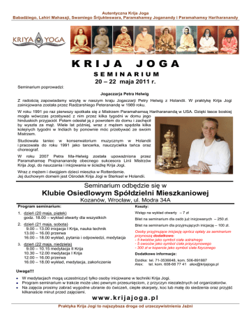 Autentyczna Krija Joga Babadżiego, Lahiri Mahasaji, Swamiego Śrijukteswara, Paramahamsy Joganandy i Paramahamsy Hariharanandy KRIJA JOGA SEMINARIUM 20 – 22 maja 2011 r. Seminarium poprowadzi: Jogaczarja Petra Helwig Z radością zapowiadamy wizytę w naszym kraju Jogaczarji Petry Helwig z Holandii. W praktykę Krija Jogi zainicjowana została przez Radżarshiego Peteranandę w 1989 roku. W roku 1991 po raz pierwszy spotkała się z Mistrzem Paramahamsą Hariharanandą w USA. Dzięki łasce boskiej mogła wówczas przebywać z nim przez kilka tygodni w domu jego hinduskich przyjaciół. Potem odesłał ją z powrotem do domu i zachęcił by wyszła za mąż. Wiele lat później, wraz z mężem spędziła kilka kolejnych tygodni w Indiach by ponownie móc przebywać ze swoim Mistrzem. Studiowała taniec w konserwatorium muzycznym w Holandii i pracowała do roku 1991 jako tancerka, nauczycielka tańca oraz choreograf. W roku 2007 Petra Ma-Helwig została upoważniona przez Paramahamsę Prajnananandę obecnego sukcesora Linii Mistrzów Krija Jogi, do nauczania i inicjowania w ścieżkę Krija Jogi. Wraz z mężem i dwojgiem dzieci mieszka w Rotterdamie. Jej duchowym domem jest Ośrodek Krija Jogi w Sterksel w Holandii. Seminarium odbędzie się w Klubie Osiedlowym Spółdzielni Mieszkaniowej Kozanów, Wrocław, ul. Modra 34A Program seminarium: Koszty: 1. dzień (20 maja, piątek) godz. 18.00 – wykład otwarty dla wszystkich Wstęp na wykład otwarty – 7 zł 2. dzień (21 maja, sobota) 9.00 – 13.00 inicjacja I Krija, nauka technik 13.00 – 16.00 przerwa 16.00 – 18.00 wykład, pytania i odpowiedzi, medytacja 3. dzień (22 maja, niedziela) 9.00 – 10.15 medytacja II Krija 10.30 – 12.00 medytacja I Krija 12.00 – 16.00 przerwa 16.00 – 18.00 wykład, medytacja, zakończenie Bilet na seminarium dla osób już inicjowanych – 250 zł. Bilet na seminarium dla przyjmujących inicjację – 100 zł. Osoby przyjmujące inicjację oprócz opłaty za seminarium przynoszą dodatkowo: - 5 kwiatów jako symbol ciała astralnego - 5 owoców jako symbol ciała przyczynowego - 300 zł w kopercie jako symbol ciała fizycznego Dodatkowe informacje: Dzidka: tel. 71-3536648, kom. 506-891887 Alex: tel. kom. 608-68 77 41 alex@ krijajoga.pl Uwaga!!! • W medytacjach mogą uczestniczyć tylko osoby inicjowane w techniki Krija Jogi. • Program seminarium w trakcie może ulec pewnym przesunięciom, z przyczyn niezależnych od organizatorów. • Na zajęcia prosimy zabrać wygodne ubranie do ćwiczeń, ciepłe skarpety, koc lub matę do siedzenia oraz przyjść kilkanaście minut przed zajęciami. www.krijajoga.pl Praktyka Krija Jogi to najszybsza droga od urzeczywistnienia Jaźni Autentyczna Krija Joga Babadżiego, Lahiri Mahasaji, Swamiego Śrijukteswara, Paramahamsy Joganandy i Paramahamsy Hariharanandy Krija Joga jest starożytną ścieżką duchową nauczaną przez nieprzerwaną linię mistrzów. Po raz pierwszy została rozpowszechniona w krajach Europy i Ameryce w latach 1920-1952 przez Paramahamsę Joganandę, który jest powszechnie znany jako autor "Autobiografii Jogina". Krija Joga... - naucza medytacji poprzez praktykę technik - naucza kontroli oddechu i sposobu na osiągnięcie spokoju - jest procesem mentalnego oczyszczania - pomaga uwolnić się z niewoli pragnień i ego - ma na celu umożliwienie osiągnięcia samorealizacji w trakcie jednego życia - jest niesekciarska i naucza, że praca jest modlitwą - naucza o pochodzeniu, przeznaczeniu i rozwoju duszy - jest lekarstwem na powszechne choroby - opiera się na bezpośrednim i natychmiastowym doświadczeniu duchowym - pogłębia zrozumienie nauk duchowych, bez względu na rodzaj wyznania religijnego - w tym samym czasie przynosi korzyści dla umysłu, intelektu i ciała - jest przekazywana przez nieprzerwaną linię urzeczywistnionych Mistrzów Korzyści wynikające z praktykowania Krija Jogi Paramamhamsa Hariharananda Świadome urzeczywistnienie jedności z duchem jest celem ludzkiego życia i świadomie lub nieświadomie każdy próbuje dotrzeć do tego celu. Człowiek, który urzeczywistnia swoją jedność z uniwersalną Jaźnią – swoją duchową egzystencją – staje się jednością z całym wszechświatem. Świadomość kosmiczna rozpościera się na cały wszechświat i wszystko przenika, natomiast świadomość człowieka jest ograniczona do ludzkiego ciała i jego środowiska. Aby osiągnąć świadomość kosmiczną należy rozszerzyć świadomość, która zamieszkuje każdą żywą komórkę ciała i mózgu. Praktyka Krija Jogi oczyszcza i pobudza umysł oraz zapewnia siłę. Ponadto magnetyzuje ciało poprzez nasycanie i odżywianie jego komórek nieprzemijającym światłem, przez co są one utrzymywane w stanie namagnetyzowania. Duch jest zrodzony z Jaźni i posiada stałą świadomość. Uwaga Boga rozprzestrzenia się wszędzie i w każdym miejscu jest jednakowo skupiona. My, ludzie stworzeni na Jego podobieństwo, posiadamy w sobie ukrytą moc koncentracji naszej uwagi i odczuwania własnego istnienia wszędzie. Poprzez właściwe posłuszeństwo wobec praw natury oraz szczerą praktykę Krija Jogi człowiek jest w stanie zwiększyć swoją świadomość i szybko osiągnąć ocean świadomości kosmicznej – ocean boskiego ducha. Nauka Krija Jogi jest wiedzą, która jeżeli jest w pełni zastosowana, umożliwia człowiekowi zrozumienie jego wiecznej jedności z Bogiem. Pozwala również dostrzegać to, że cokolwiek się robi, praca ta jest wykonywana wyłącznie przez moc Boga, który uaktywnia cały organizm i kieruje wszystkimi czynnościami. Krija Joga jest techniką naukową Poprzez praktykę Krija Jogi uzyskuje się bezpośrednie boskie doświadczenie, którym jest percepcja boskiego światła, boskiego dźwięku i wrażenia wibrującego ruchu żywej mocy Boga. Praktyka ta zapewnia utwierdzenie się w świadomości Boga. Nauka Krija Jogi cenną techniką służącą urzeczywistnieniu Boga. Jest bar