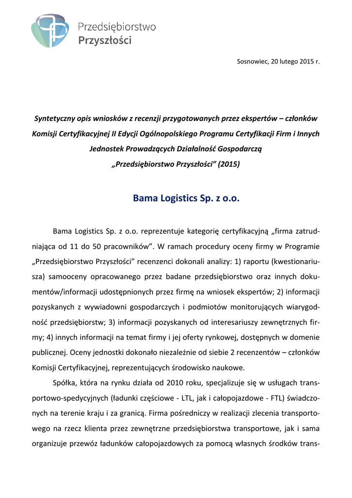 Sosnowiec, 20 lutego 2015 r. Syntetyczny opis wniosków z recenzji przygotowanych przez ekspertów – członków Komisji Certyfikacyjnej II Edycji Ogólnopolskiego Programu Certyfikacji Firm i Innych Jednostek Prowadzących Działalność Gospodarczą „Przedsiębiorstwo Przyszłości” (2015) Bama Logistics Sp. z o.o. Bama Logistics Sp. z o.o. reprezentuje kategorię certyfikacyjną „firma zatrudniająca od 11 do 50 pracowników”. W ramach procedury oceny firmy w Programie „Przedsiębiorstwo Przyszłości” recenzenci dokonali analizy: 1) raportu (kwestionariusza) samooceny opracowanego przez badane przedsiębiorstwo oraz innych dokumentów/informacji udostępnionych przez firmę na wniosek ekspertów; 2) informacji pozyskanych z wywiadowni gospodarczych i podmiotów monitorujących wiarygodność przedsiębiorstw; 3) informacji pozyskanych od interesariuszy zewnętrznych firmy; 4) innych informacji na temat firmy i jej oferty rynkowej, dostępnych w domenie publicznej. Oceny jednostki dokonało niezależnie od siebie 2 recenzentów – członków Komisji Certyfikacyjnej, reprezentujących środowisko naukowe. Spółka, która na rynku działa od 2010 roku, specjalizuje się w usługach transportowo-spedycyjnych (ładunki częściowe - LTL, jak i całopojazdowe - FTL) świadczonych na terenie kraju i za granicą. Firma pośredniczy w realizacji zlecenia transportowego na rzecz klienta przez zewnętrzne przedsiębiorstwa transportowe, jak i sama organizuje przewóz ładunków całopojazdowych za pomocą własnych środków trans- portu. Swój usługi świadczy w większości przypadków na terenie Europy Zachodniej (Niemcy, Francja, Hiszpania, kraje Beneluksu) przewożąc dla klientów szeroką gamę prefabrykatów, surowców wtórnych oraz produktów gotowych (dzięki realizacji ekspansywnego modelu biznesowego możliwe było rozszerzenie działalności na rynkach: francuskim, niemieckim i hiszpańskim, co zaowocowało współpracą z dużymi korporacjami międzynarodowymi). Firma dysponuje nowoczesnym taborem oraz magazynem logistycznym. Misja Bama Logistics Sp. z o.o. została zdefiniowana jako budowanie bliskich, trwałych relacji z klientami, służące dostarczaniu im najwyższej jakości usługi w każdym miejscu. Firma zapewnia wysoką jakość oferowanych usług oraz gwarantuje staranność realizacji zleceń poprzez niezawodność, a także profesjonalizm działania. Zdaniem Komisji spółka konsekwentnie i efektywnie buduje swoją przewagę konkurencyjną na niełatwym rynku transportowo-spedycyjnym, wykorzystując w tym celu zasoby niematerialne, takie jak wiedza, doświadczenie i wysokie kwalifikacje pracowników, a także elastycznie reaguje na zmienne warunki otoczenia, dostosowując się do czynników zewnętrznych, zgodnie z potrzebami rynku. Wdrożenie nowoczesnego modelu zarządzania pozwoliło na zbudowanie firmy opartej na elastycznym systemie organizacyjnym, który posiada pełną zdolność do inicjowania i dokonywania zmian dostosowawczych do nowych warunków realizowania celów biznesowych, tak w relacjach z klientami, jak i kontrahentami czy interesariuszami wewnętrznymi. Wysoki poziom elastyczności struktur organizacyjnych pozwolił firmie uzyskać modelowy stopień podatności na zmiany dostosowawcze. Cechy adaptacyjne spółki stanowią jej najważniejszy kapitał i źródło przewagi rynkowej. Jednocześnie owa elastyczność jako immanentna właściwość spółki w jej obecnym modelu biznesowym została wypracowana dzięki korzystaniu przez zarząd z szerokiego instrumentarium zarządzania wiedzą – konieczność zmian w firmie i ich kierunki zdefiniowano wskutek pozyskania nowej wiedzy dla organizacji. Firma, na przestrzeni czterech lat swojej działalności, potwierdziła wysoką jakość usług, zapewnianą dzięki wdrożeniu spójnego, wieloelementowego systemu zarządzania jakością oraz nowoczesnego systemu zarządzania relacjami zewnętrznymi. Dowodem na to są certyfikaty jakości, które udało się uzyskać Bama Logistics Sp. z o.o.: ISO 9001:2009, ISO 14001:2005, Certyfikat Wiarygodności Biznesowej 2012 oraz Certyfikat Bezpieczeństwa Należności wydany przez Rejestr Dłużników ERIF. Polityka marketingowa spółki jest przemyślana, zorientowana na kreowanie wysokiej wartości dla klienta, zgodna z paradygmatami najnowszych koncepcji marketingowych, skutkująca systematycznym umacnianie wizerunku firmy jako podmiotu godnego zaufania. Bama Logistics Sp. z o.o. to solidny pracodawca implementujący w praktyce menedżerskiej najnowocześniejsze rozwiązania w zakresie zarządzania zasobami ludzkimi. Realizowana w spółce strategia HR stanowi przykład strategii holistycznej (obejmującej całokształt działań w obszarze polityki personalnej), innowacyjnej (wykorzystującej autorskie narzędzia zaprojektowane specjalnie na potrzeby firmy), dynamicznej (posiadającej pełną zdolności adaptacji do bieżących potrzeb) oraz kreacyjnej (wyznaczającej pożądane trendy w przyszłości). Firma zbudowała zespół oparty na najwyższej klasy specjalistach branży spedycyjnej, który zapewnił jej dynamiczny rozwój oraz umożliwił - w krótkim czasie - realizację celów biznesowych we wszystkich segmentach działalności transportowej. Przykład Bama Logistics Sp. z o.o. udowadnia, że właściwie zaprojektowana i wdrażana wedle najwyższych europejskich standardów polityka HR może być źródłem zaskakujących wręcz sukcesów rynkowych. Recenzenci wskazują m.in., że wszyscy pracownicy firmy mają podpisane umowy o pracę na czas nieokreślony, w spółce obowiązuje klarowny system wynagrodzeń, przedsiębiorstwo stosuje zdywersyfikowane instrumentarium motywacyjne etc. Przeprowadzona w 2014 roku kontrola Państwowej Inspekcji Pracy nie wykazała żadnych uchybień w kwestii i wypłaty należności oraz obowiązkowych składek ubezpieczeniowych. Mając świadomość wagi ciągłego podnoszenia jakości usług, wynikające