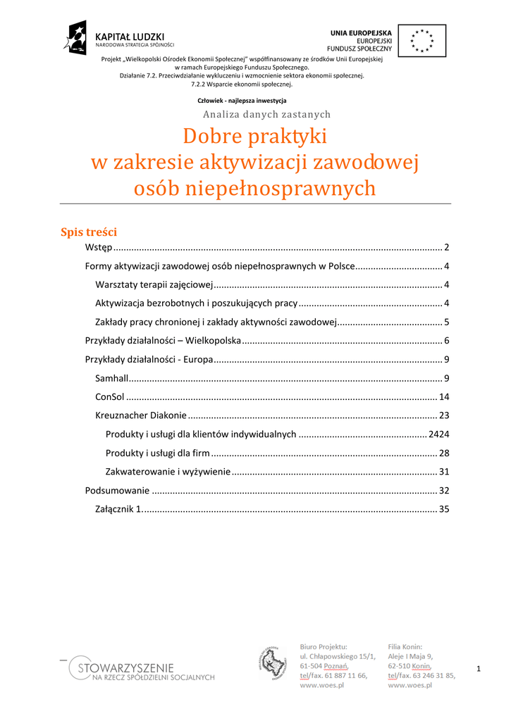 Projekt „Wielkopolski Ośrodek Ekonomii Społecznej” współfinansowany ze środków Unii Europejskiej w ramach Europejskiego Funduszu Społecznego. Działanie 7.2. Przeciwdziałanie wykluczeniu i wzmocnienie sektora ekonomii społecznej. 7.2.2 Wsparcie ekonomii społecznej. Człowiek - najlepsza inwestycja Analiza danych zastanych Dobre praktyki w zakresie aktywizacji zawodowej osób niepełnosprawnych Spis treści Wstęp ................................................................................................................................ 2 Formy aktywizacji zawodowej osób niepełnosprawnych w Polsce.................................. 4 Warsztaty terapii zajęciowej ......................................................................................... 4 Aktywizacja bezrobotnych i poszukujących pracy ........................................................ 4 Zakłady pracy chronionej i zakłady aktywności zawodowej......................................... 5 Przykłady działalności – Wielkopolska .............................................................................. 6 Przykłady działalności - Europa ......................................................................................... 9 Samhall .......................................................................................................................... 9 ConSol ......................................................................................................................... 14 Kreuznacher Diakonie ................................................................................................. 23 Produkty i usługi dla klientów indywidualnych .................................................. 2424 Produkty i usługi dla firm ........................................................................................ 28 Zakwaterowanie i wyżywienie ................................................................................ 31 Podsumowanie ............................................................................................................... 32 Załącznik 1. .................................................................................................................. 35 1 Projekt „Wielkopolski Ośrodek Ekonomii Społecznej” współfinansowany ze środków Unii Europejskiej w ramach Europejskiego Funduszu Społecznego. Działanie 7.2. Przeciwdziałanie wykluczeniu i wzmocnienie sektora ekonomii społecznej. 7.2.2 Wsparcie ekonomii społecznej. Człowiek - najlepsza inwestycja Wielką uwagę należy zwrócić, podobnie jak w przypadku innych pracowników, na fizyczne i psychologiczne warunki pracy osób upośledzonych, na sprawiedliwe wynagrodzenie, na możliwość awansu i na usuwanie różnego rodzaju przeszkód. Nie ukrywając, że chodzi tu o zadanie złożone i trudne, należałoby sobie jednak życzyć, aby właściwe pojmowanie pracy w znaczeniu podmiotowym prowadziło do takiej sytuacji, w której osoba upośledzona nie czułaby się pozostawiona na marginesie świata pracy lub uzależniona od społeczeństwa, lecz mogła egzystować jako pełnoprawny podmiot pracy, pożyteczny i szanowany ze względu na swą ludzką godność, powołany do wnoszenia wkładu w rozwój i dobro własnej rodziny i społeczeństwa, zgodnie ze swymi możliwościami. Jan Paweł II Encyklika „Laborem exercens” Wstęp Wyrównywanie szans oraz pełna integracja ze społeczeństwem stanowią cele polityki społecznej prowadzonej na rzecz osób niepełnosprawnych. Sposobem na osiągnięcie wskazanych dążeń jest rehabilitacja tych osób czyli zorganizowany system działania, którego celem jest przywrócenie osobom niepełnosprawnym możliwie pełnej sprawności w sensie fizycznym, psychicznym, społecznym i zawodowym. Przedsiębiorstwami tworzonymi w celu zatrudniania osób z niepełnosprawnościami w celu dostarczania produktów i usług, na które jest popyt są tzw. spółdzielnie socjalne1. Pierwsze tego typu podmioty zostały utworzone w latach 70-tych XX wieku we Włoszech 2 dla osób z niepełnosprawnościami natury psychiatrycznej. Pracownikami byli pacjenci szpitala w Trieście (północno-wschodnie Włochy) zatrudnieni do sprzątania budynków administracji publicznej. W przeciągu lat 1973-1985 spółdzielnia zatrudniała 130 pracowników. W 1994 roku dochody wszystkich powstałych tam spółdzielni wzrosły do 5 milionów dolarów amerykańskich. Podmioty te zajmowały się wówczas nie tylko sprzątaniem, ale także prowadziły hotele, kawiarnie i restauracje, firmę transportową i remontowo-budowlaną 3. W 1 W literaturze zagranicznej pojawiają się określenia: „social firms” lub „affirmative businesses” oraz „worker cooperative”, „social enterprise”. W tym opracowaniu będziemy wymiennie używać określeń takich jak: spółdzielnie socjalne, przedsiębiorstwa społeczne, firmy socjalne, spółdzielnie pracownicze. Nie chodzi bowiem o określanie ich sytuacji własnościowej, a jedynie o przedstawienie funkcjonujących podmiotów gospodarczych i branż w jakich działają. Każde z tego typu przedsiębiorstw zostało powołane w celu wspierania rehabilitacji osób niepełnosprawnych i w tym artykule jest to podstawowym kryterium wyróżniania tych podmiotów. 2 Richard Warner, James Mandiberg, An Update on Affirmative Businesses or Social Firms for People With Mental Illness, „Psychiatric Services”, Vol. 57, No. 10, 2006, s. 1488. 3 Ibidem. 2 Projekt „Wielkopolski Ośrodek Ekonomii Społecznej” współfinansowany ze środków Unii Europejskiej w ramach Europejskiego Funduszu Społecznego. Działanie 7.2. Przeciwdziałanie wykluczeniu i wzmocnienie sektora ekonomii społecznej. 7.2.2 Wsparcie ekonomii społecznej. Człowiek - najlepsza inwestycja 2004 roku roczny dochód spółdzielni socjalnych działających w Trieście sięgnął 14 milionów dolarów. Niektóre podmioty zostały powołane przez organizacje pozarządowe. Ostatecznie wsz