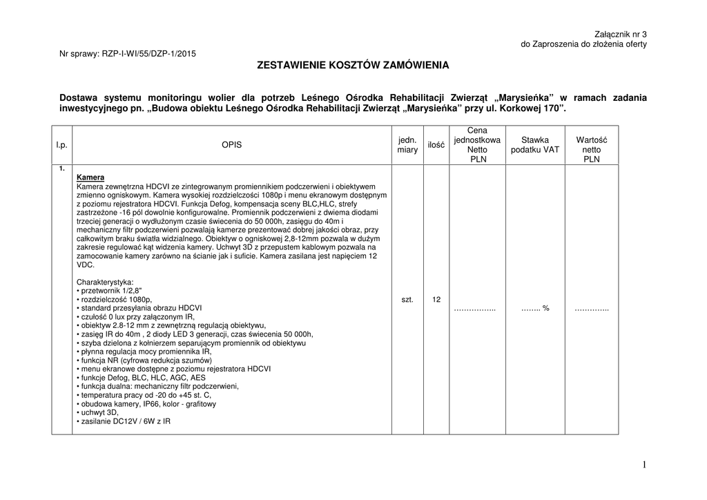 Załącznik nr 3 do Zaproszenia do złożenia oferty Nr sprawy: RZP-I-WI/55/DZP-1/2015 ZESTAWIENIE KOSZTÓW ZAMÓWIENIA Dostawa systemu monitoringu wolier dla potrzeb Leśnego Ośrodka Rehabilitacji Zwierząt „Marysieńka” w ramach zadania inwestycyjnego pn. „Budowa obiektu Leśnego Ośrodka Rehabilitacji Zwierząt „Marysieńka” przy ul. Korkowej 170”. l.p. OPIS jedn. miary ilość szt. 12 Cena jednostkowa Netto PLN Stawka podatku VAT Wartość netto PLN …….. % ………….. 1. Kamera Kamera zewnętrzna HDCVI ze zintegrowanym promiennikiem podczerwieni i obiektywem zmienno ogniskowym. Kamera wysokiej rozdzielczości 1080p i menu ekranowym dostępnym z poziomu rejestratora HDCVI. Funkcja Defog, kompensacja sceny BLC,HLC, strefy zastrzeżone -16 pól dowolnie konfigurowalne. Promiennik podczerwieni z dwiema diodami trzeciej generacji o wydłużonym czasie świecenia do 50 000h, zasięgu do 40m i mechaniczny filtr podczerwieni pozwalają kamerze prezentować dobrej jakości obraz, przy całkowitym braku światła widzialnego. Obiektyw o ogniskowej 2,8-12mm pozwala w dużym zakresie regulować kąt widzenia kamery. Uchwyt 3D z przepustem kablowym pozwala na zamocowanie kamery zarówno na ścianie jak i suficie. Kamera zasilana jest napięciem 12 VDC. Charakterystyka: • przetwornik 1/2,8" • rozdzielczość 1080p, • standard przesyłania obrazu HDCVI • czułość 0 lux przy załączonym IR, • obiektyw 2.8-12 mm z zewnętrzną regulacją obiektywu, • zasięg IR do 40m , 2 diody LED 3 generacji, czas świecenia 50 000h, • szyba dzielona z kołnierzem separującym promiennik od obiektywu • płynna regulacja mocy promiennika IR, • funkcja NR (cyfrowa redukcja szumów) • menu ekranowe dostępne z poziomu rejestratora HDCVI • funkcje Defog, BLC, HLC, AGC, AES • funkcja dualna: mechaniczny filtr podczerwieni, • temperatura pracy od -20 do +45 st. C, • obudowa kamery, IP66, kolor - grafitowy • uchwyt 3D, • zasilanie DC12V / 6W z IR …………….. 1 Załącznik nr 3 do Zaproszenia do złożenia oferty Nr sprawy: RZP-I-WI/55/DZP-1/2015 2. Rejestrator • Rejestrator HDCVI/ANALOG z opcją trybrydy IP - 16 kanałów (max. 2x IP@1080P), • funkcjonalność - pentaplex, • kompresja - H.264, • zapis:o Analog 16ch 960H: max. 400kl/s lub zamiennie do 2 kanałów IP 1080Po lub HDCVI (720P) 16ch: max. 400kl/s lub zamiennie do 2 kanałów IP 1080Po lub HDCVI (1080P) 16ch: max. 200kl/s lub zamiennie do 2 kanałów IP 1080P • porty USB - 2, • max. 1 dysk twardy o pojemności do 4TB, • audio:o wejścia: 4o wyjścia: 1o dwukierunkowy tor audio - tak, • wejścia alarmowe - 16, • wyjścia przekaźnikowe - 3, • wyjścia video - VGA, HDMI, • RS-485 - tak, sterowanie PTZ – tak • max. rozdzielczość wyświetlanego obrazu - 1920×1080 • obsługa poprzez - IPHONE, ANDROID • obsługa przez sieć - przeglądarka IE, FIREFOX, program Smart PSS, DMSS, • sieć RJ-45 - 1, • zasilanie - DC12V/2A, • wymiary - mini 1U (325×255×55), szt. 1 ……………. …….. % ……………. ………….. ……… % …………… 3. Konwerter do przesyłu sygnału wideo wysokiej rozdzielczości Sygnał transmisji 1 kanał Zasięg transmisji 720P: 400M (max)1080P: 250M (max)Typ kabla UTP CAT 5E/6 (R<10Ω/100M) Transmisja wideo i porty:Złącze Coaxial Video BNC-MTwisted-pair Video Connector Pushterminal Kompatybilny Format HDCVI Rozdzielczość 720P/1080PZwlaczanie zakłóceń >60dbOchrona:ESD 1a contact discharge electricity level 31b air discharge electricity level 3Per:IEC61000-4-2 Coaxial Cable Connector 2KV(common-code) Per:IEC61000-4-5UTP Cable Connector 2KV(different-code),4KV(common-code),Per:IEC61000-4-5Impedancja:BNC Męski 75 ohmUTP Kabel 100 ohm Właściwości fizyczne Wymiary 53x20x17mmObudowa ABSKolor Czarny Wytrzymałość:MTBF >10000HŚrodowisko pracy Temperatura pracy -10~55°CTemperatura przechowywania -20~70°C Wilgotność 0~95% (bez kondensacji) kpl. 12 2 Załącznik nr 3 do Zaproszenia do złożenia oferty Nr sprawy: RZP-I-WI/55/DZP-1/2015 4. Zasilacz 16 kanałowy 12V/8A/16X0.5A • 16 wyjść zabezpieczonych niezależnie bezpiecznikami F 500mA lub PTC 500mA • optyczna sygnalizacja pracy informująca o stanie: wyjść i/lub awarii • wyjścia techniczne AW (x2) informujące o awarii wyjścia (zadziałanie SCP), służące do zdalnej kontroli pracy • zabezpieczenia: przeciwzwarciowe (SCP), przeciążeniowe (OLP), nadnapięciowe (OVP). • regulacja napięcia wyjściowego: P1 (12,0V÷15,0V DC) • metalowa obudowa (kolor RAL 9003) z panelem sygnalizacyjnym 5. Monitor LED 21,5'' IPS-ADS, FUL-HD, 14 ms, DVI-D, VGA, HDMI szt. 1 ……………. ……… % …………… kpl. 1 …………….. …..…. % …………… Razem netto …………………………… Kwota podatku VAT ………………………….. Razem brutto ………………………….. Miejsce i data _______________________________________________________________________________________________________________________________________ (podpis/y osoby lub osób uprawnionych do reprezentowania Wykonawcy/podmiotu* na podstawie odpisu z właściwego rejestru lub ewidencji albo pełnomocnictwa) 3