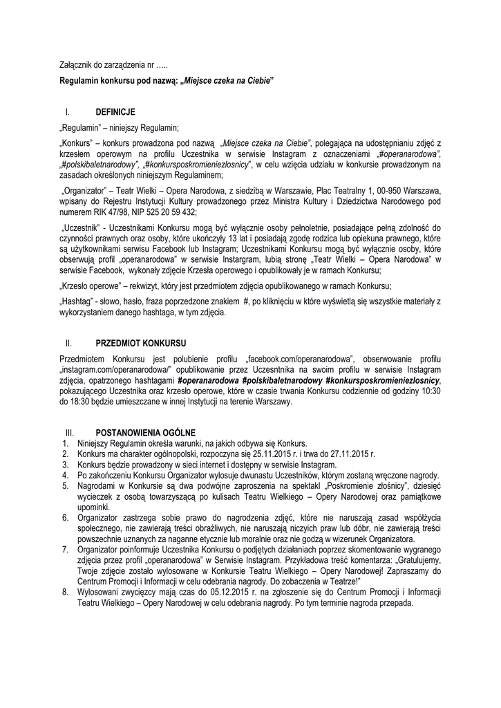 Załącznik do zarządzenia nr ….. Regulamin konkursu pod nazwą: „Miejsce czeka na Ciebie” I. DEFINICJE „Regulamin” – niniejszy Regulamin; „Konkurs” – konkurs prowadzona pod nazwą „Miejsce czeka na Ciebie”, polegająca na udostępnianiu zdjęć z krzesłem operowym na profilu Uczestnika w serwisie Instagram z oznaczeniami „#operanarodowa”, „#polskibaletnarodowy”, „#konkursposkromieniezlosnicy”, w celu wzięcia udziału w konkursie prowadzonym na zasadach określonych niniejszym Regulaminem; „Organizator” – Teatr Wielki – Opera Narodowa, z siedzibą w Warszawie, Plac Teatralny 1, 00-950 Warszawa, wpisany do Rejestru Instytucji Kultury prowadzonego przez Ministra Kultury i Dziedzictwa Narodowego pod numerem RIK 47/98, NIP 525 20 59 432; „Uczestnik” - Uczestnikami Konkursu mogą być wyłącznie osoby pełnoletnie, posiadające pełną zdolność do czynności prawnych oraz osoby, które ukończyły 13 lat i posiadają zgodę rodzica lub opiekuna prawnego, które są użytkownikami serwisu Facebook lub Instagram; Uczestnikami Konkursu mogą być wyłącznie osoby, które obserwują profil „operanarodowa” w serwisie Instargram, lubią stronę „Teatr Wielki – Opera Narodowa” w serwisie Facebook, wykonały zdjęcie Krzesła operowego i opublikowały je w ramach Konkursu; „Krzesło operowe” – rekwizyt, który jest przedmiotem zdjęcia opublikowanego w ramach Konkursu; „Hashtag” - słowo, hasło, fraza poprzedzone znakiem #, po kliknięciu w które wyświetlą się wszystkie materiały z wykorzystaniem danego hashtaga, w tym zdjęcia. II. PRZEDMIOT KONKURSU Przedmiotem Konkursu jest polubienie profilu „facebook.com/operanarodowa”, obserwowanie profilu „instagram.com/operanarodowa/” opublikowanie przez Uczesntnika na swoim profilu w serwisie Instagram zdjęcia, opatrzonego hashtagami #operanarodowa #polskibaletnarodowy #konkursposkromieniezlosnicy, pokazującego Uczestnika oraz krzesło operowe, które w czasie trwania Konkursu codziennie od godziny 10:30 do 18:30 będzie umieszczane w innej Instytucji na terenie Warszawy. III. 1. 2. 3. 4. 5. POSTANOWIENIA OGÓLNE Niniejszy Regulamin określa warunki, na jakich odbywa się Konkurs. Konkurs ma charakter ogólnopolski, rozpoczyna się 25.11.2015 r. i trwa do 27.11.2015 r. Konkurs będzie prowadzony w sieci internet i dostępny w serwisie Instagram. Po zakończeniu Konkursu Organizator wylosuje dwunastu Uczestników, którym zostaną wręczone nagrody. Nagrodami w Konkursie są dwa podwójne zaproszenia na spektakl „Poskromienie złośnicy”, dziesięć wycieczek z osobą towarzyszącą po kulisach Teatru Wielkiego – Opery Narodowej oraz pamiątkowe upominki. 6. Organizator zastrzega sobie prawo do nagrodzenia zdjęć, które nie naruszają zasad współżycia społecznego, nie zawierają treści obraźliwych, nie naruszają niczyich praw lub dóbr, nie zawierają treści powszechnie uznanych za naganne etycznie lub moralnie oraz nie godzą w wizerunek Organizatora. 7. Organizator poinformuje Uczestnika Konkursu o podjętych działaniach poprzez skomentowanie wygranego zdjęcia przez profil „operanarodowa” w Serwisie Instagram. Przykładowa treść komentarza: „Gratulujemy, Twoje zdjęcie zostało wylosowane w Konkursie Teatru Wielkiego – Opery Narodowej! Zapraszamy do Centrum Promocji i Informacji w celu odebrania nagrody. Do zobaczenia w Teatrze!” 8. Wylosowani zwycięzcy mają czas do 05.12.2015 r. na zgłoszenie się do Centrum Promocji i Informacji Teatru Wielkiego – Opery Narodowej w celu odebrania nagrody. Po tym terminie nagroda przepada. IV. WARUNKI I ZASADY UDZIAŁU W KONKURSIE 1. Uczestnik zobowiązuje się do zapoznania się z treścią Regulaminu przed przystąpieniem do Konkursu. 2. Uczestnik przystępuje do Konkursu przez udostępnienie zdjęcia. 3. Udostępnienie zdjęcia jest jednoznaczne z zaakceptowaniem Regulaminu. 4. Przystępując do Konkursu, Uczestnik wyraża zgodę na warunki Konkursu określone w Regulaminie oraz oświadcza, że spełnia warunki uczestnictwa w Konkursie i zobowiązuje się do przestrzegania warunków Regulaminu. 5. Uczestnikami Konkursu mogą być wyłącznie osoby pełnoletnie, posiadające pełną zdolność do czynności prawnych oraz osoby, które ukończyły 13 lat i posiadają zgodę rodzica lub opiekuna prawnego, które są użytkownikami serwisu Instagram. 6. Uczestnictwo w Konkursie ma charakter dobrowolny i nieodpłatny. 7. Uczestnik może wziąć udział w Konkursie dowolną ilość razy podczas trwania całego Konkursu, co oznacza, że Uczestnik może opublikować więcej niż jedno zdjęcie. 8. Aby móc wziąć udział w Konkursie należy posiadać aktywne, publiczne konto w serwisie Instagram.com i udostępnić na swoim koncie zdjęcie razem z hashtagami #operanarodowa #polskibaletnarodowy #konkursposkromieniezlosnicy. Osobą udostępniająca zdjęcie w ramach Konkursu może być wyłącznie osoba, która zdjęcie wykonała. V. ZGODA NA KORZYSTANIE ZE ZDJĘCIA I PRAWA AUTORSKIE 1. Uczestnik oświadcza, że jest dysponentem praw autorskich do zdjęcia udostępnionego zgodnie z Regulaminem. Udostępniając zdjęcie zgodnie z Regulaminem, Uczestnik wyraża zgodę, nieodpłatnie, na korzystanie ze zdjęcia przez Teatr w celu wyłonienia zwycięzcy i w zakresie i na warunkach określonych w Regulaminie. 2. Uczestnik oświadcza, że ponosi pełną i nieograniczoną odpowiedzialność w przypadku, gdyby zdjęcie naruszyło prawa lub dobra osób trzecich i zwalnia w tym zakresie od odpowiedzialności Teatr. 3. Regulamin wchodzi w życie z dniem wejścia w życie właściwego rozporządzenia Dyrektora Teatru Wielkiego Opery Narodowej.