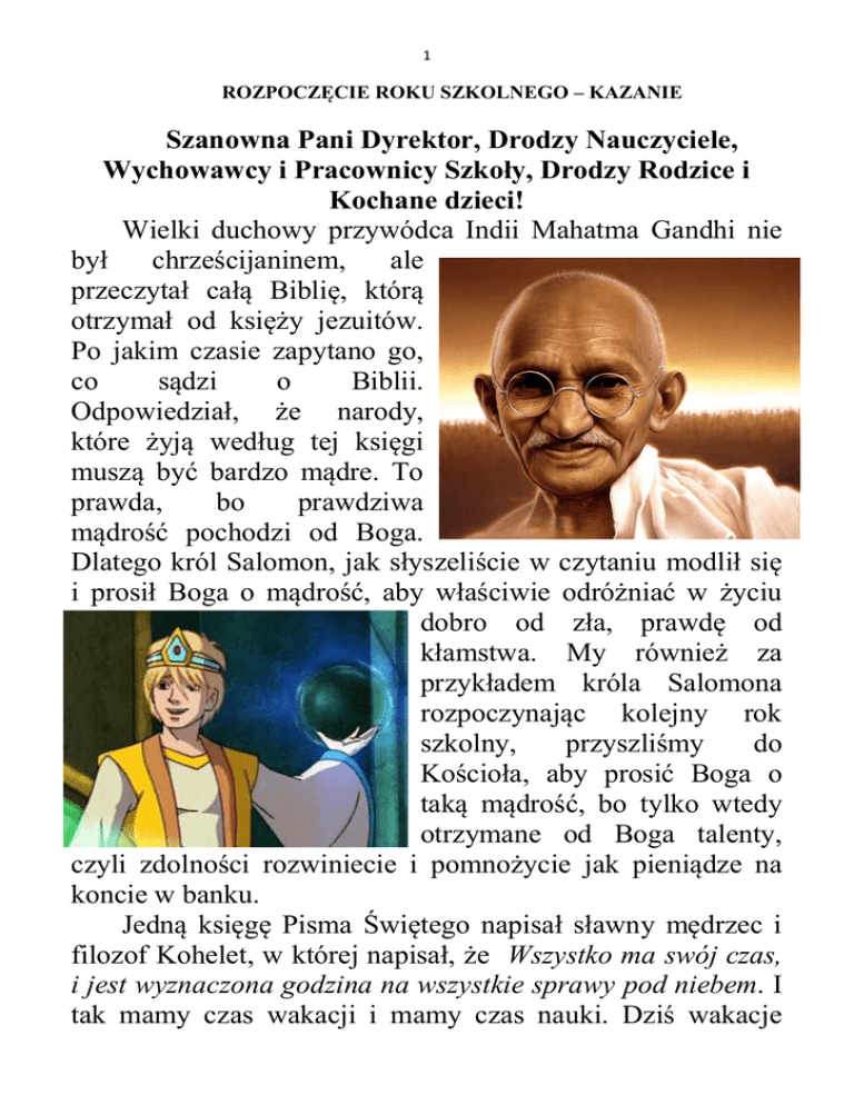 1 ROZPOCZĘCIE ROKU SZKOLNEGO – KAZANIE Szanowna Pani Dyrektor, Drodzy Nauczyciele, Wychowawcy i Pracownicy Szkoły, Drodzy Rodzice i Kochane dzieci! Wielki duchowy przywódca Indii Mahatma Gandhi nie był chrześcijaninem, ale przeczytał całą Biblię, którą otrzymał od księży jezuitów. Po jakim czasie zapytano go, co sądzi o Biblii. Odpowiedział, że narody, które żyją według tej księgi muszą być bardzo mądre. To prawda, bo prawdziwa mądrość pochodzi od Boga. Dlatego król Salomon, jak słyszeliście w czytaniu modlił się i prosił Boga o mądrość, aby właściwie odróżniać w życiu dobro od zła, prawdę od kłamstwa. My również za przykładem króla Salomona rozpoczynając kolejny rok szkolny, przyszliśmy do Kościoła, aby prosić Boga o taką mądrość, bo tylko wtedy otrzymane od Boga talenty, czyli zdolności rozwiniecie i pomnożycie jak pieniądze na koncie w banku. Jedną księgę Pisma Świętego napisał sławny mędrzec i filozof Kohelet, w której napisał, że Wszystko ma swój czas, i jest wyznaczona godzina na wszystkie sprawy pod niebem. I tak mamy czas wakacji i mamy czas nauki. Dziś wakacje 2 ustępują miejsca nauce. Rozpoczynamy nowy rok szkolny, czas nauki, czyli pracy. I tutaj jako nauczyciel – katecheta chcę wam dać dobrą radę. Dobre rady zawsze są w cenie. Wczoraj oglądałem mecz koszykówki Polska – Portugalia w ramach eliminacji do Mistrzostw Europy. Polacy wygrali 83 do 57. Prawie trzydziestoma punktami. Grali dobrze, ale w drugiej kwarcie mieli kryzys i Portugalia odrobiła straty. W czasie przerwy trener głośno dawał im różne rady, coś tam rysował i zaznaczał strzałkami podania i rzuty. Zawodnicy go posłuchali, no i pięknie wygrali. Dlatego na początku roku szkolnego i ja chcę wam dać pewne dobre rady. Jestem pewien, że gdy się do nich zastosujecie, to wygracie świadectwo z paskiem i wzorowe zachowanie. Te dobre rady pochodzą od papieża Franciszka, które jako pasterz całego Kościoła dawał młodzieży z całego świata w Krakowie tego roku w lipcu. Żeby te rady jakoś wam się zakodowały w głowie, przygotowałem pewne rekwizyty. Chodzi o to co papież Franciszek powiedział o kanapie i butach. A mianowicie papież powiedział, że u wielu ludzi młodych można zauważyć taki kanapowy styl życia, którego cechą jest totalne lenistwo, takie, jak mówią Włosi „dolce far 3 niente”, czyli słodkie nic nie robienie. Dobrze taki kanapowy styl oddaje znany wiersz „na tapczanie siedzi leń, nic nie robi cały dzień”. Jednak taki styl szkodzi człowiekowi. Jak mówi papież paraliżuje człowieka, człowiek staje się ogłupiały, zamknięty w sobie i otumaniony. Na tej kanapie są pewne gadżety, które nas ogłupiają: komórka, tablet, chipsy, pilot. One przenoszą nas w świat gier i zabierają czas, który powinniśmy poświęcić na rozwijanie talentów czyli Nowy rok szkolny, który dzisiaj rozpoczynamy to dobry czas aby pożegnać się z kanapą, która jest symbolem lenistwa i nudy, a założyć buty wyczynowe, które są symbolem aktywności, działania i otwartego serca. Buty nam mówią, że trzeba działać, bo szkoda czasu. Kardynał Bertram, słynny arcybiskup Wrocławia w swoim pamiętniku opisał ciekawe zdarzenie. Kiedyś otrzymał list od 12-letniego chłopca, który prosił go o autograf. Zbierał bowiem autografy wielkich i sławnych ludzi. W pierwszym odruchu kardynał wrzucił list do kosza sądząc, że nie warto tracić czasu na takie głupstwa. Po jakimś czasie wyjął jednak list z 4 kosza, zaadresował nową kopertę i włożył do niej obok swego podpisu krótkie zdanie: „Nigdy nie wróci stracony czas”. Po 12 latach otrzymał ponownie list od tego samego chłopca, który w międzyczasie stał się młodzieńcem, studentem prawa, i adwokatem. Teraz jako młody prawnik zaprasza kardynała na obronę pracy magisterskiej z uzasadnieniem, że dzięki temu jednemu zdaniu otrzymanemu przed dwunastu laty stał się innym człowiekiem. Porzucił swoje nałogowe lenistwo, próżność, bezczynność, zabrał się solidnie do nauki, poszedł na studia oto teraz jak król Salomon będzie rozstrzygać sprawy sądowe. Druga dobra rada na początek roku szkolnego związana jest z rekwizytami, które przywiozłem z urlopu. Na Dolinie Chochołowskiej przez godzinę obserwowałem pasące się stado gdzieś około trzystu owiec. I zauważyłem, że pilnowanie i pasienie owiec to wcale nie taka prosta sprawa. Musi być mądry pasterz, czyli baca. Jak stado jest duże to ma pomocników, czyli juhasów. Jest też piesek tzw. owczarek. No i niektóre większe i mądrzejsze owce mają zawieszone u szyi takie specjalne dzwonki. Jeśli jest mądry baca, a owce idą za 5 dźwiękiem dzwonków, wtedy całe stado jest bezpieczne, owce są szczęśliwe i najedzone, a my możemy zajadać pyszne oscypki. Ja bym szkołę porównał do takiego stada owiec. W szkole też jest taki baca, czyli Pani Dyrektor, są juhasi, czyli nauczyciele i wychowawcy, są i owczarki, czyli Panie woźne, a przewodniczący klasy, to jest taka większa i mądrzejsza owieczka z dzwonkiem. Dodam jeszcze, że kiedy będziecie słuchać szkolnego bacy i juhasów, patrzeć na najlepszych z klasy, w myśl powiedzenia, że kto z kim przystaje takim się staje, to odniesiecie w szkole same sukcesy i nic złego nikomu się nie stanie. Dodam jeszcze, że naszym Dobrym Pasterze jest Jezus. On tu ciągle czeka na was. Trzeba się z Nim często łączyć przez modlitwę i Komunię, bo On chce być waszą siłą do nauki i pracy nad swoim charakterem. Dlatego będę was często zachęcał do nabożeństw różańcowych, na roraty, rekolekcje, majówki. Nie puszczajcie tych zachęt mimo uszu. Ja zauważyłem, że jak ktoś jest aktywny w Kościele, ten też jest aktywny w szkole, jest dobrym i życzliwym uczniem. Ci co unikają Kościoła jak diabeł święconej wody, to znaczy, że wybrali kanapę. Całymi godzinami 