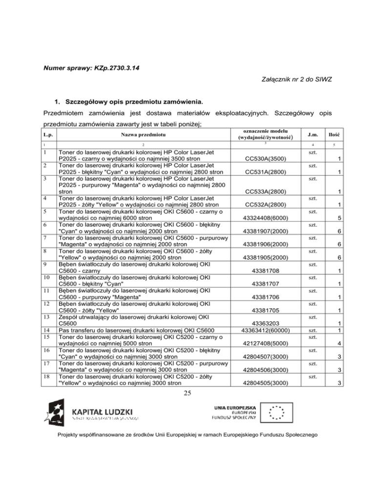 Numer sprawy: KZp.2730.3.14 Załącznik nr 2 do SIWZ 1. Szczegółowy opis przedmiotu zamówienia. Przedmiotem zamówienia jest dostawa materiałów eksploatacyjnych. Szczegółowy opis przedmiotu zamówienia zawarty jest w tabeli poniżej; L.p. oznaczenie modelu (wydajność/żywotność) Nazwa przedmiotu 3 1 2 1 Toner do laserowej drukarki kolorowej HP Color LaserJet P2025 - czarny o wydajności co najmniej 3500 stron Toner do laserowej drukarki kolorowej HP Color LaserJet P2025 - błękitny "Cyan" o wydajności co najmniej 2800 stron Toner do laserowej drukarki kolorowej HP Color LaserJet P2025 - purpurowy "Magenta" o wydajności co najmniej 2800 stron Toner do laserowej drukarki kolorowej HP Color LaserJet P2025 - żółty "Yellow" o wydajności co najmniej 2800 stron Toner do laserowej drukarki kolorowej OKI C5600 - czarny o wydajności co najmniej 6000 stron Toner do laserowej drukarki kolorowej OKI C5600 - błękitny "Cyan" o wydajności co najmniej 2000 stron Toner do laserowej drukarki kolorowej OKI C5600 - purpurowy "Magenta" o wydajności co najmniej 2000 stron Toner do laserowej drukarki kolorowej OKI C5600 - żółty "Yellow" o wydajności co najmniej 2000 stron Bęben światłoczuły do laserowej drukarki kolorowej OKI C5600 - czarny Bęben światłoczuły do laserowej drukarki kolorowej OKI C5600 - błękitny "Cyan" Bęben światłoczuły do laserowej drukarki kolorowej OKI C5600 - purpurowy "Magenta" Bęben światłoczuły do laserowej drukarki kolorowej OKI C5600 - żółty "Yellow" Zespół utrwalający do laserowej drukarki kolorowej OKI C5600 Pas transferu do laserowej drukarki kolorowej OKI C5600 Toner do laserowej drukarki kolorowej OKI C5200 - czarny o wydajności co najmniej 5000 stron Toner do laserowej drukarki kolorowej OKI C5200 - błękitny "Cyan" o wydajności co najmniej 3000 stron Toner do laserowej drukarki kolorowej OKI C5200 - purpurowy "Magenta" o wydajności co najmniej 3000 stron Toner do laserowej drukarki kolorowej OKI C5200 - żółty "Yellow" o wydajności co najmniej 3000 stron 2 3 4 5 6 7 8 9 10 11 12 13 14 15 16 17 18 J.m. Ilość 4 5 szt. CC530A(3500) 1 szt. CC531A(2800) 1 szt. CC533A(2800) 1 szt. CC532A(2800) 1 szt. 43324408(6000) 5 szt. 43381907(2000) 6 szt. 43381906(2000) 6 szt. 43381905(2000) 6 szt. 43381708 1 szt. 43381707 1 szt. 43381706 1 szt. 43381705 1 szt. 43363203 43363412(60000) szt. szt. 42127408(5000) 1 1 4 szt. 42804507(3000) 3 szt. 42804506(3000) 3 szt. 42804505(3000) 25 Projekty współfinansowane ze środków Unii Europejskiej w ramach Europejskiego Funduszu Społecznego 3 19 20 21 22 23 24 25 26 27 28 29 30 31 32 33 34 35 36 37 38 39 40 41 42 Bęben światłoczuły do laserowej drukarki kolorowej OKI C5200 - czarny Bęben światłoczuły do laserowej drukarki kolorowej OKI C5200 - błękitny "Cyan" Bęben światłoczuły do laserowej drukarki kolorowej OKI C5200 - purpurowy "Magenta" Bęben światłoczuły do laserowej drukarki kolorowej OKI C5200 - żółty "Yellow" Zespół utrwalający do laserowej drukarki kolorowej OKI C5200 Pas transferu do laserowej drukarki kolorowej OKI C5200 Toner do laserowej drukarki kolorowej OKI C610 - czarny o wydajności co najmniej 8000 stron Toner do laserowej drukarki kolorowej OKI C610 - błękitny "Cyan" o wydajności co najmniej 6000 stron Toner do laserowej drukarki kolorowej OKI C610 - purpurowy "Magenta" o wydajności co najmniej 6000 stron Toner do laserowej drukarki kolorowej OKI C610 - żółty "Yellow" o wydajności co najmniej 6000 stron Bęben światłoczuły do laserowej drukarki kolorowej OKI C610 - czarny Bęben światłoczuły do laserowej drukarki kolorowej OKI C610 - błękitny "Cyan" Bęben światłoczuły do laserowej drukarki kolorowej OKI C610 - purpurowy "Magenta" Bęben światłoczuły do laserowej drukarki kolorowej OKI C610 - żółty "Yellow" Zespół utrwalający do laserowej drukarki kolorowej OKI C610 Pas transferu do laserowej drukarki kolorowej OKI C610 Toner do laserowego kolorowego urządzenia wielofunkcyjnego Kyocera FS-2026MFP - czarny o wydajności co najmniej 7000 stron Toner do laserowego kolorowego urządzenia wielofunkcyjnego Kyocera FS-2026MFP - błękitny "Cyan" o wydajności co najmniej 5000 stron Toner do laserowego kolorowego urządzenia wielofunkcyjnego Kyocera FS-2026MFP - purpurowy "Magenta" o wydajności co najmniej 5000 stron Toner do laserowego kolorowego urządzenia wielofunkcyjnego Kyocera FS-2026MFP - żółty "Yellow" o wydajności co najmniej 5000 stron Toner do laserowej drukarki monochromatycznej HP LaserJet P2055 o wydajności co najmniej 6500 stron Toner do laserowej drukarki monochromatycznej HP LaserJet P1006 o wydajności co najmniej 1500 stron Toner do laserowej drukarki monochromatycznej HP LaserJet P2015, HP LaserJet 2727 NFS o wydajności co najmniej 7000 stron Toner do laserowej drukarki monochromatycznej HP LaserJet szt. 42126608 1 szt. 42126607 1 szt. 42126606 1 szt 42127405 1 szt 42625503 42158712 szt szt. 44315308(8000) 1 1 4 szt. 44315307(6000) 4 szt. 44315306(6000) 4 szt. 44315305(6000) 4 szt. 44315108(20000) 1 szt. 44315107(20000) 1 szt. 44315106(20000) 1 szt. 44315105(20000) 44289103(60000) 44341902(60000) szt. szt. szt. TK-590K(7000) 1 1 1 5 szt. TK-590C(5000) 5 szt. TK-590M(5000) 5 szt. TK-590Y(5000) 5 szt. CE505X(6500) 18 szt. 35A(1500) 4 szt. 53X(7000) 12A(2000) szt. 26 Projekty współfinansowane ze środków Unii Europejskiej w ramach Europejskiego Funduszu Społecznego 3 3 43 44 45 46 47 48 49 50 51 52 53 54 55 56 57 58 59 60 61 62 63 64 65 66 1018 o wydajności co najmniej 2000 stron Toner do laserowej drukarki monochromatycznej HP LaserJet 1320, HP LaserJet 3390 o wydajności co najmniej 6000 stron Toner do laserowej drukarki monochromatycznej HP LaserJet 2300 o wydajności co najmniej 6000 stron Toner do laserowej drukarki monochromatycznej HP LaserJet 2420 o wydajności co najmniej 12000 stron Toner do laserowej drukarki monochromatycznej HP LaserJet 1566 o wydajności co najmniej 2100 stron Toner do l