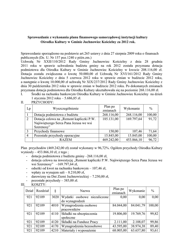 Sprawozdanie z wykonania planu finansowego samorządowej instytucji kultury Ośrodka Kultury w Gminie Juchnowiec Kościelny za 2012 rok. Sprawozdanie sporządzono na podstawie art.265 ustawy z dnia 27 sierpnia 2009 roku o finansach publicznych (Dz. U. Nr 157 poz.1240 z późn.zm.) Uchwałą Nr XXII/110/2012 Rady Gminy Juchnowiec Kościelny z dnia 28 grudnia 2011 roku w sprawie uchwalenia budżetu gminy na rok 2012 została przyznana dotacja podmiotowa dla Ośrodka Kultury w Gminie Juchnowiec Kościelny w kwocie 208.116,00 zł. Dotacja została zwiększona o kwotę 50.000,00 zł Uchwałą Nr XVI/161/2012 Rady Gminy Juchnowiec Kościelny z dnia 5 czerwca 2012 roku w sprawie zmian w budżecie 2012 roku, a następnie o kwotę 10.000,00 zł uchwałą Nr XIX/237/2012 Rady Gminy Juchnowiec Kościelny z dnia 30 października 2012 roku w sprawie zmian w budżecie 2012 roku. Po dokonanych zmianach przyznana dotacja podmiotowa dla Ośrodka Kultury ukształtowała się na poziomie 268.116,00 zł. I. Środki na rachunku bankowym Ośrodka Kultury w Gminie Juchnowiec Kościelny na dzień 1 stycznia 2012 roku – 5.686,85 zł. II. PRZYCHODY: Plan po Lp Wyszczególnienie Wykonanie % zmianach 1 Dotacja podmiotowa z budżetu 268.116,00 268.116,00 100,00 2 Dotacja celowa na „Remont kapliczki P.W. 185.131,00 169.797,64 91,72 Najświętszego Serca Pana Jezusa we wsi Szerenosy” 3 Przychody finansowe 150,00 107,46 71,64 4 Pozostałe przychody operacyjne 15.845,00 15.845,00 100,00 RAZEM 469.242,00 453.866,10 96,72 Plan przychodów (469.242,00 zł) został wykonany w 96,72%. Ogółem przychody Ośrodka Kultury wyniosły – 453.866,10 zł, z tego ; - dotacja podmiotowa z budżetu gminy –268.116,00 zł, - dotacja celowa na inwestycję „Remont kapliczki P.W. Najświętszego Serca Pana Jezusa we wsi Szerenosy” –169.797,64 zł, - odsetki od kwot na rachunku bankowym – 107,46 zł, - wpłaty za wynajem sali – 8.210,00 zł, - darowizny na Dni Ziemi Juchnowieckiej – 7.250,00 zł, - pozostałe przychody – 385,00 zł. III. KOSZTY: Plan po Dział Rozdział § Nazwa Wykonanie % zmianach 921 92109 3020 Wydatki osobowe niezaliczone 0,00 0,00 0,00 do wynagrodzeń 921 92109 4010 Wynagrodzenia osobowe 84.044,00 84.041,79 100,00 pracowników 921 92109 4110 Składki na ubezpieczenia 19.806,00 19.769,76 99,82 społeczne 921 92109 4120 Składki na Fundusz Pracy 2.111,00 2.108,07 99,86 921 92109 4170 Wynagrodzenia bezosobowe 43.595,00 38.974,38 89,40 921 92109 4210 Materiały i wyposażenie 68.005,00 63.657,80 93,61 Dział Rozdział 921 92109 921 921 921 921 921 92109 92109 92109 92109 92109 921 921 921 921 921 921 921 92109 92109 92109 92109 92109 92109 92120 921 92120 921 92120 § Nazwa 4240 Zakup pomocy naukowych i książek 4260 Zakup energii 4270 Zakup usług remontowych 4280 Zakup usług zdrowotnych 4300 Zakup usług pozostałych 4350 Zakup usług dostępu do sieci Internet 4360 Telefonia komórkowa 4370 Telefonia stacjonarna 4410 Podróże służbowe 4430 Różne opłaty i składki 4440 Odpis na ZFŚS 4700 Szkolenia pracowników 6130 Wydatki inwestycyjne pozostałych jednostek 6137 Wydatki inwestycyjne pozostałych jednostek 6139 Wydatki inwestycyjne pozostałych jednostek OGÓŁEM Plan po Wykonanie % zmianach 745,00 745,00 100,00 28.187,00 856,00 310,00 32.808,00 2.546,00 19.269,59 68,36 776,79 90,75 310,00 100,00 29.529,78 90,01 2.145,07 84,25 972,00 1.300,00 0,00 1.560,00 2.552,00 400,00 62.737,00 913,48 93,98 829,45 63,80 0,00 0,00 1.530,00 98,08 2.551,77 99,99 400,00 100,00 47.981,95 76,48 74.973,00 74.521,74 99,40 47.421,00 47.293,95 99,73 474.928,00 437.350,37 92,09 Plan – 474.928,00 zł, wykonanie – 437.350,37 zł (92,09 %), z tego wydatkowano na: - wynagrodzenia pracowników – 84.041,79 zł, - składki ZUS i na Fundusz Pracy – 21.877,83 zł, - wynagrodzenia bezosobowe (prowadzenie świetlicy w Koplanach, obsługa informatyczna, warsztaty plastyczne i animacyjne dla dzieci i młodzieży, sprzątanie pomieszczeń OK. i świetlicy w Kleosinie, warsztaty teatralne i taneczne oraz inne umowy związane z obsługą imprez organizowanych przez Ośrodek Kultury) – 38.974,38 zł, - zakup materiałów i wyposażenia (olej opałowy, stoły i krzesła do świetlicy w Kleosinie, pulpity do krzeseł na Sali widowiskowej OK., nagrody dla uczestników konkursów organizowanych przez OK., tusze i tonery do drukarek, laptop oraz licencje programów komputerowych na potrzeby prowadzenia księgowości w OK., Pakiet MSOffice 2013 na 5 stanowisk komputerowych, urządzenie wielofunkcyjne, środki czystości, artykuły biurowe, spożywcze i przemysłowe do prowadzenia świetlic i innych organizowanych imprez oraz artykuły na potrzeby bieżącej działalność OK) – 63.657,80 zł, - zakup energii elektrycznej i wody – 19.269,59 zł (wykonanie planu 68,36% wynika z nieotrzymania wszystkich faktur dotyczących 2012 roku do dnia 31-12-2012 – faktury opłacone zostały w styczniu 2013 roku), - remont sceny w Sali widowiskowej OK. – 776,79 zł, - zakup usług zdrowotnych (wstępne i okresowe badania lekarskie) – 310,00 zł, - zakupy usług pozostałych (prowizje bankowe, opłaty za Home Banking, abonament RTV, przedłużenie okresu rejestracji domeny internetowej, przesyłki pocztowe, usługi w zakresie BHP, usługi serwisowe i transportowe, serwis oprogramowania komputerowego, opłaty za odprowadzanie ścieków, opłaty za korzystanie z samochodów gminnych, ochrona budynku WOKiS w Koplanach, zajęcia aerobiku, nagłośnienie i występy artystyczne podczas festynów gminnych, wynajem kabin sanitarnych na festynach gminnych, zabezpieczenie imprezy podczas Dni Ziemi Juchnowieckiej, usługa cateringowa) – 29.529,78 zł, - opłaty za Internet oraz rozmowy telefoniczne – 3.888,00 zł (wykonanie planu 63,80% wynika z nieotrzymania wszystkich faktur dotyczących 2012 roku do dnia 31-12-2012 – faktury opłacone zostały w styczniu 2013 roku), - szkolenia pracowników – 400,00 zł, ubezpieczenia majątkowe 